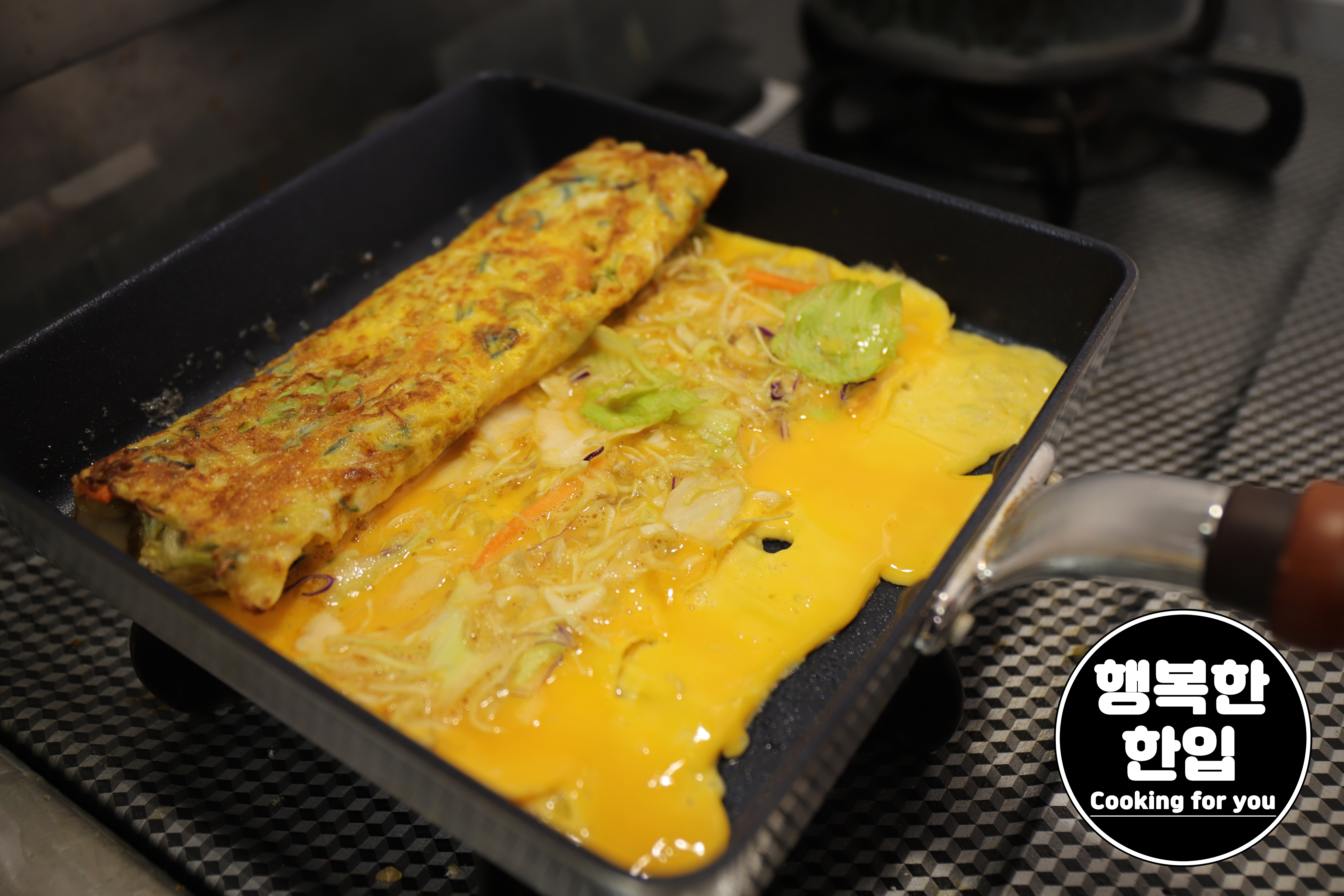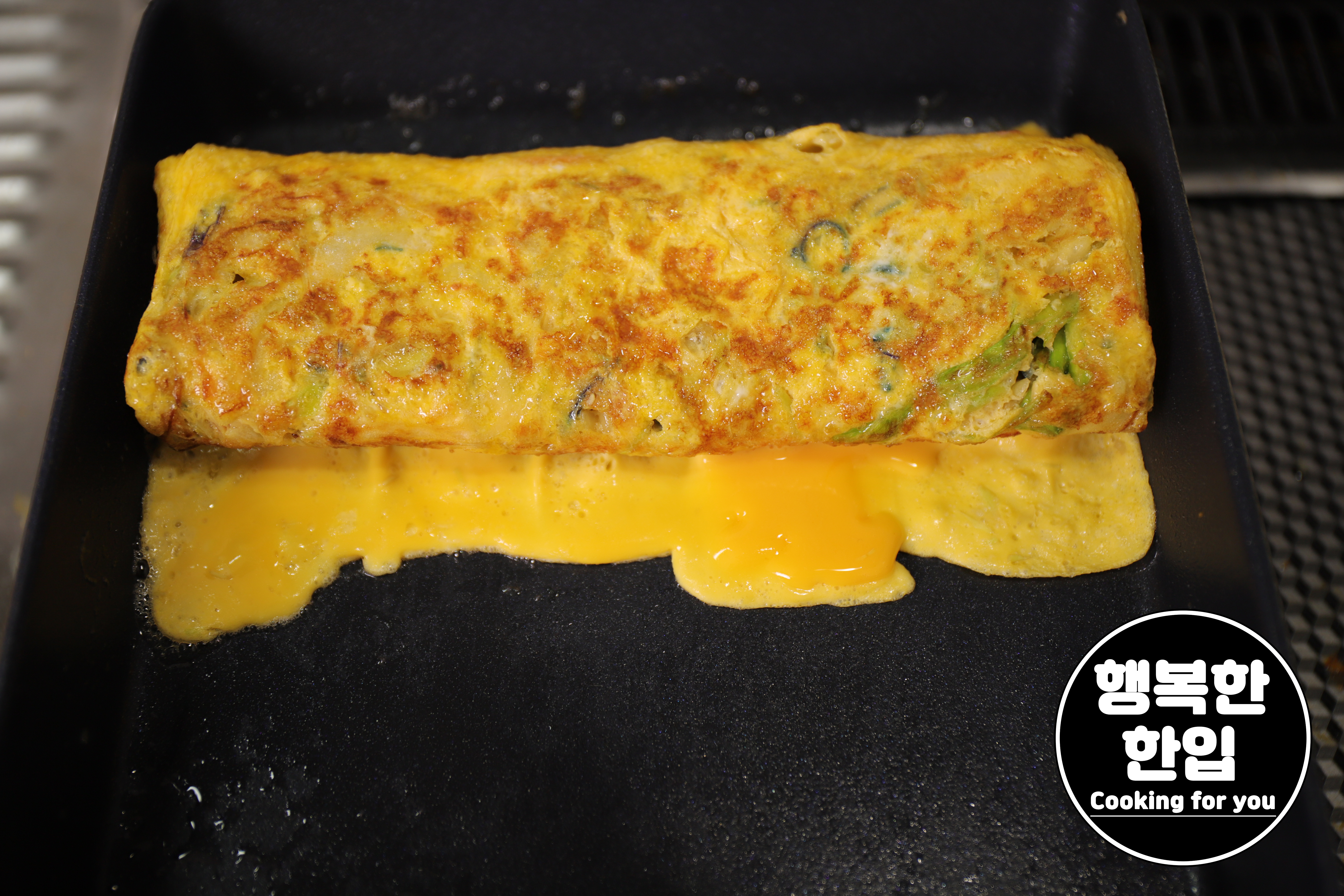 한번 말아서 위로 올려주고 다시 계란물과 샐러드믹스를 넣어 주는 일을 반복해 가며 잘 구워주세요.