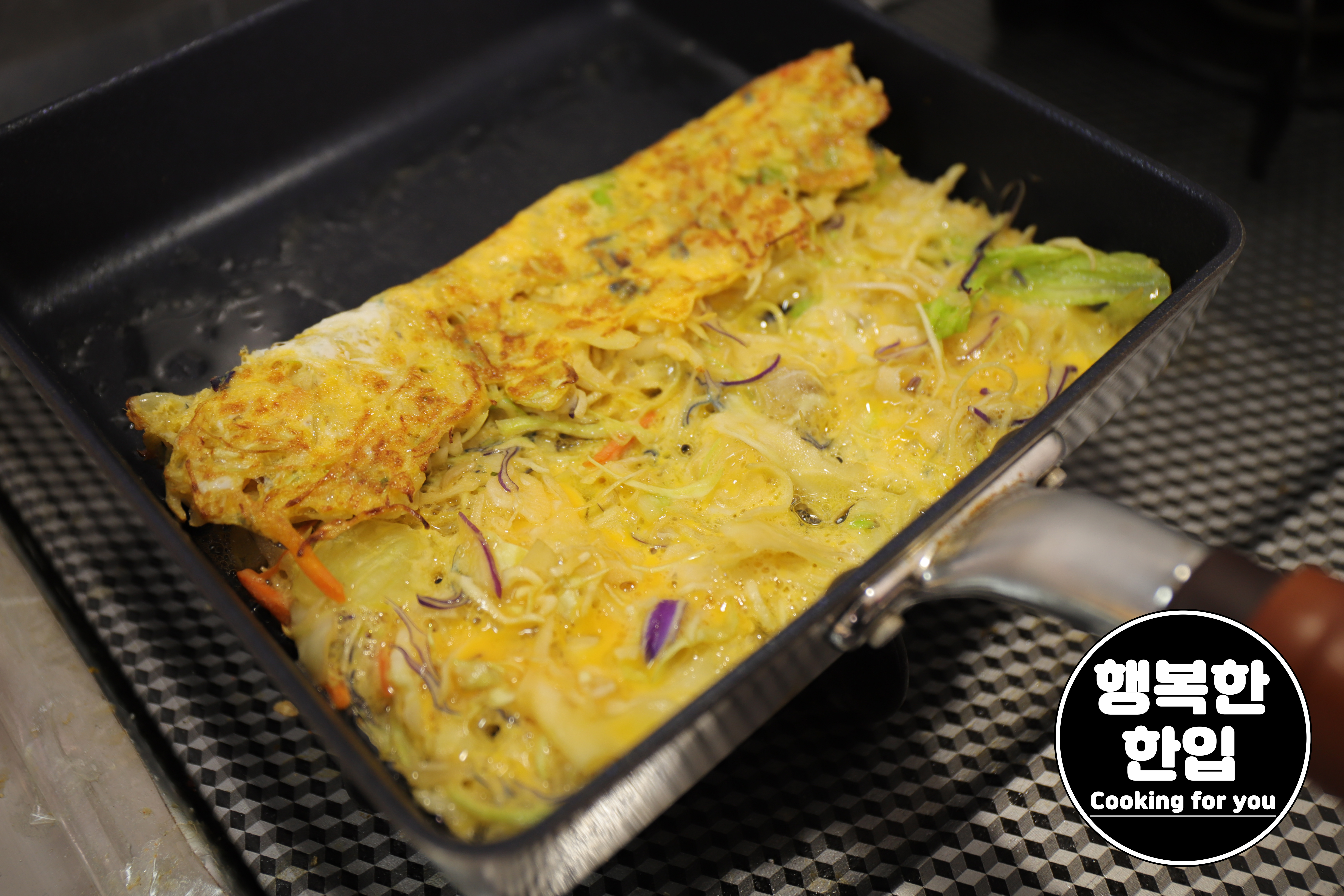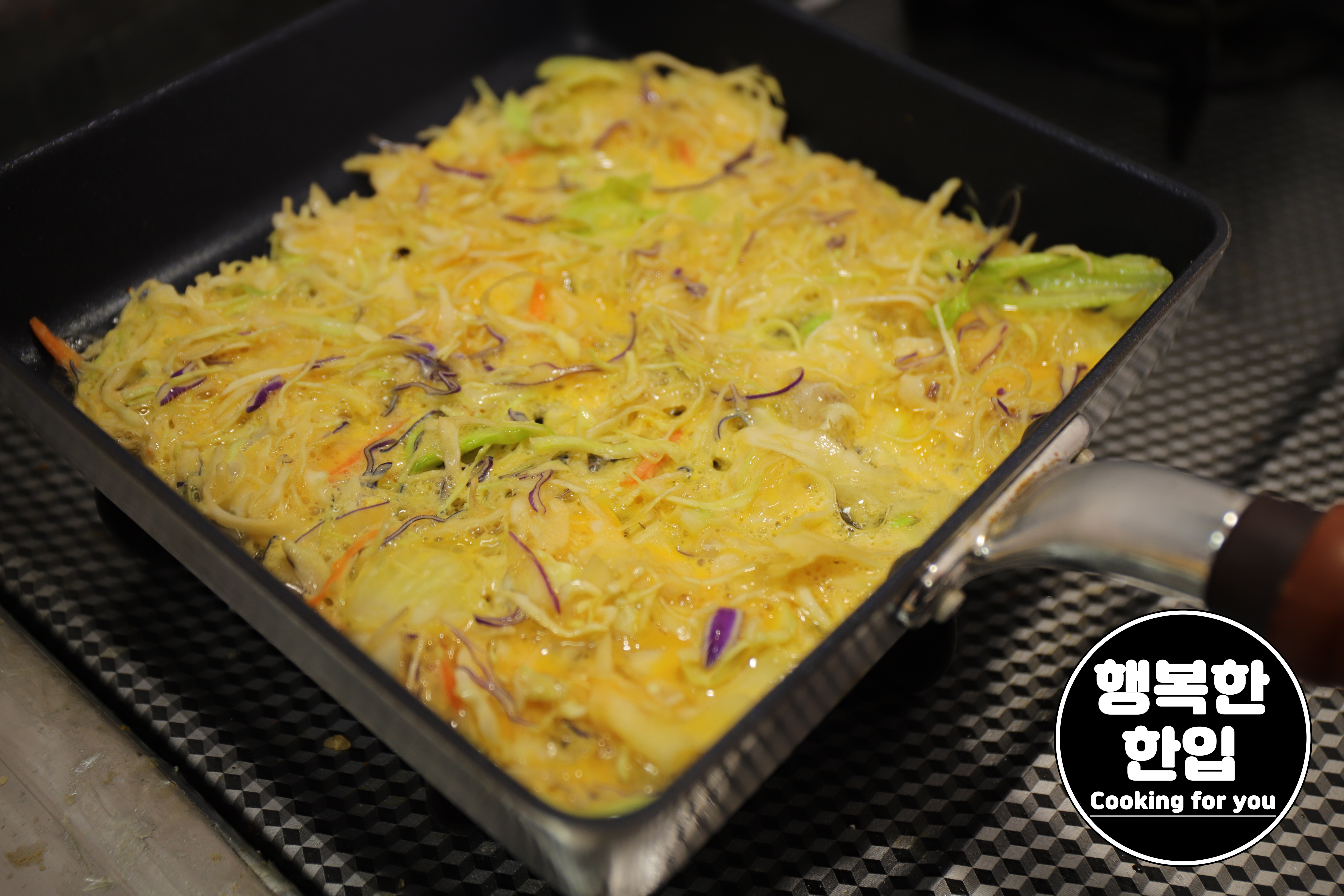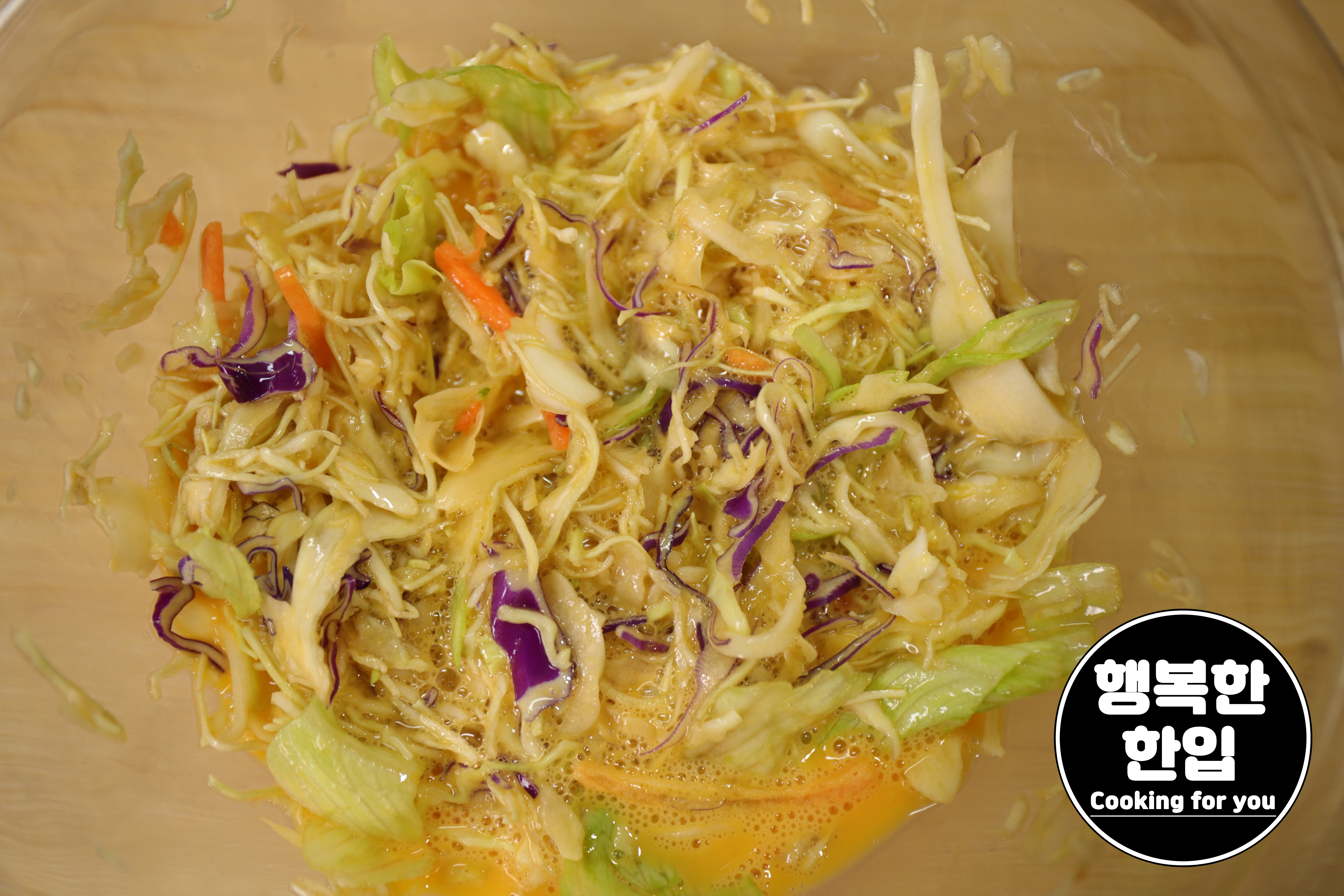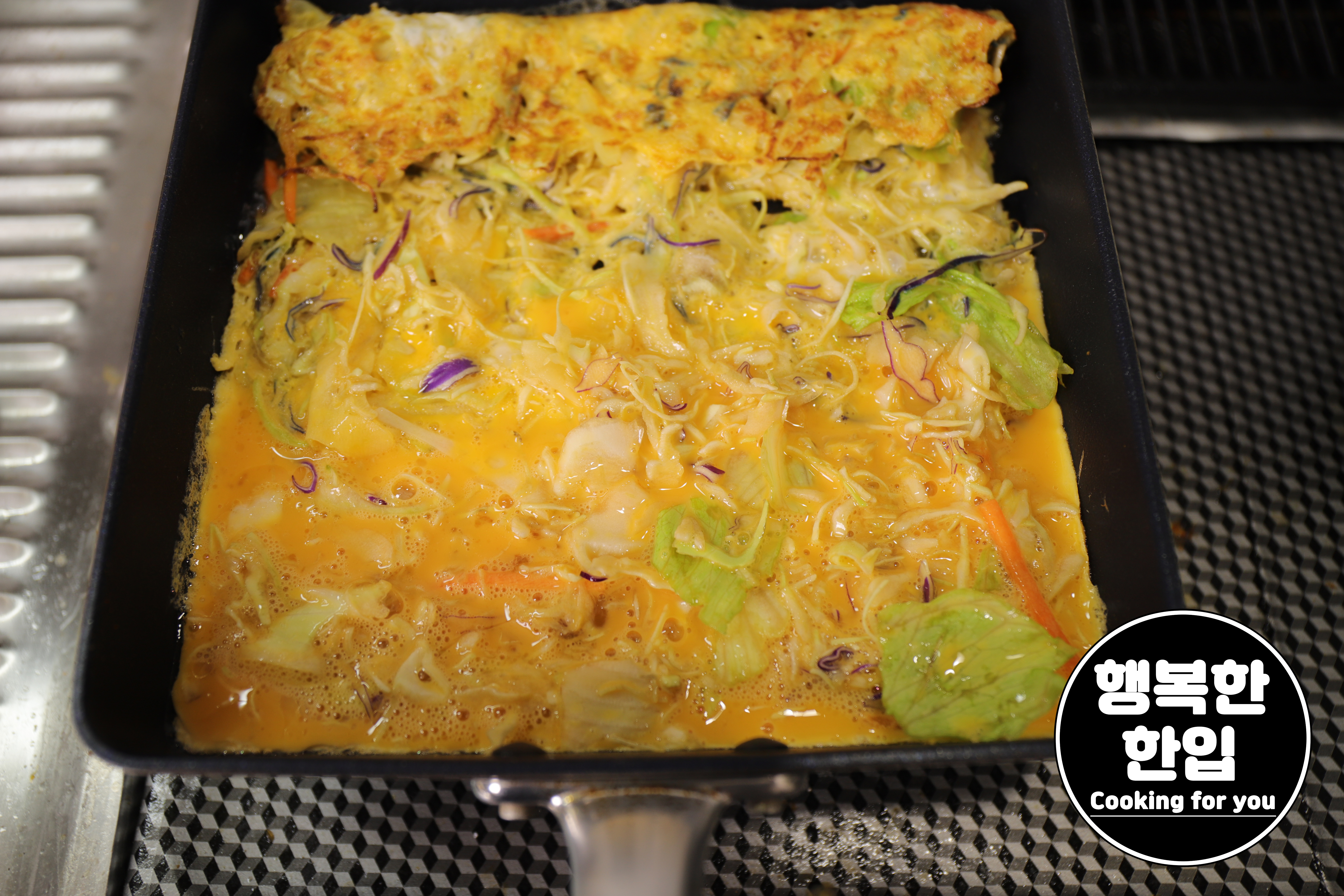 샐러드믹스를 젓가락으로 옮기고 나중에 계란물을 조금씩 부어주는것도 좋은 방법 중 하나입니다.
