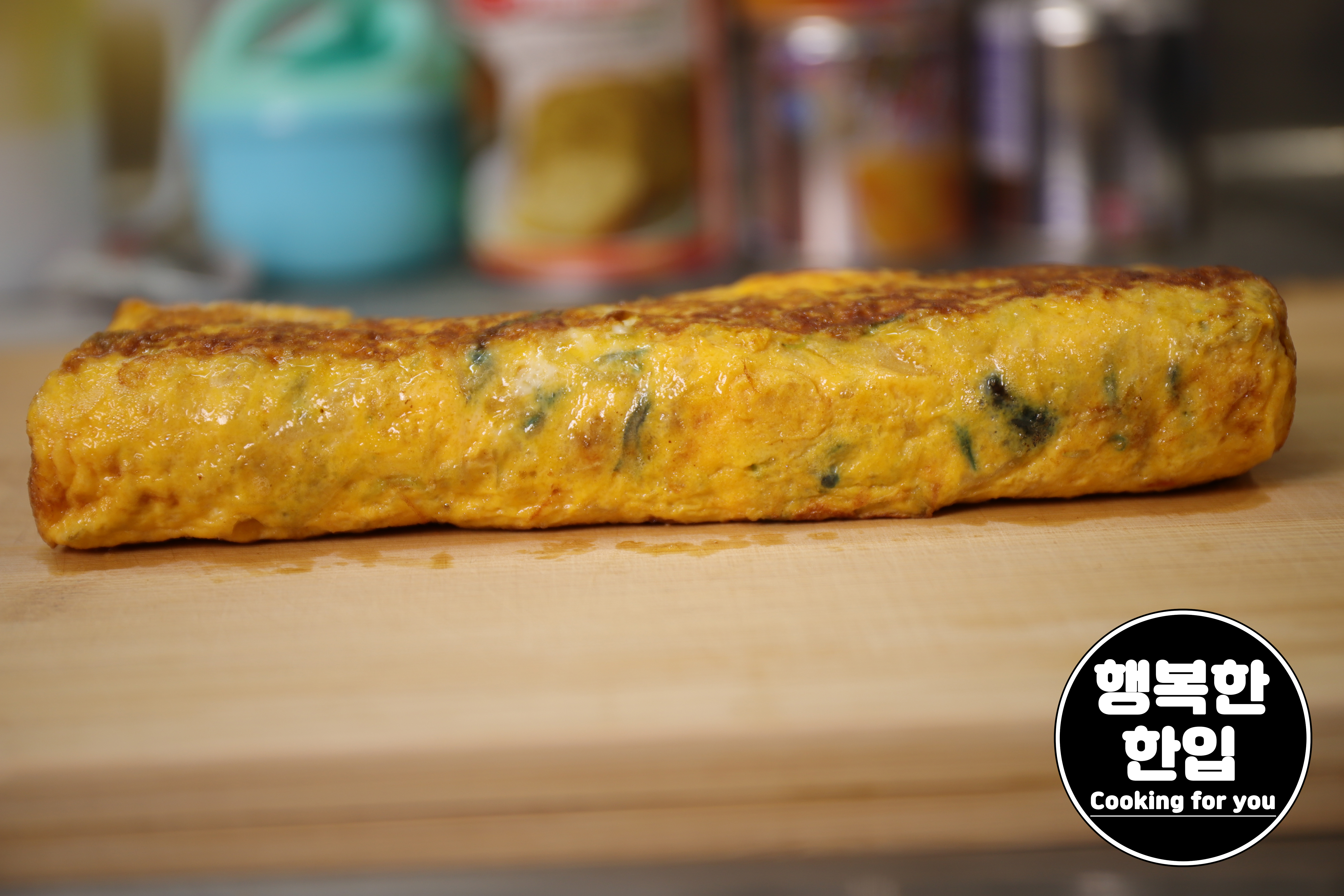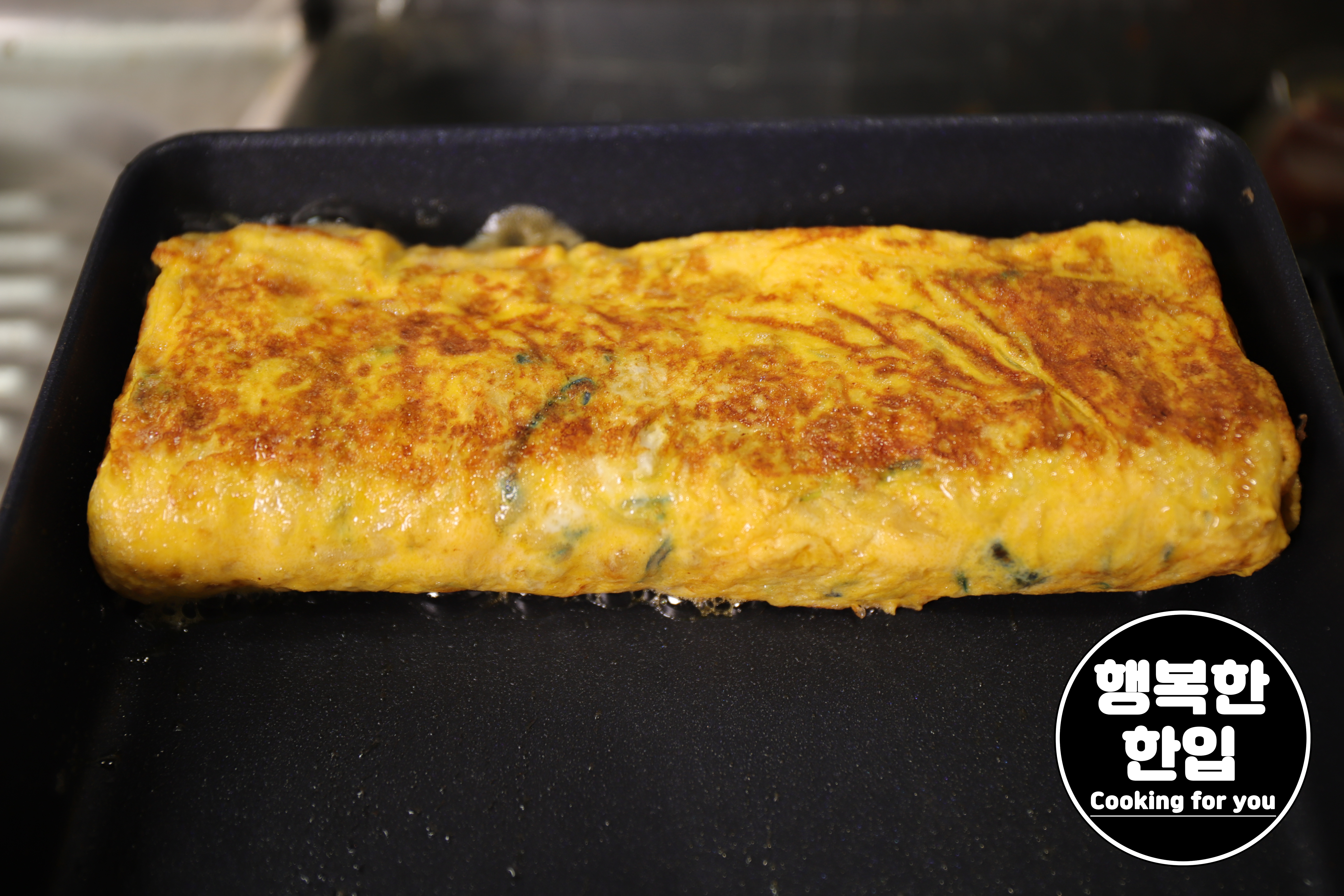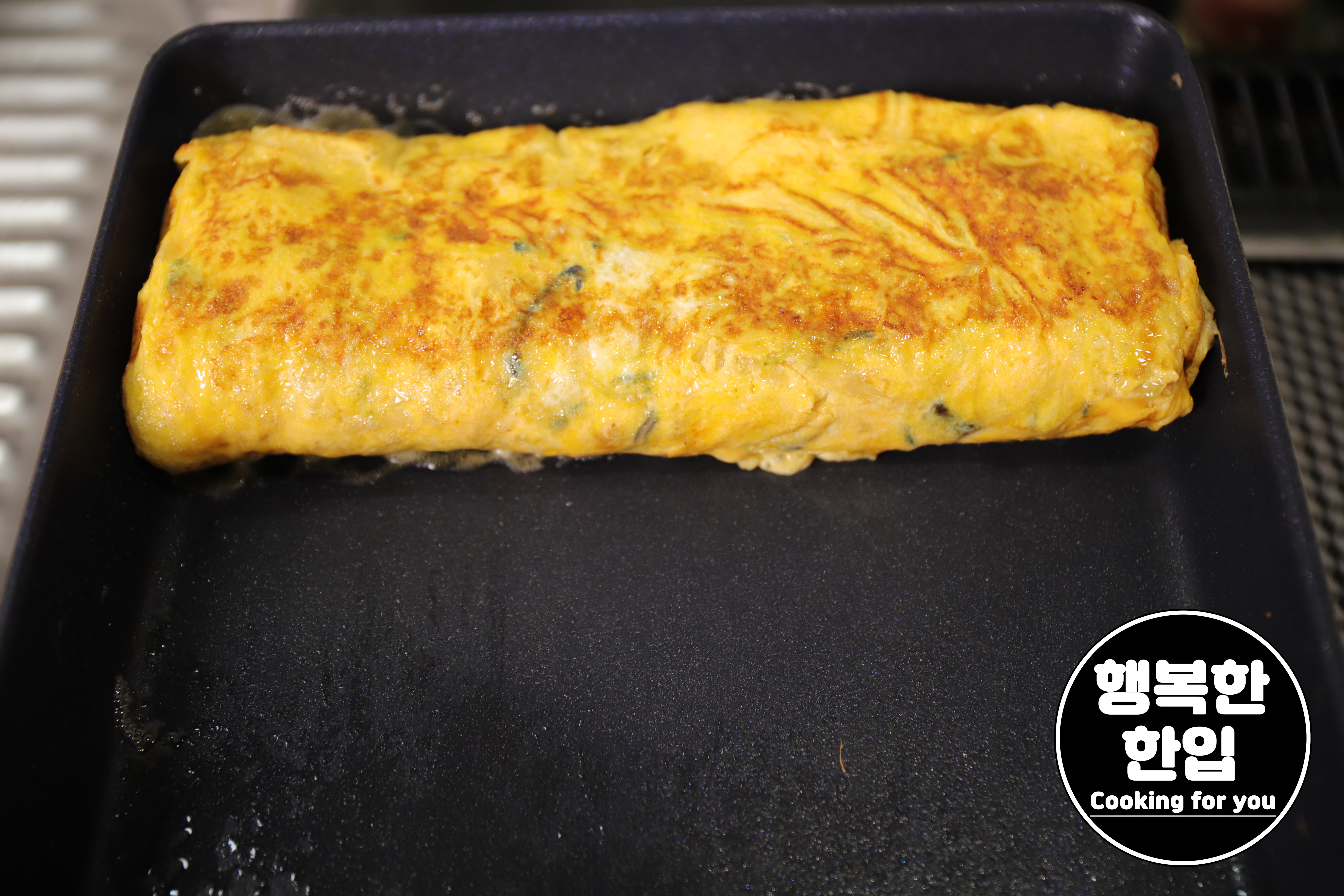 다 말아진 계란말이는 잘 깨지지 않도록 겉부분이 조금 단단해질때까지 약불에서 노르스름하게 구워주세요.