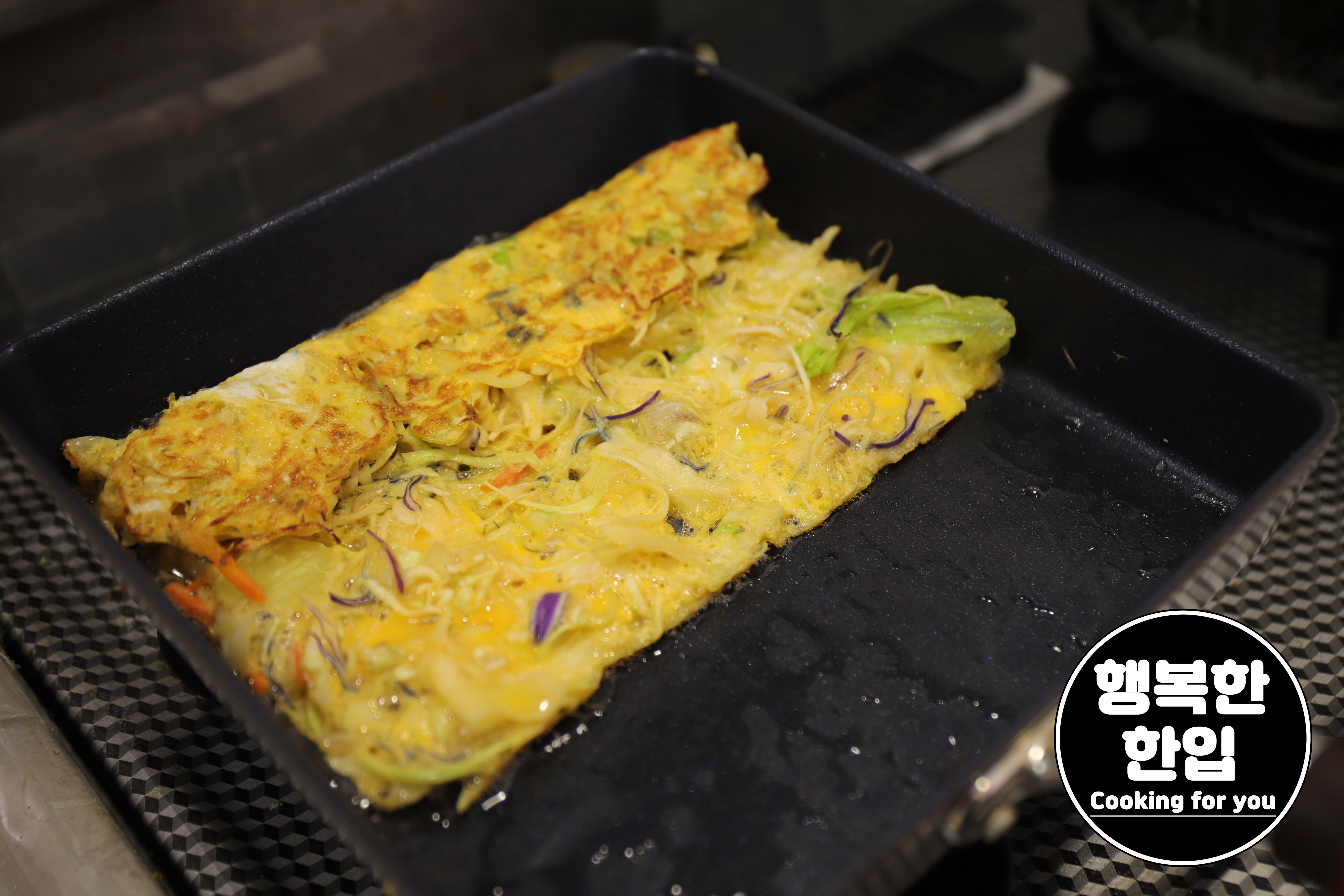 달구어진 프라이팬에 식용유를 전체적으로 둘러주고 준비한 재료를 조금씩 부어가며 평평하게 펴줍니다.