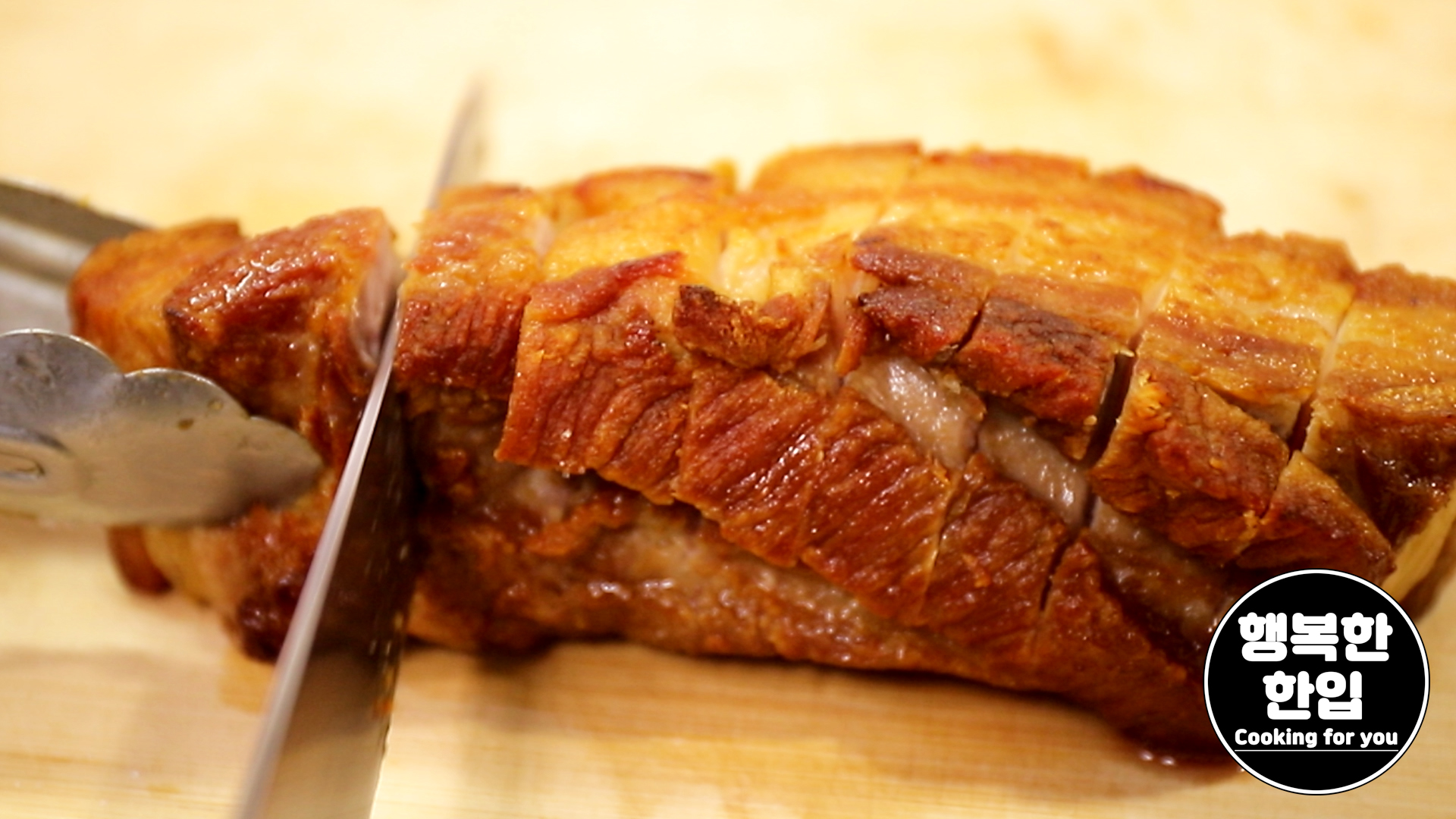 전체적으로 노릇노릇 구워지면 통삼겹살의 2/3정도만 칼집을 내어줍니다.