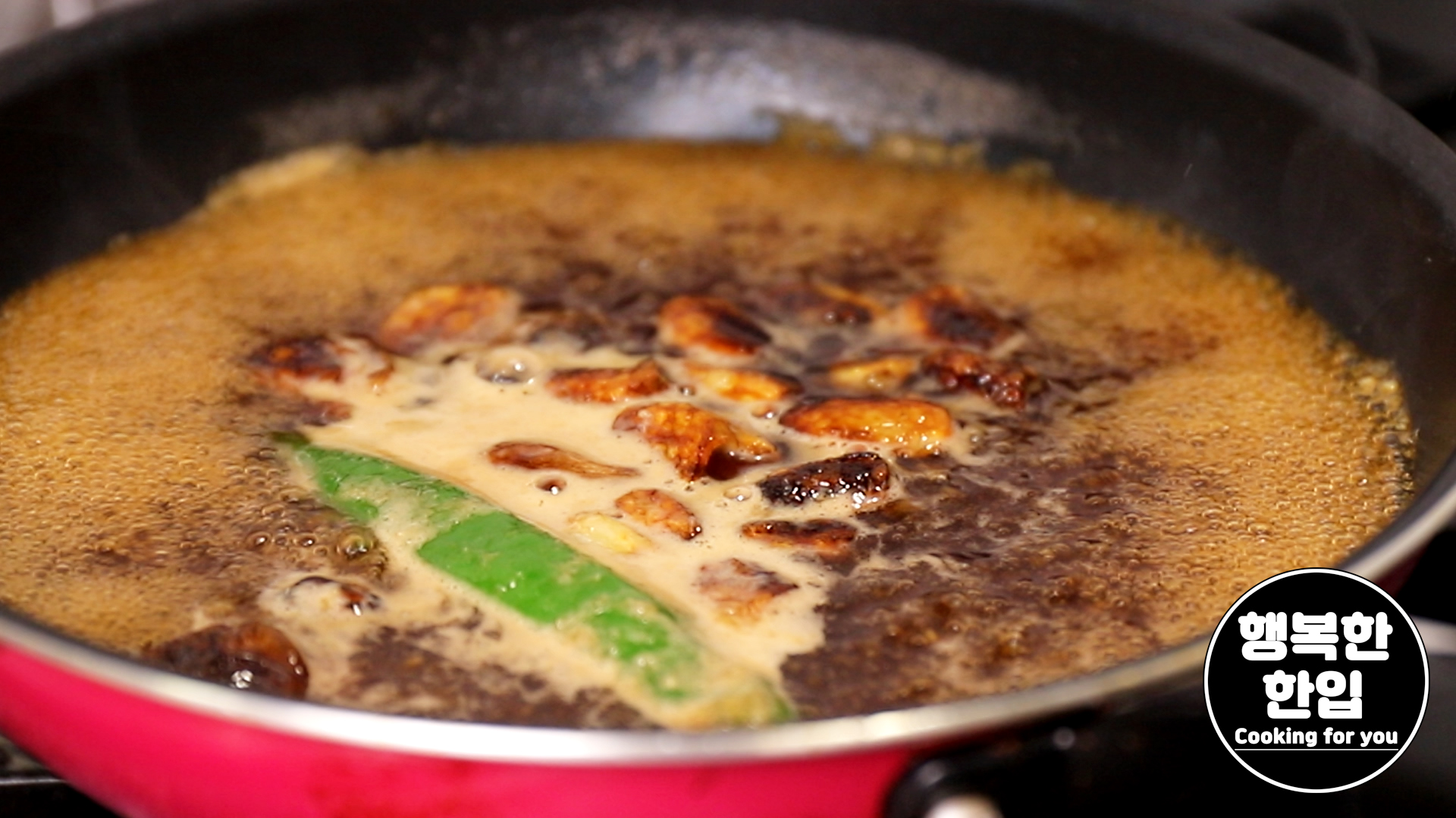 깨끗한 프라이팬에 물 200ml, 매운고추 1개, 구운 통마늘과 양념소스를 부어 끓여주세요.