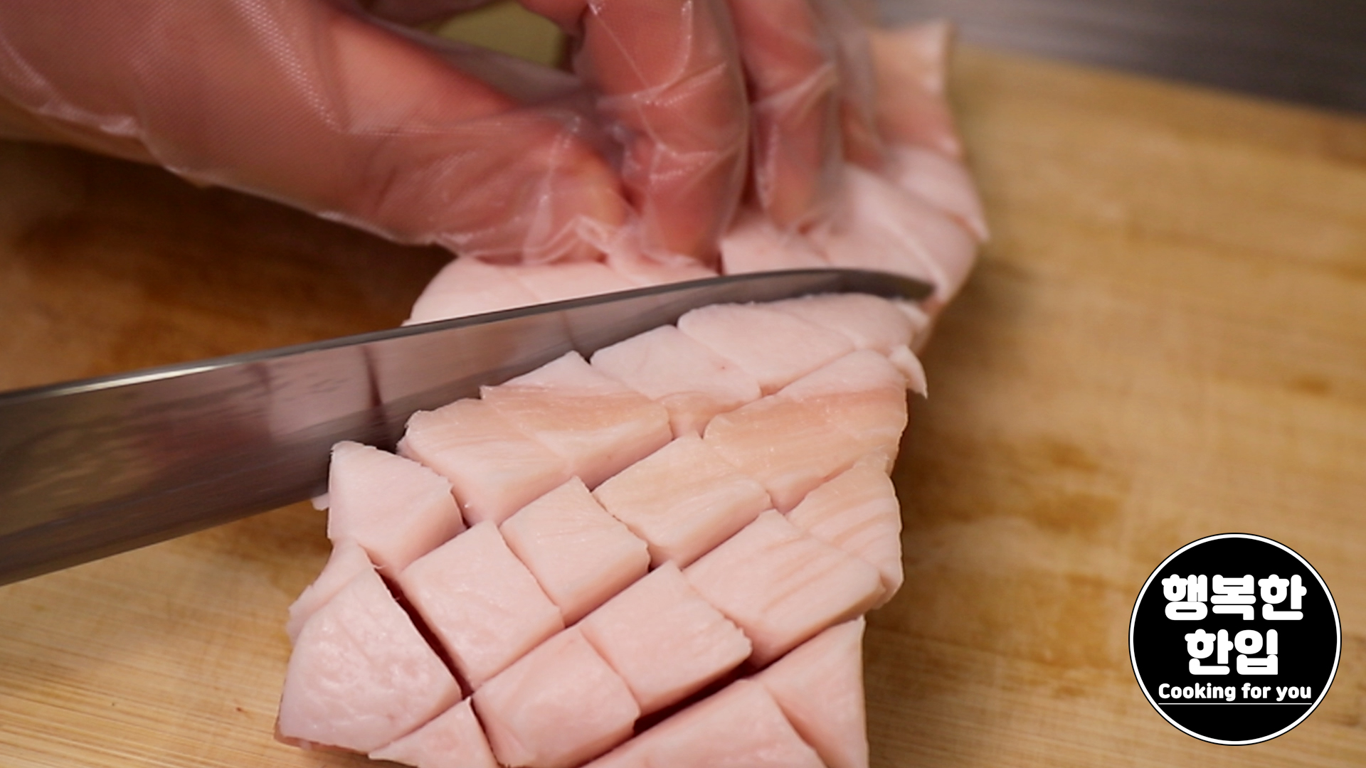 통삼겹살의 지방 부분에 칼집을 내어줍니다.