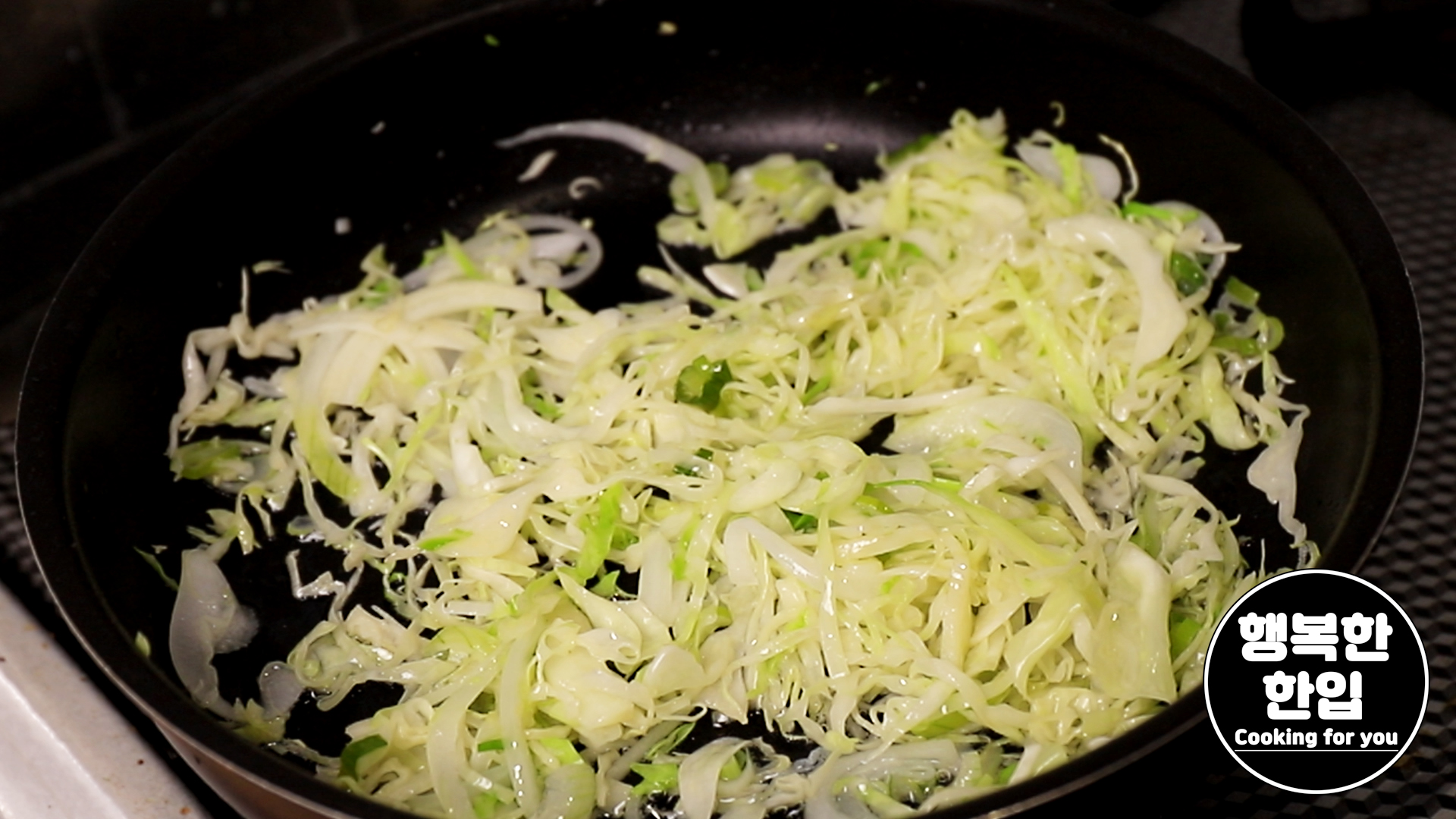 양파에 윤기가 생기면 양배추를 크게 한줌 정도 넣고 함께 볶아주세요.