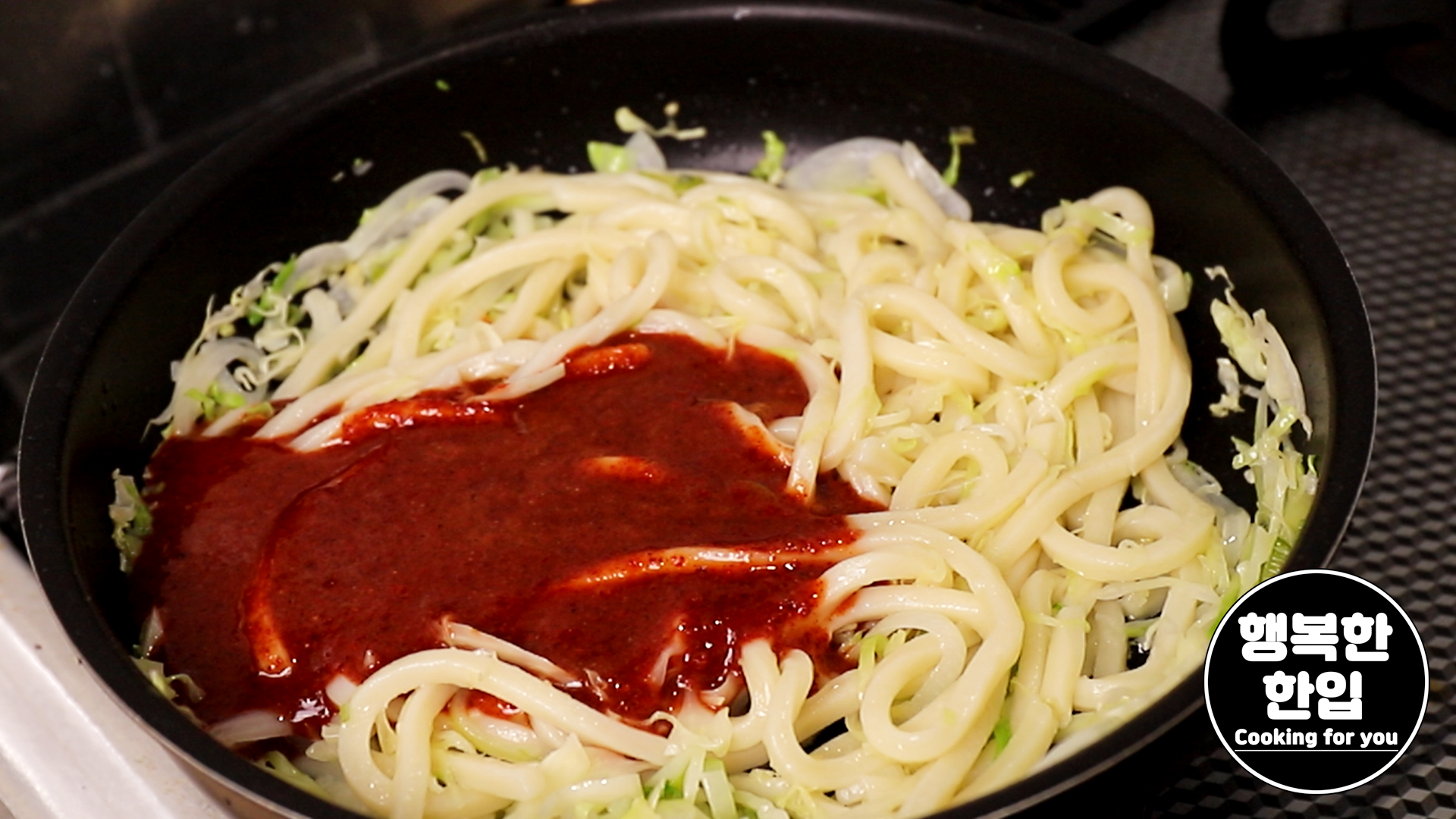 가스불을 약하게 줄이고 우동면을 양념에 골고루 섞어주세요.