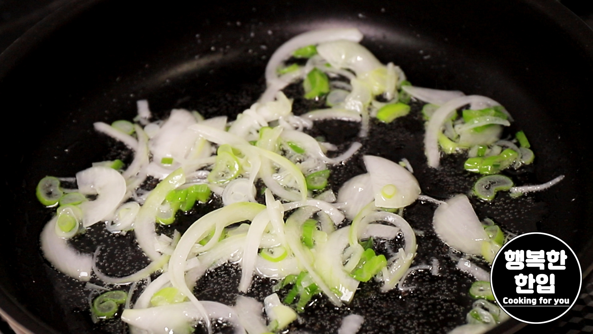프라이팬에 식용유를 적당히 두른 후 대파 2스푼과 양파 1/4개를 넣고 볶아주세요.