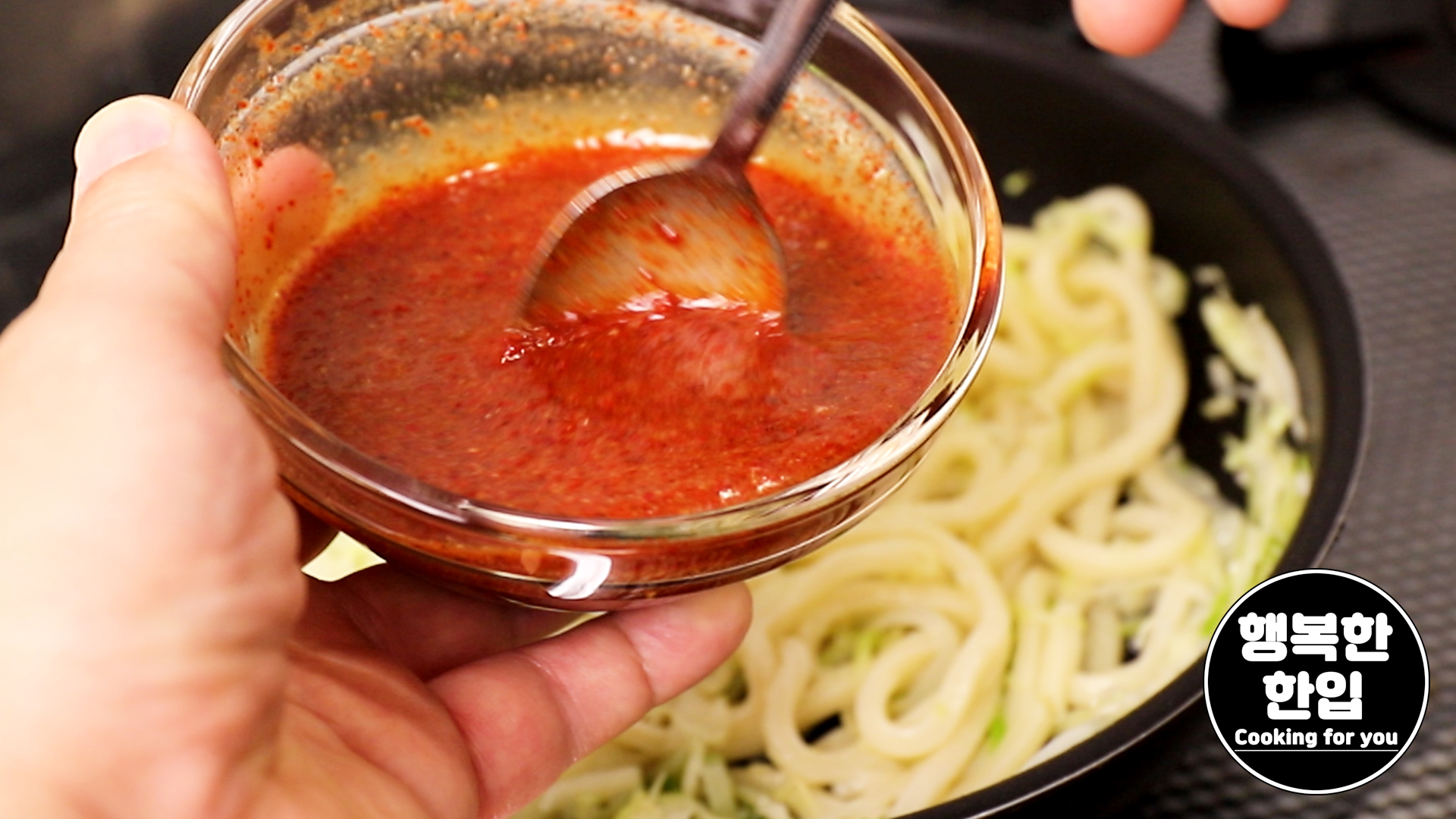 우동면이 풀리면 준비해둔 양념장을 다시 한번 섞어준 후 우동면 위에 부어주세요.