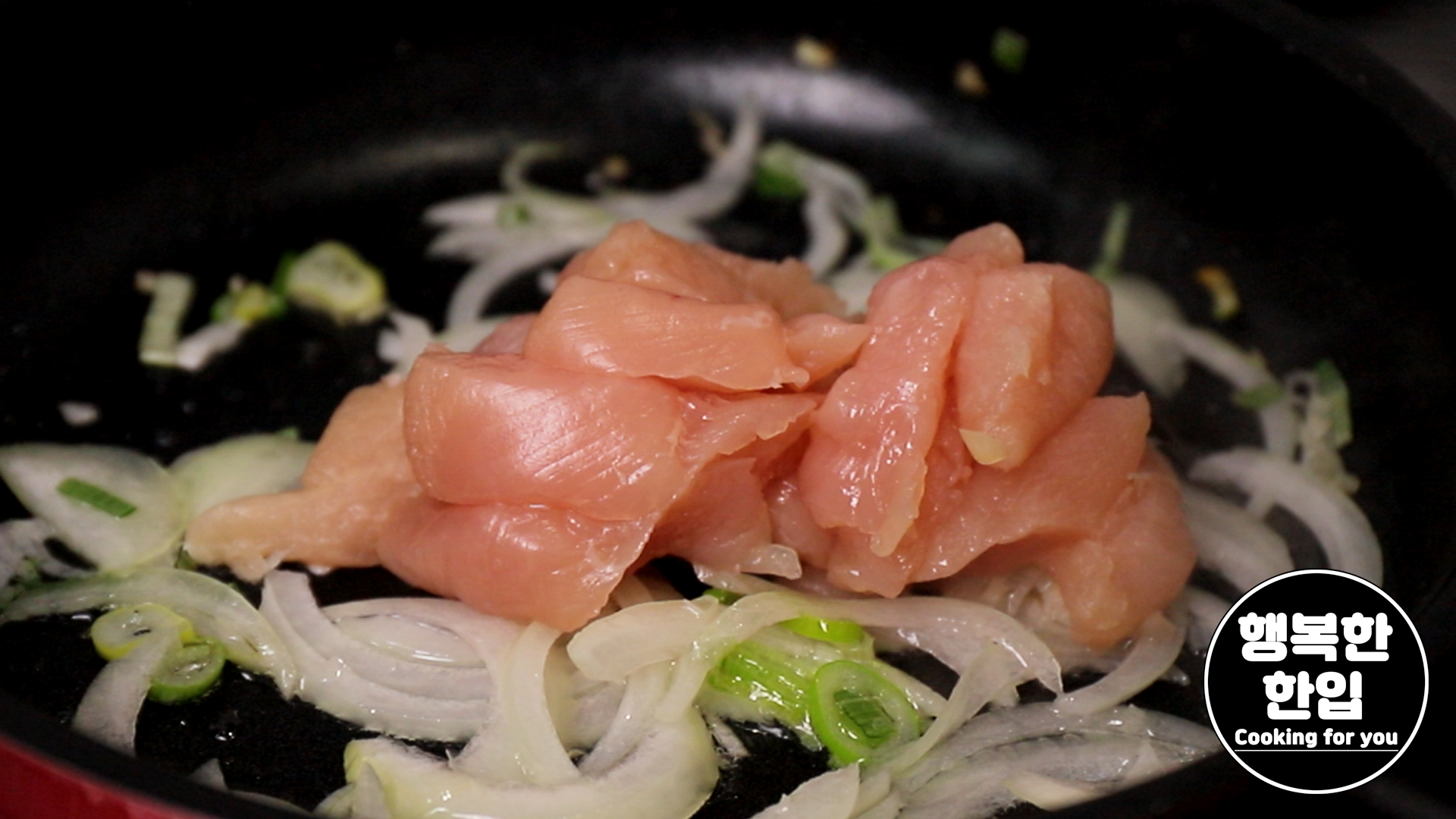 양파가 투명하게 윤기가 날즈음 손질한 닭안심을 넣고 볶아주세요.