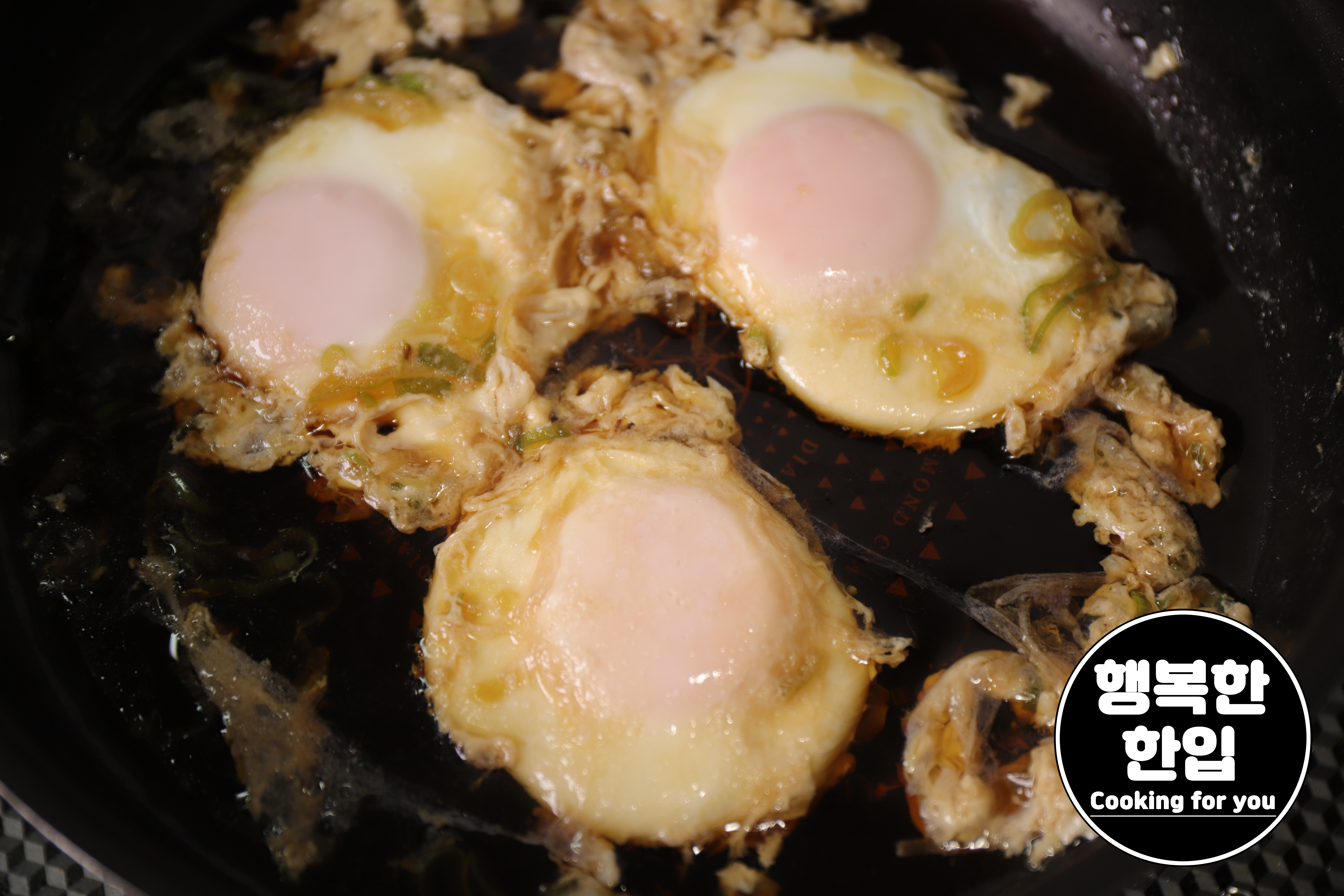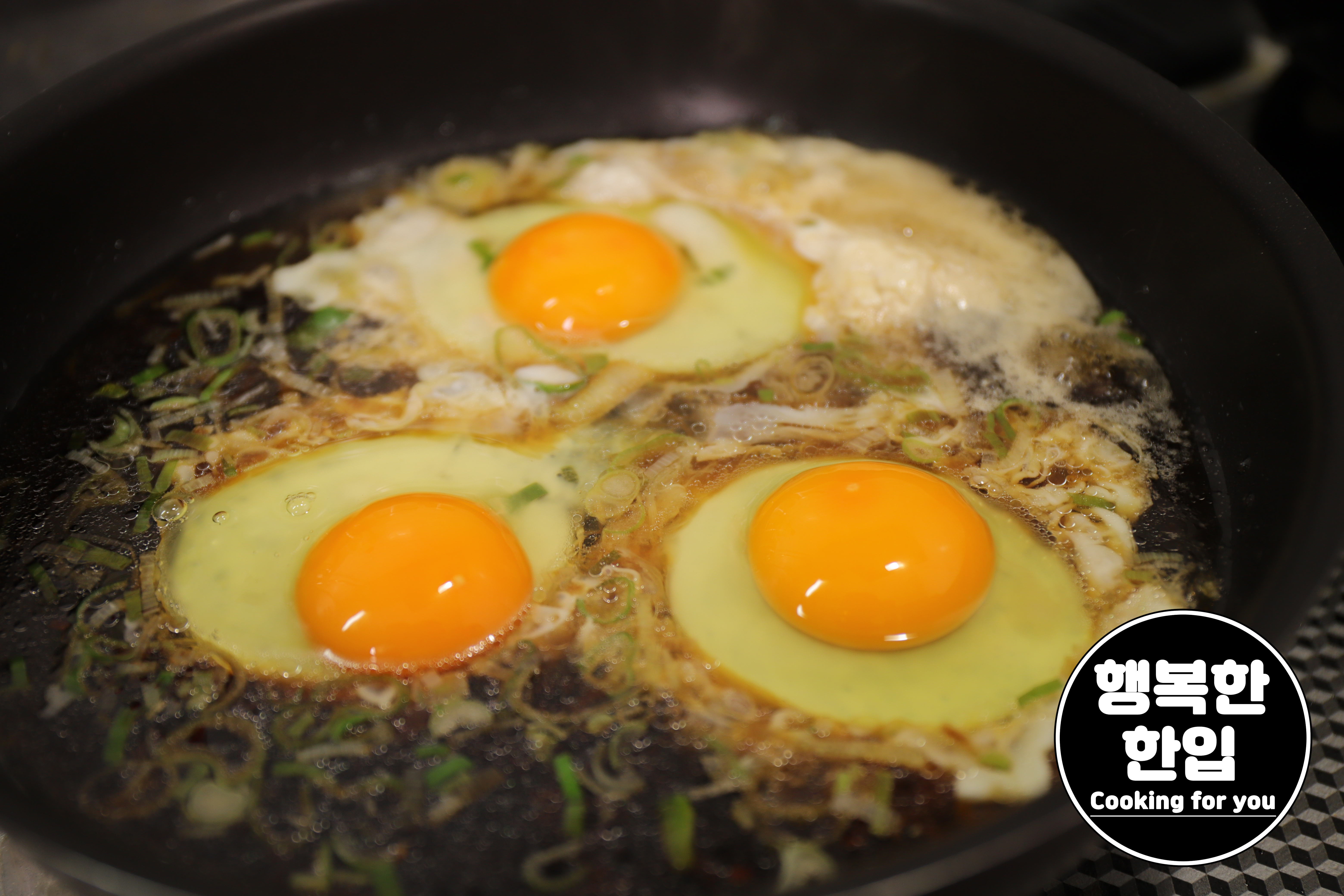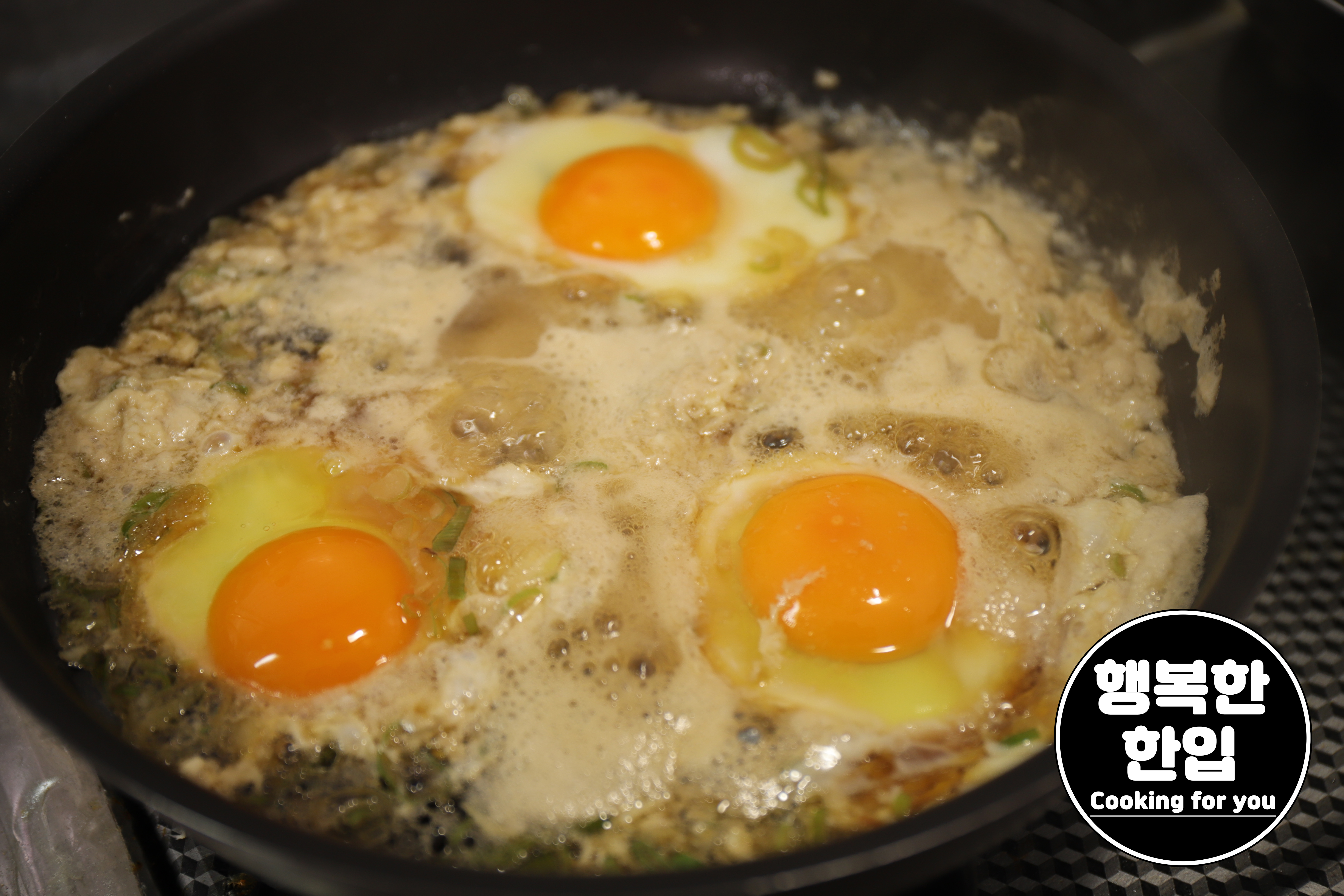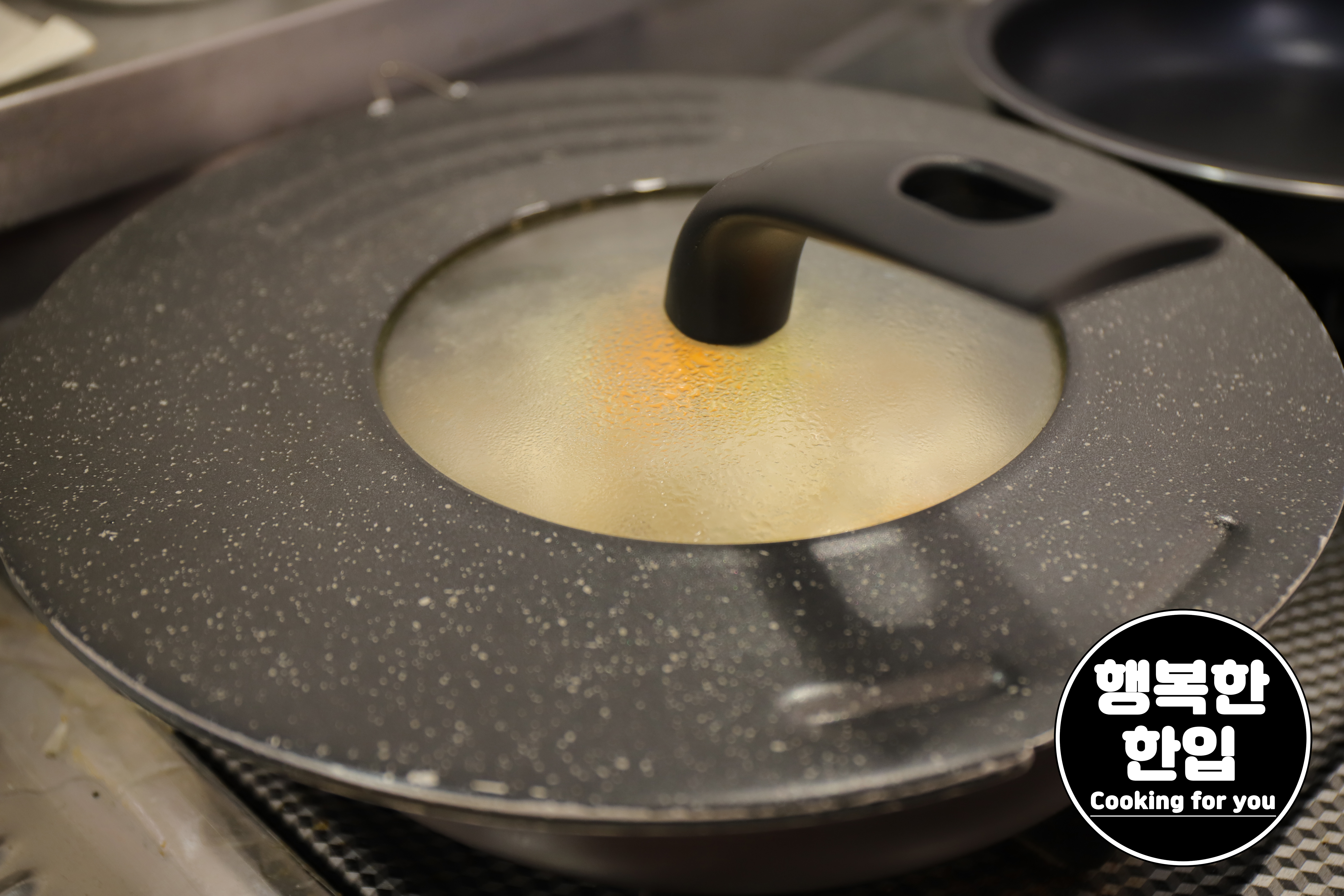 대략 1분정도 익히면 계란 위에 하얀 막이 생깁니다.