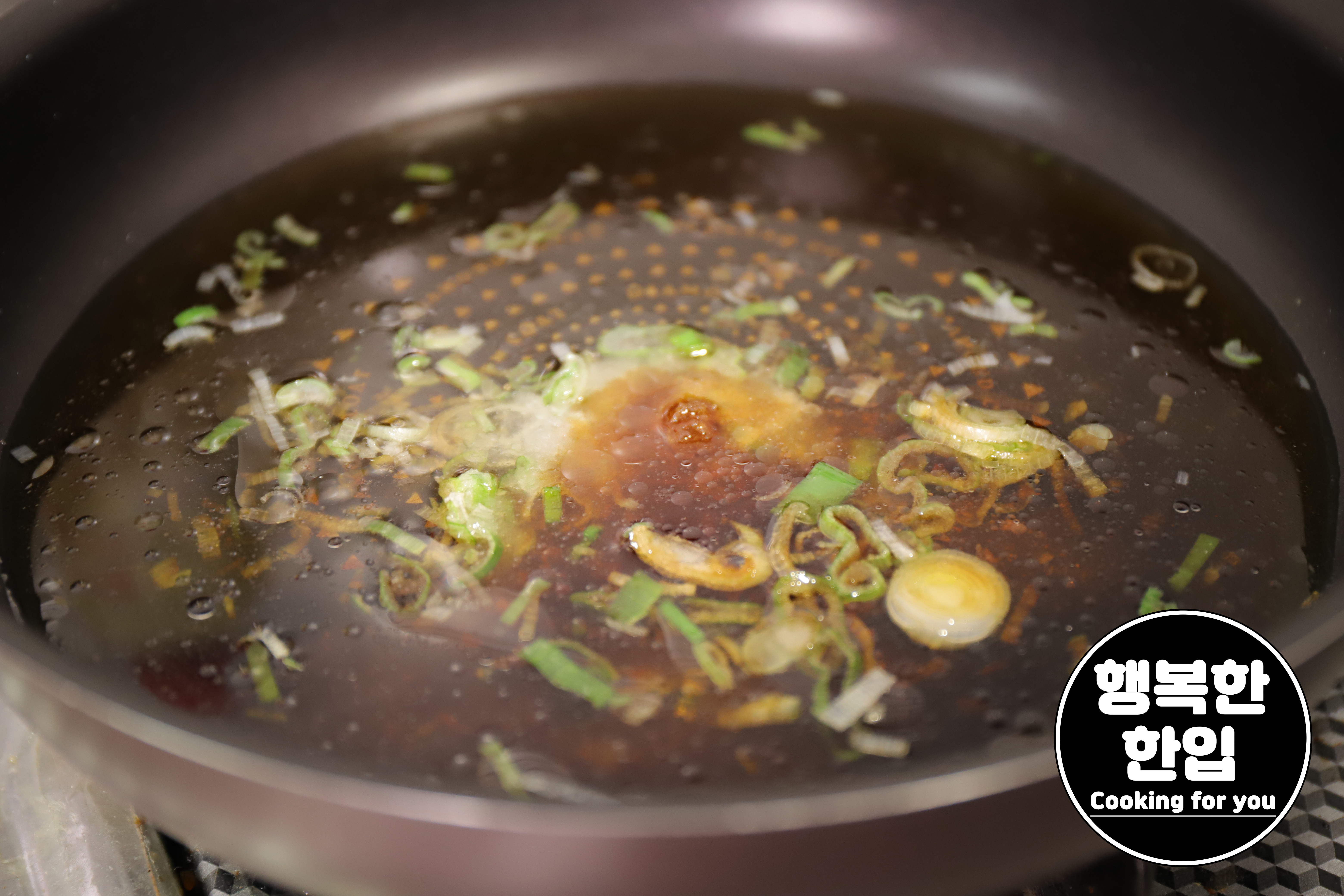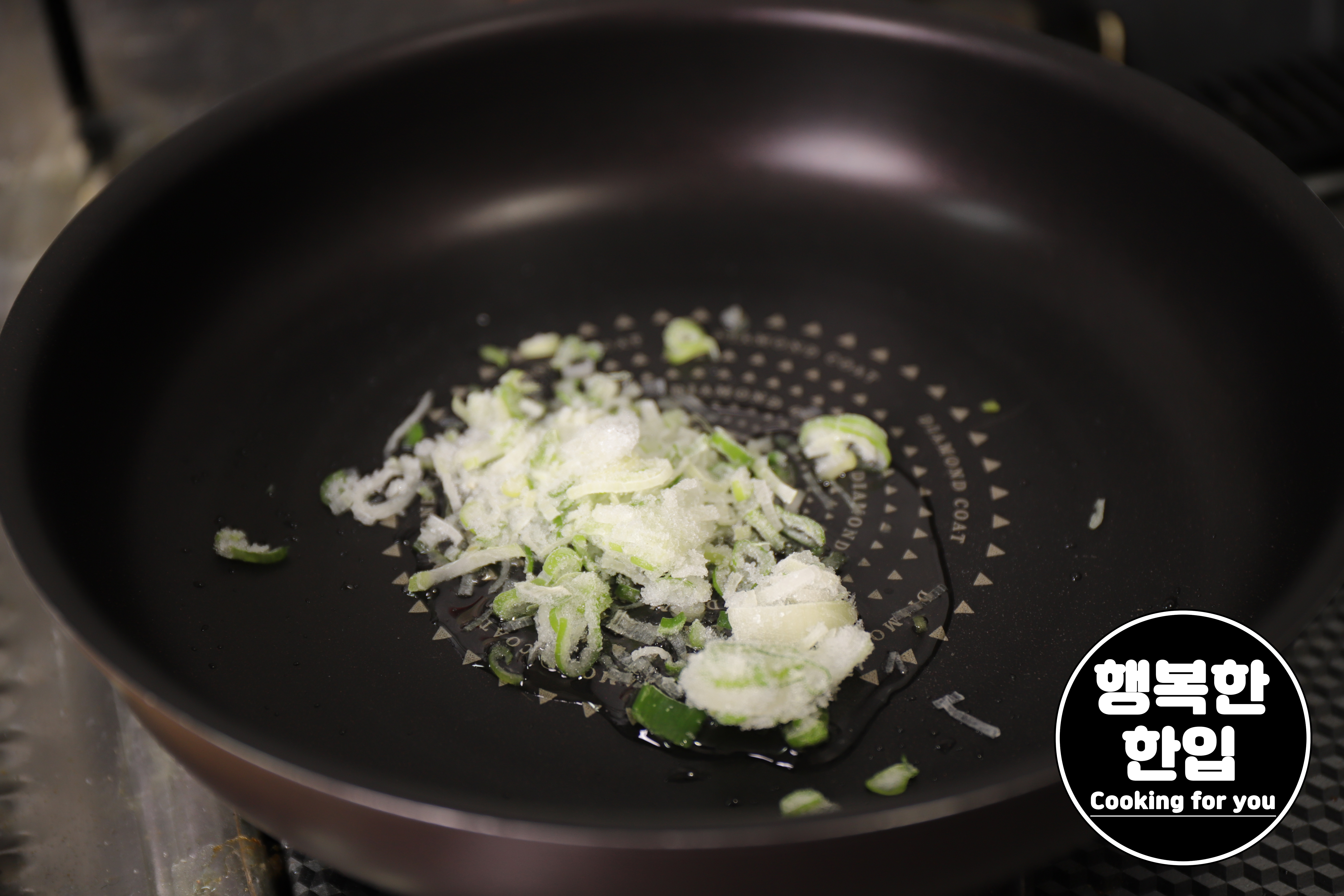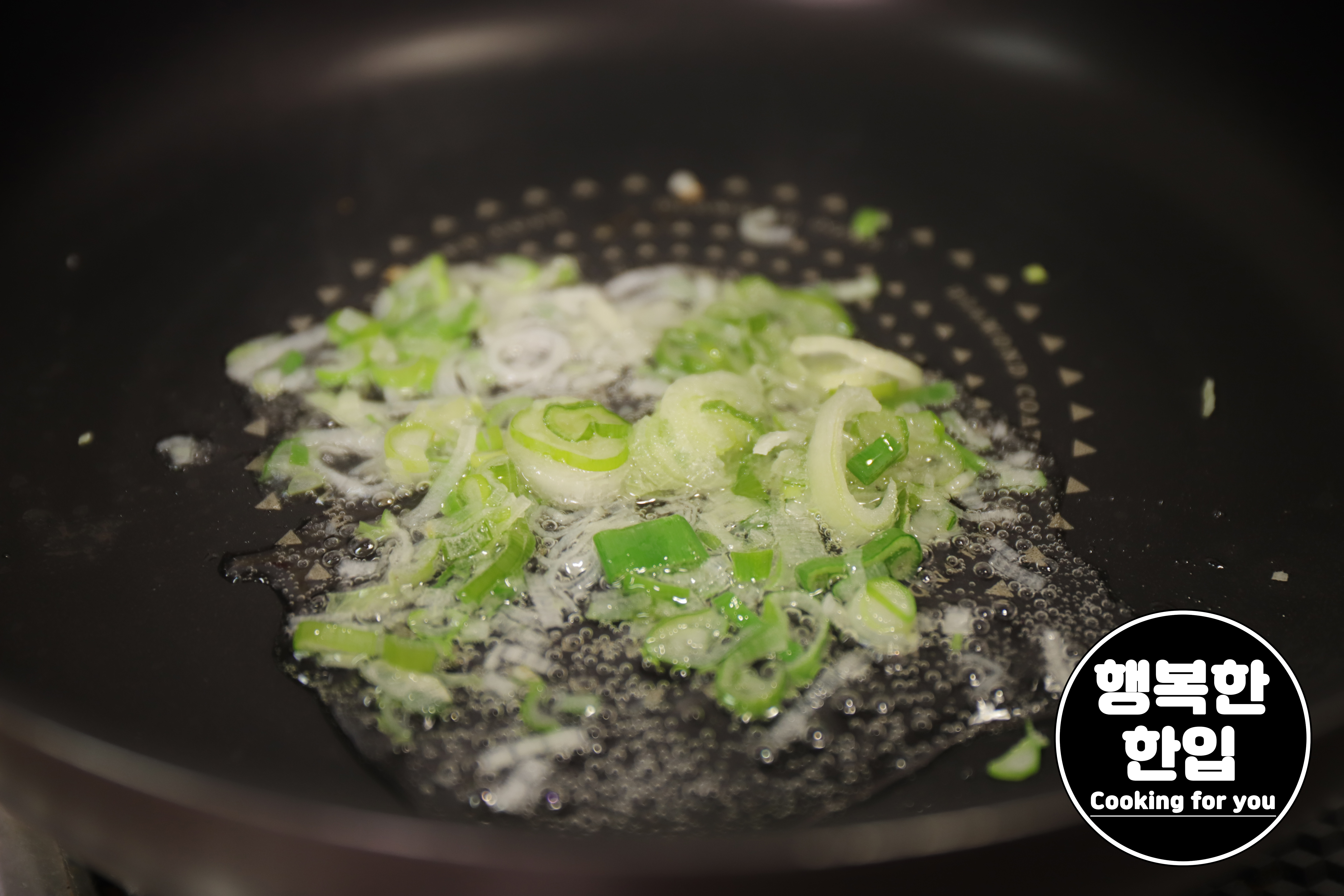 프라이팬에 식용유를 적당히 두르고 대파 한줌 넣고 볶아가며 파기름을 내주세요.