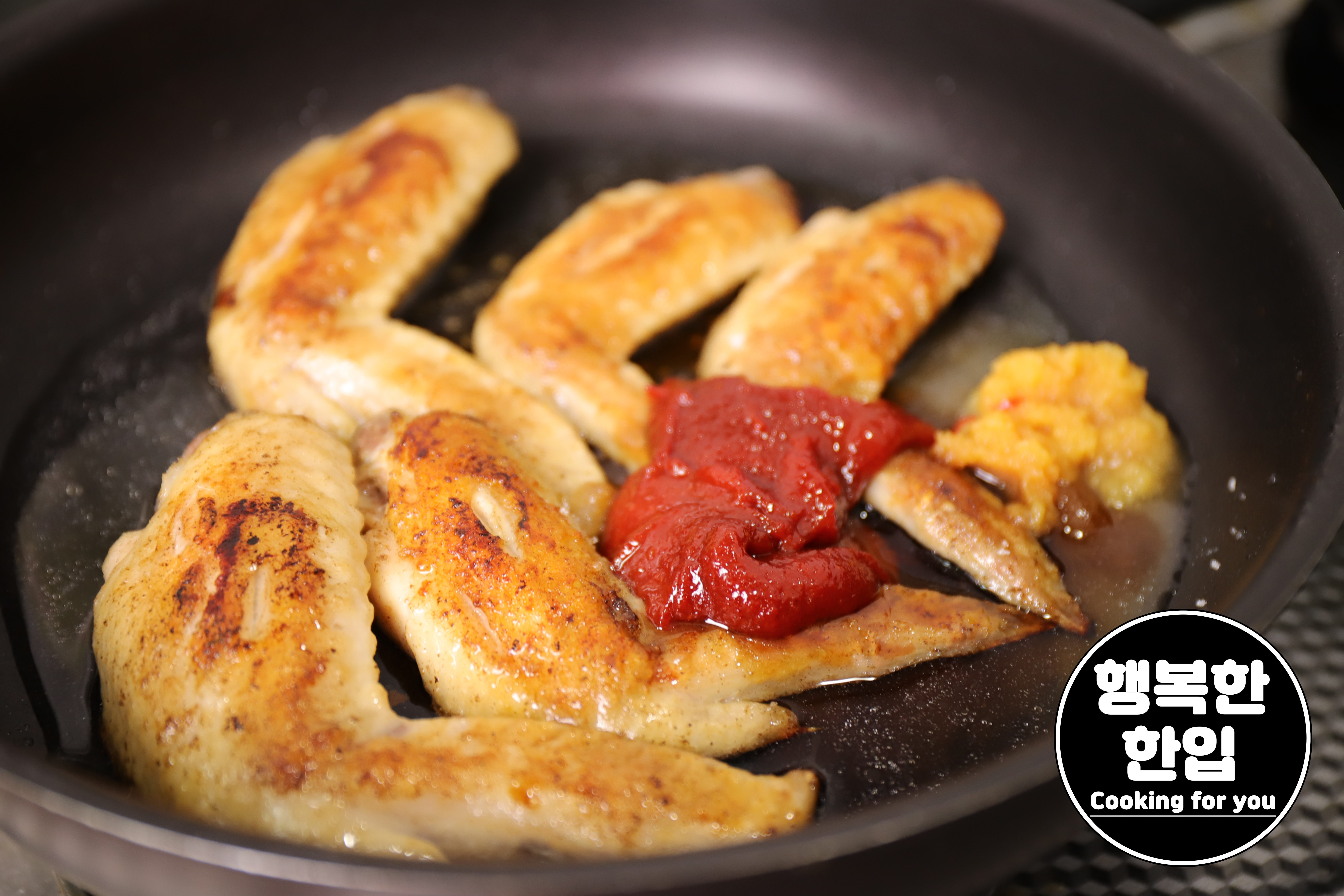 닭날개가 앞뒤로 골고루 잘 구워지면 고추장 1스푼, 설탕 2스푼, 간마늘 1/2스푼, 진간장 1스푼, 미림 3스푼, 소주 3스푼, 물 50ml를 넣고 약불에서 천천히 졸여주세요.