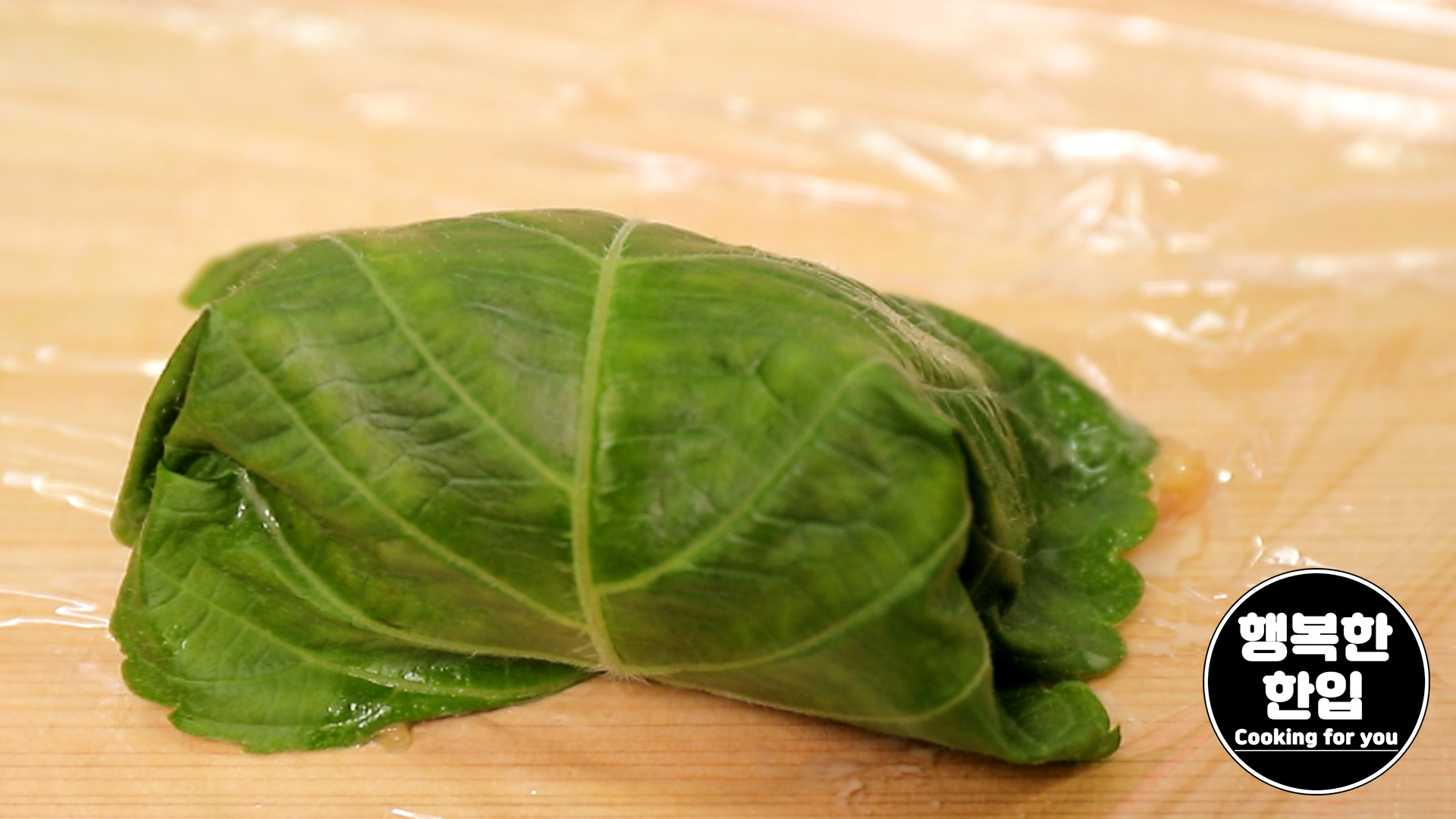 깻잎을 돌돌 말아준 후 위생랩으로 다시한번 말아주세요.