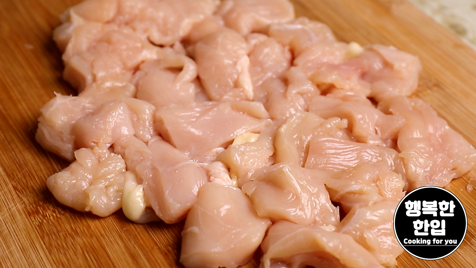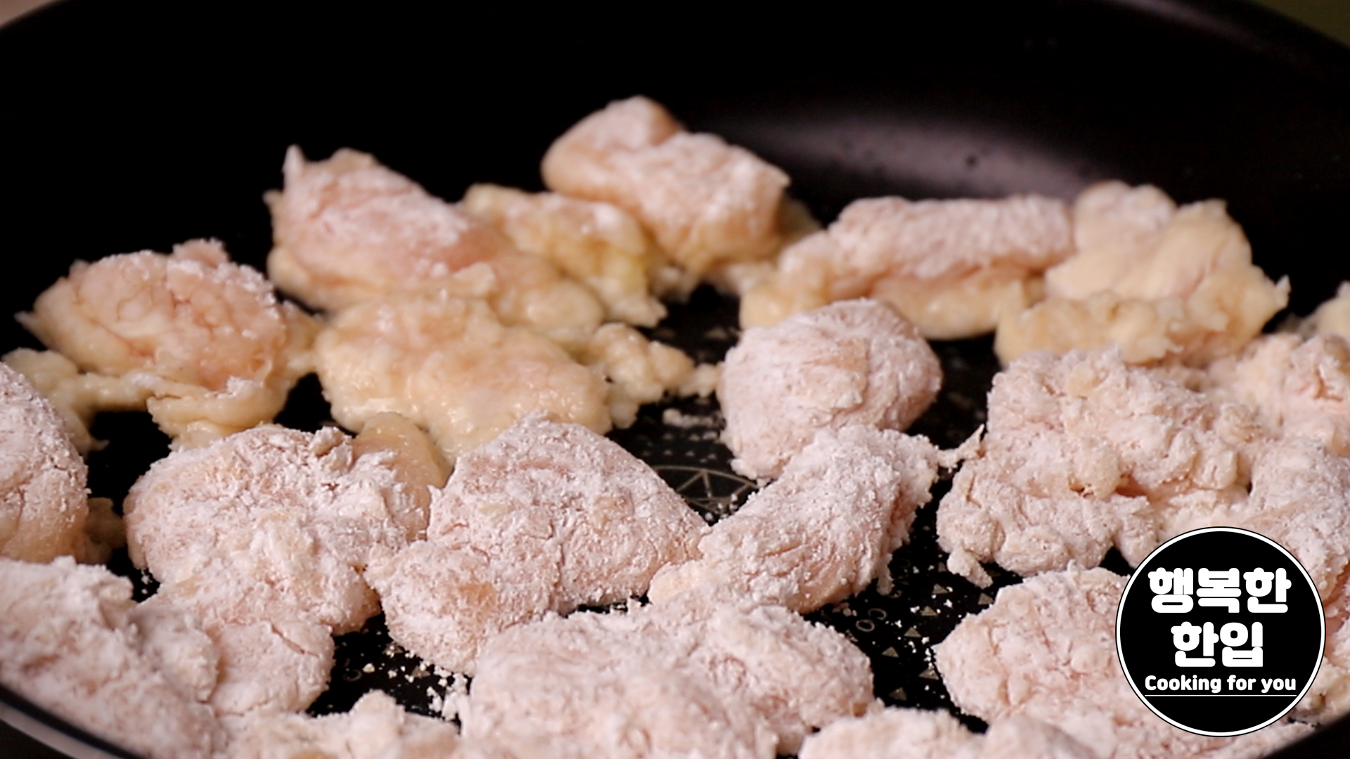 밑간을 마친 닭가슴살에 전분가루를 골고루 묻혀주세요.
