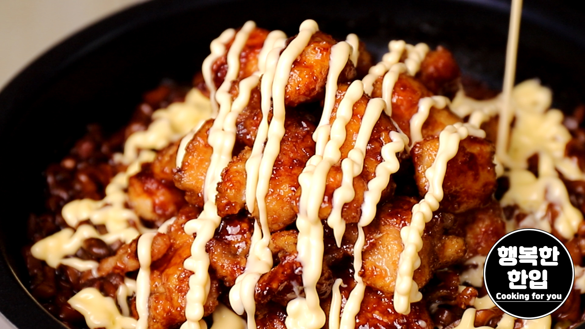 짜장라면 위에 치킨을 올리고 마요네즈를 뿌려주세요.