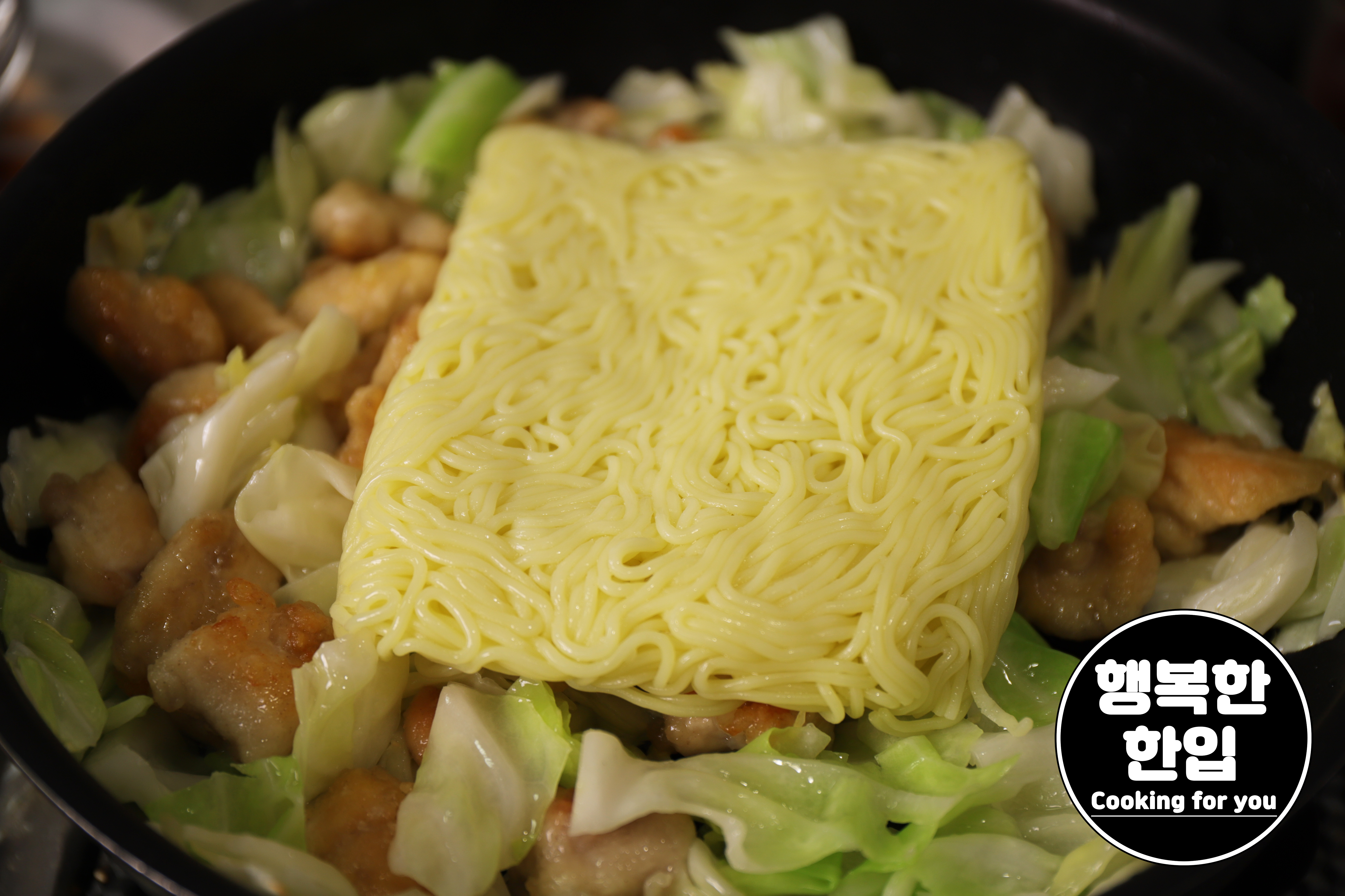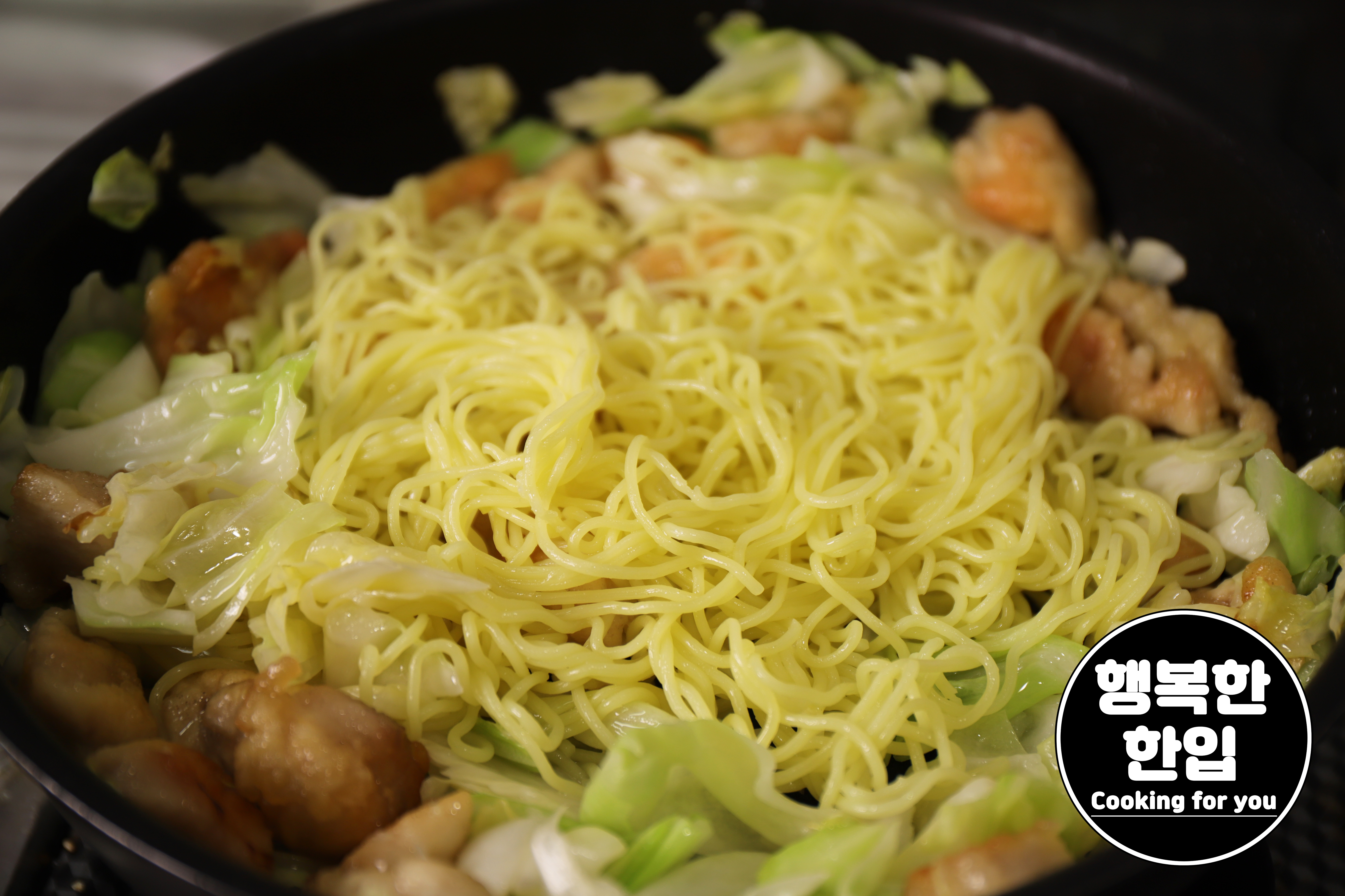 양배추에 윤기가 생기고 조금씩 흐물거릴즈음 야끼소바면을 넣어주세요.