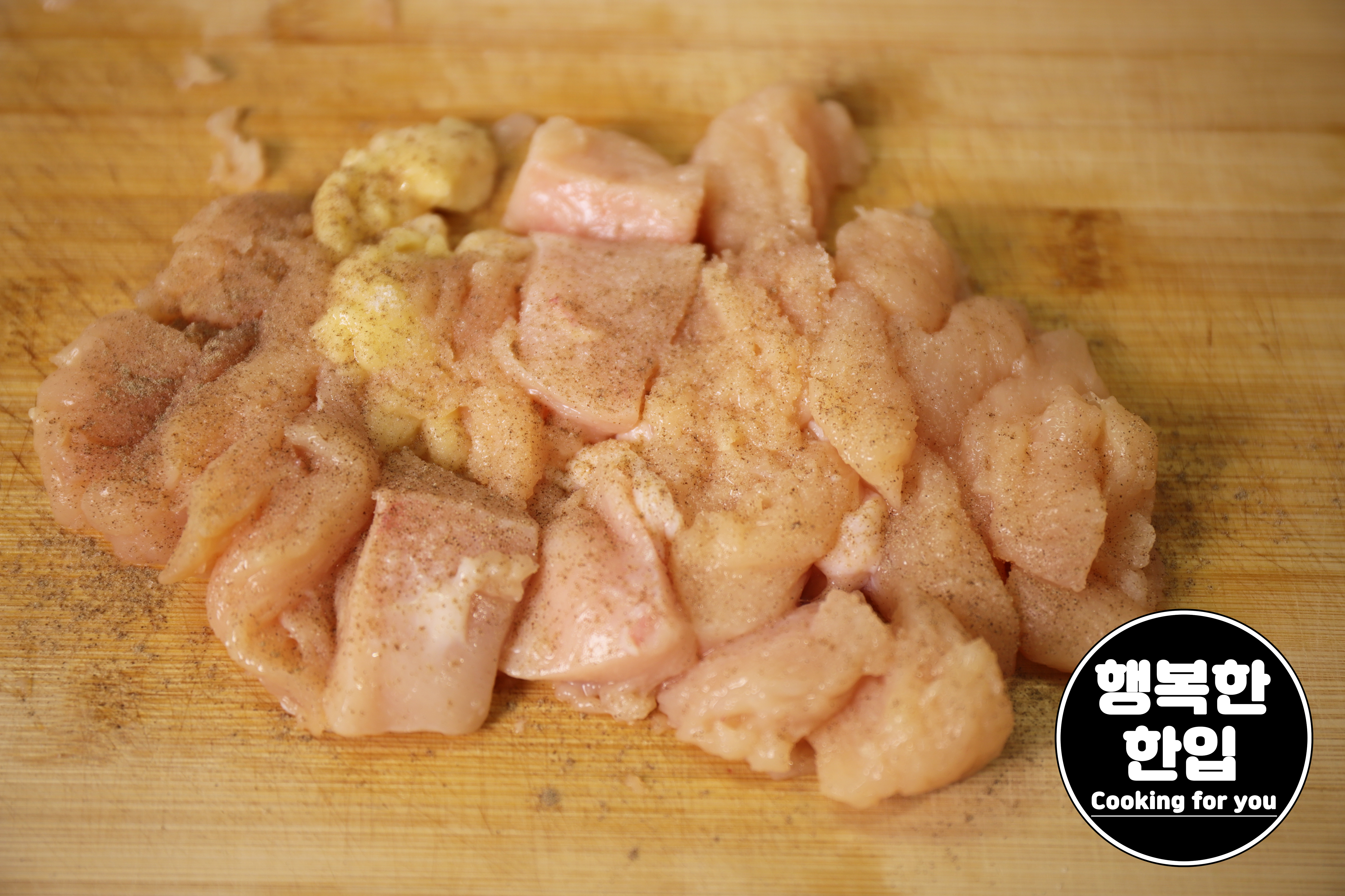닭가슴살은 적당한 크기로 잘라서 소금을 샤샤샥~! 후추도 샤샤샥~!