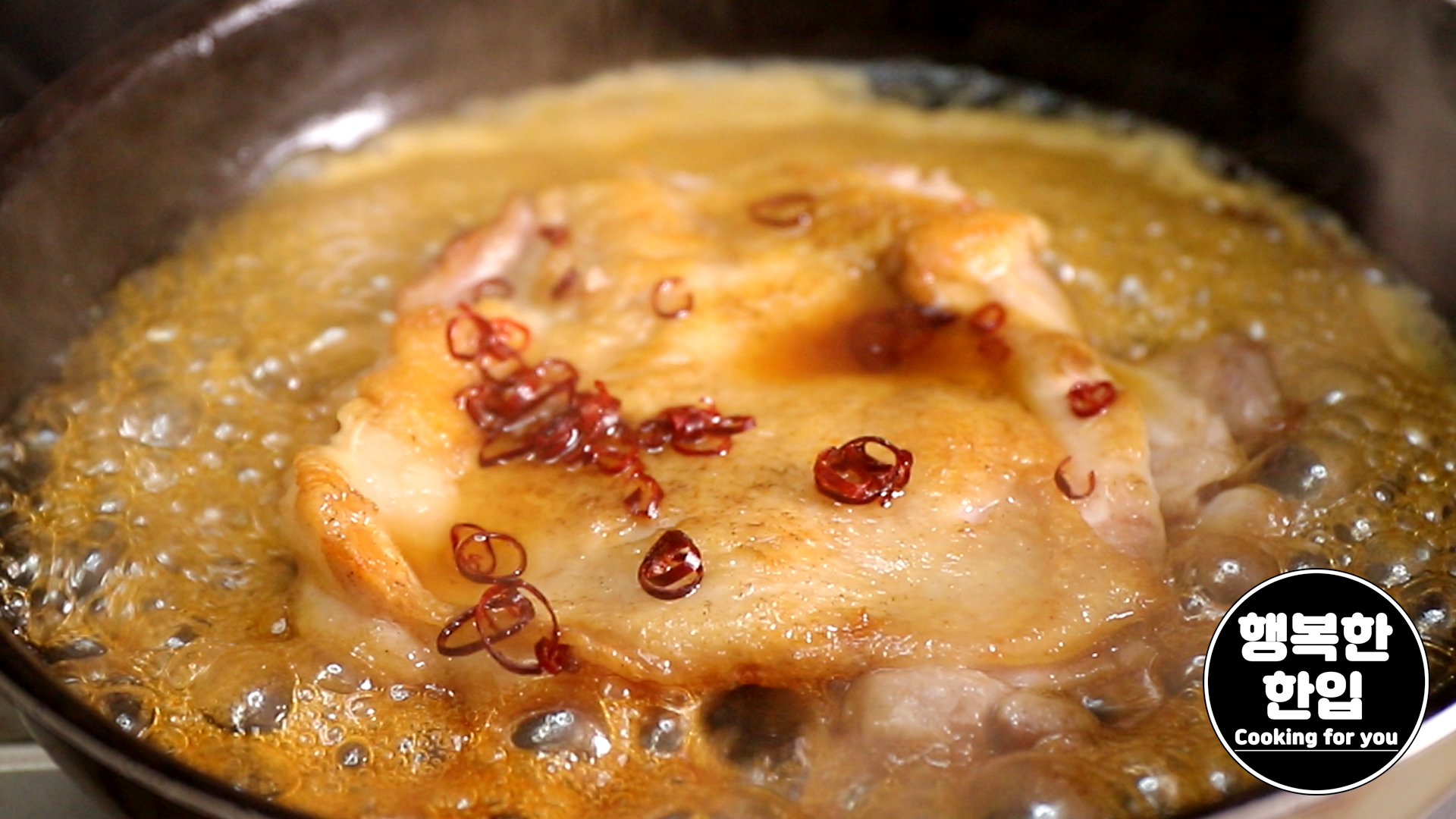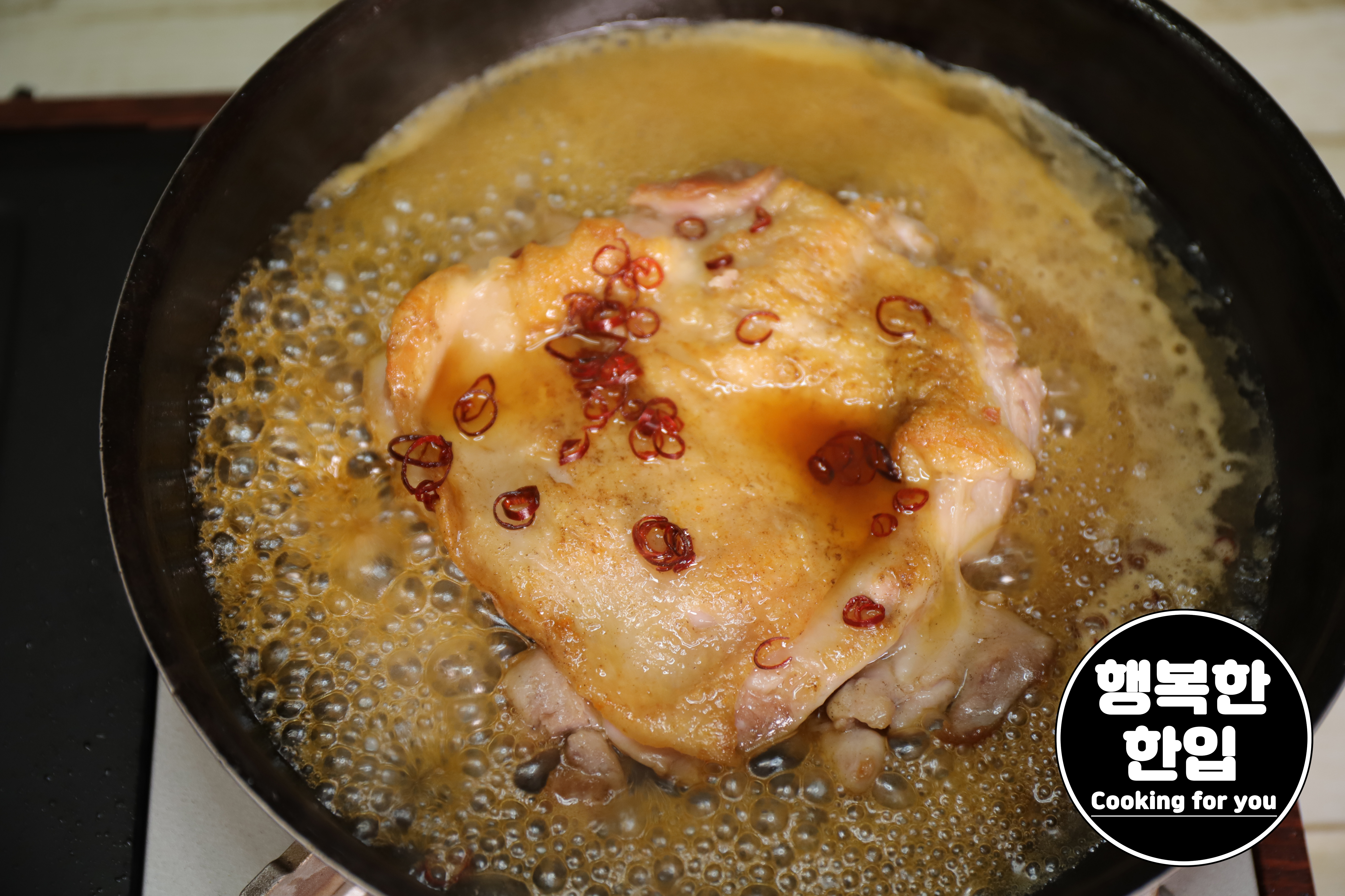 맛이 잘 스며들도록 스푼을 이용해서 닭고기 위에 소스를 얹어가며 졸여주세요.
