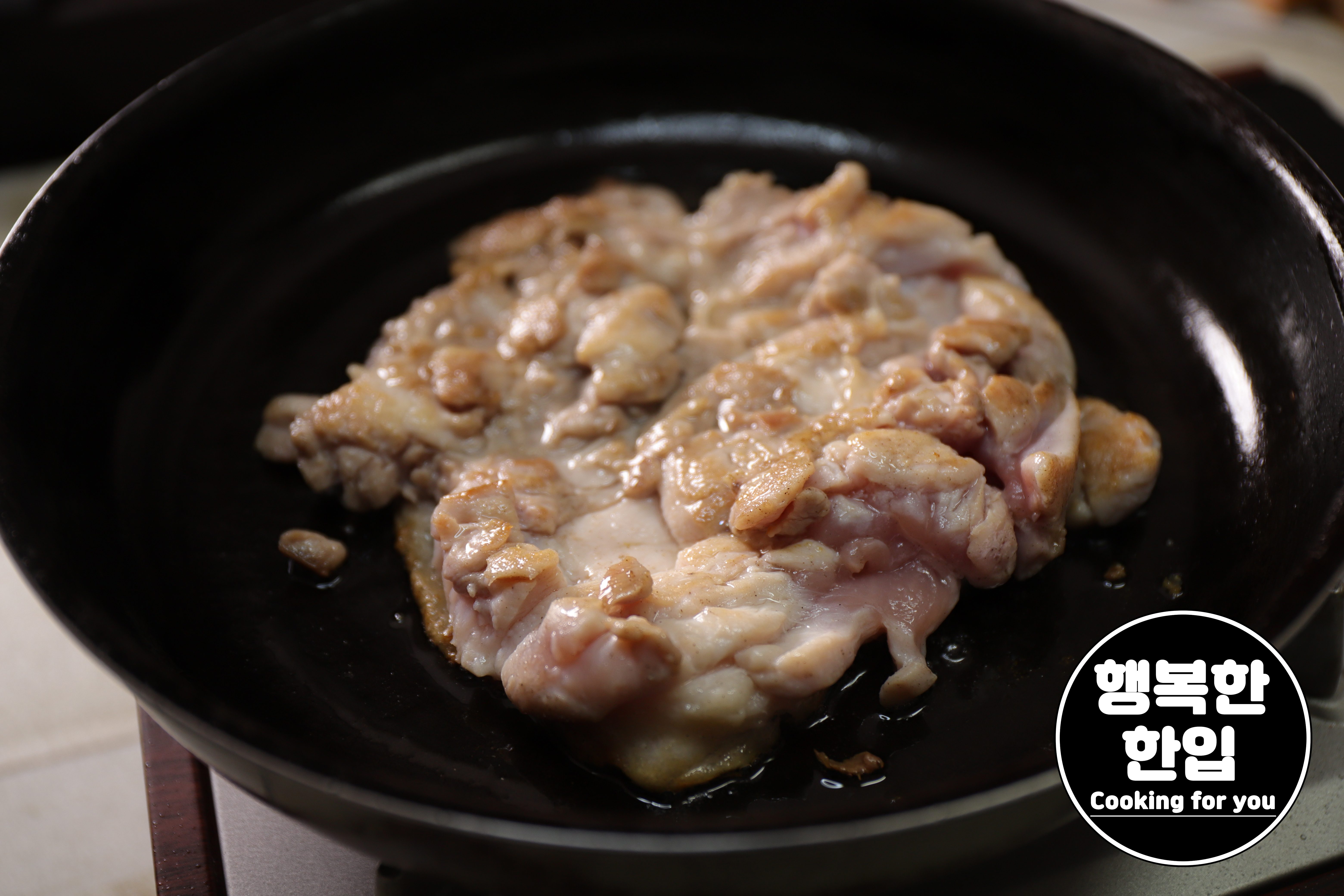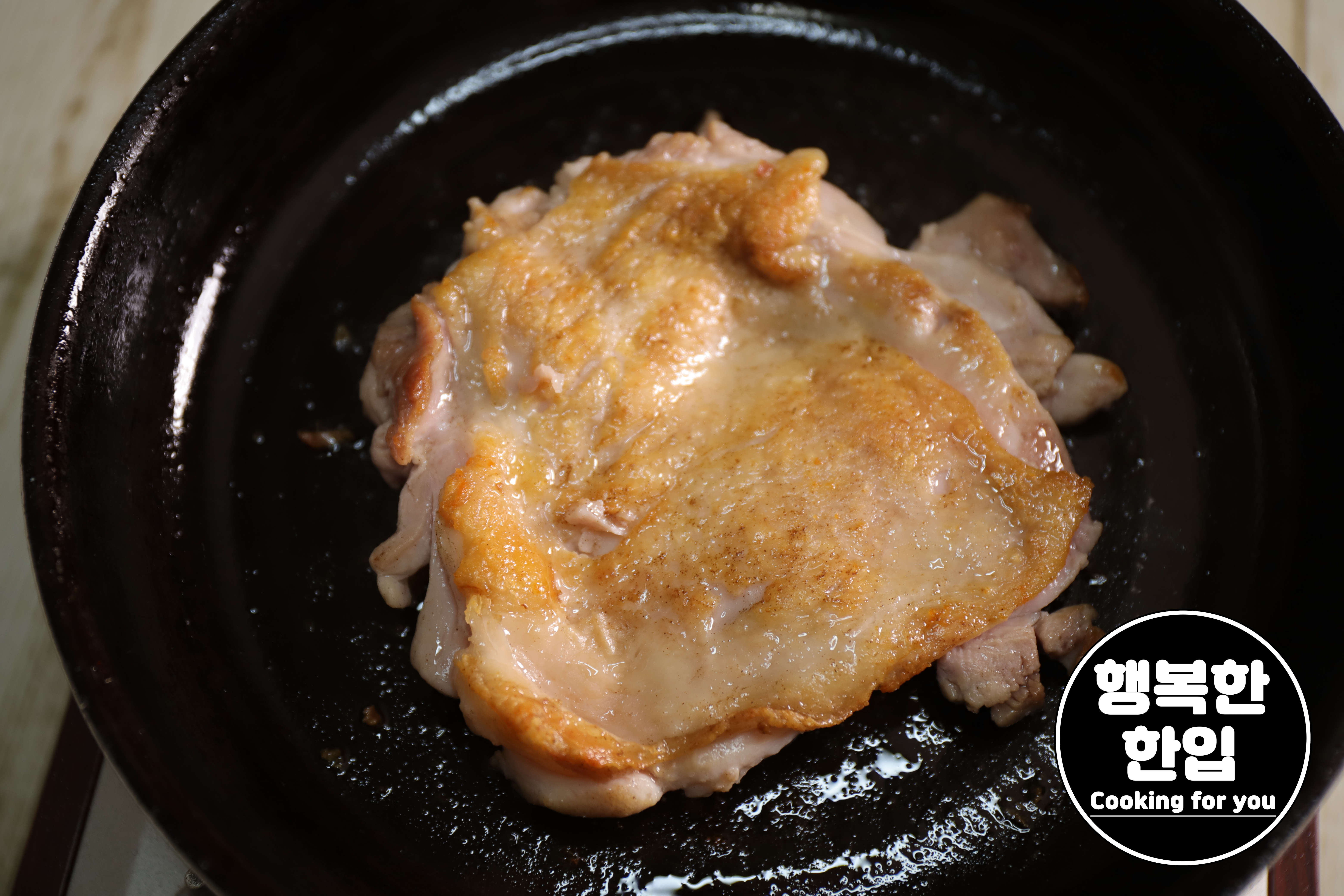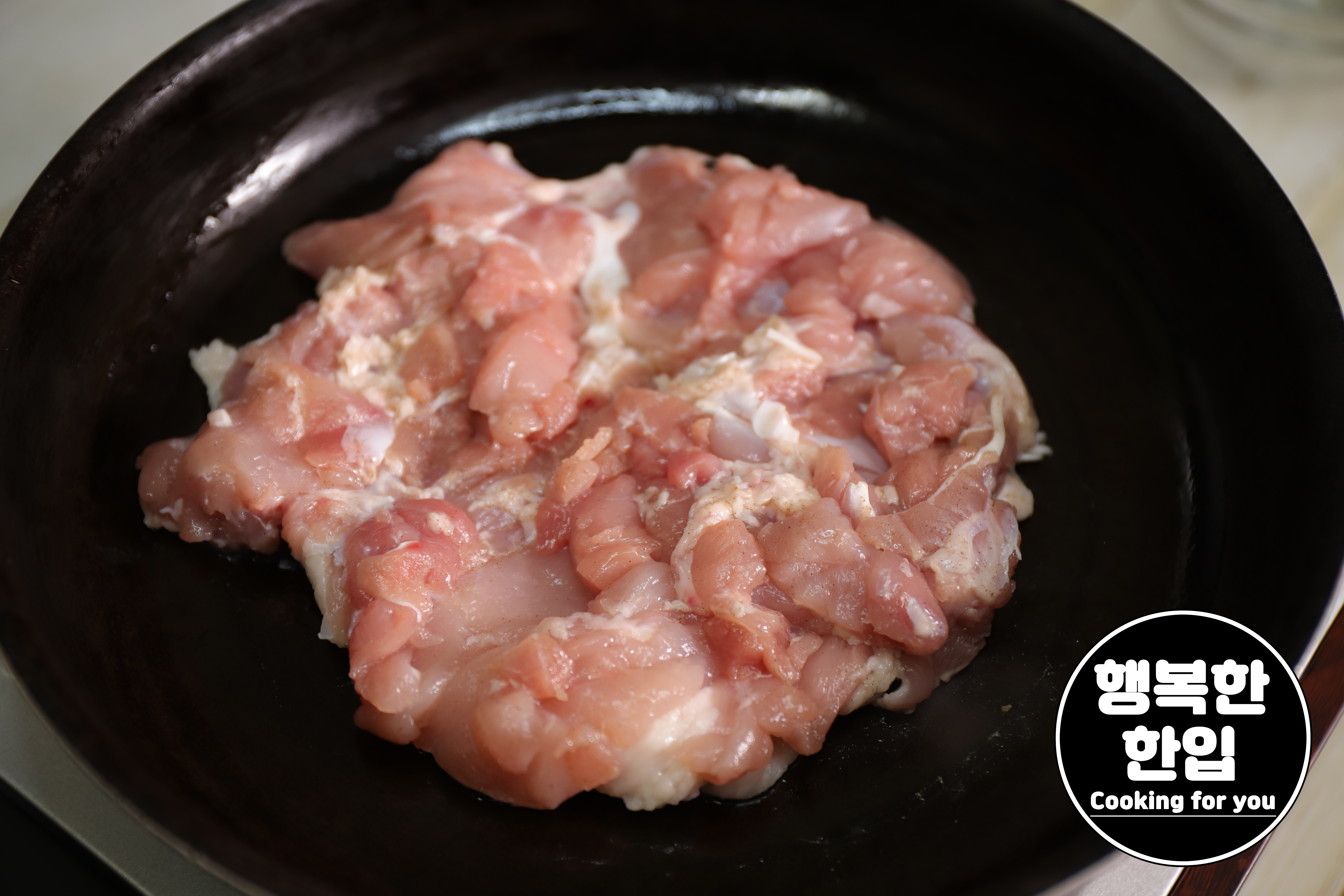 프라이팬이 달구어지면 닭고기를 쓰윽~! 올린 후 중간보다 조금 약한 불세기로 지그시 구워줍니다.