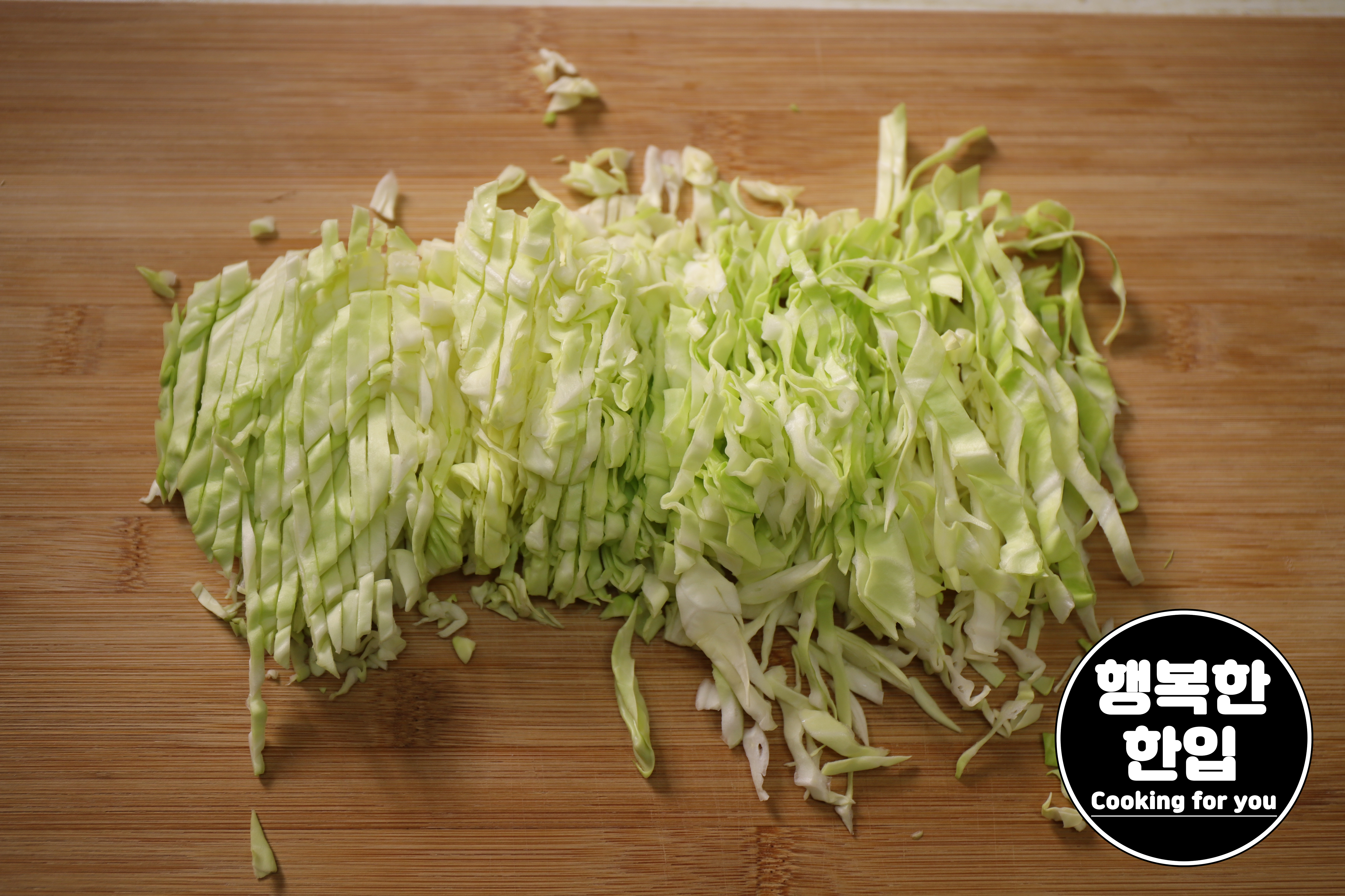 양배추는 겉의 지저분한 부분을 떼어주고 깨끗한 부분 4~5장정도 포개서 썰어줍니다.