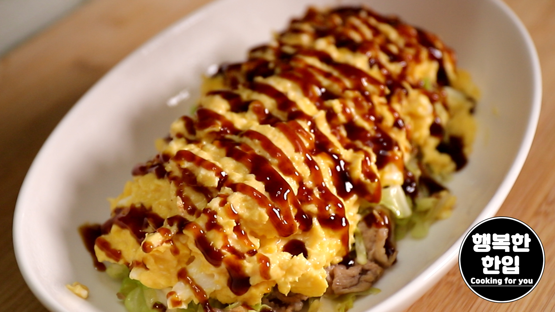 녹인 치즈와 계란을 볶은 양배추와 돼지고기 위에 얹어줍니다.