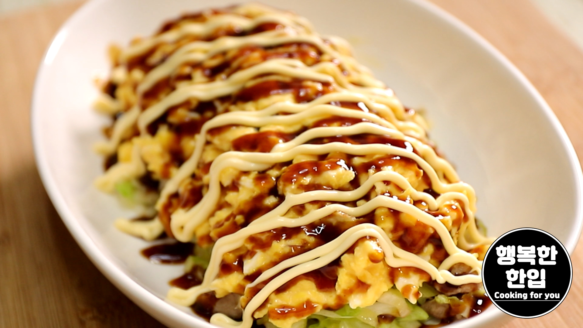그 위에 오코노미소스와 마요네즈를 뿌리고 가츠오부시를 샤샤샥~ 얹어주세요.