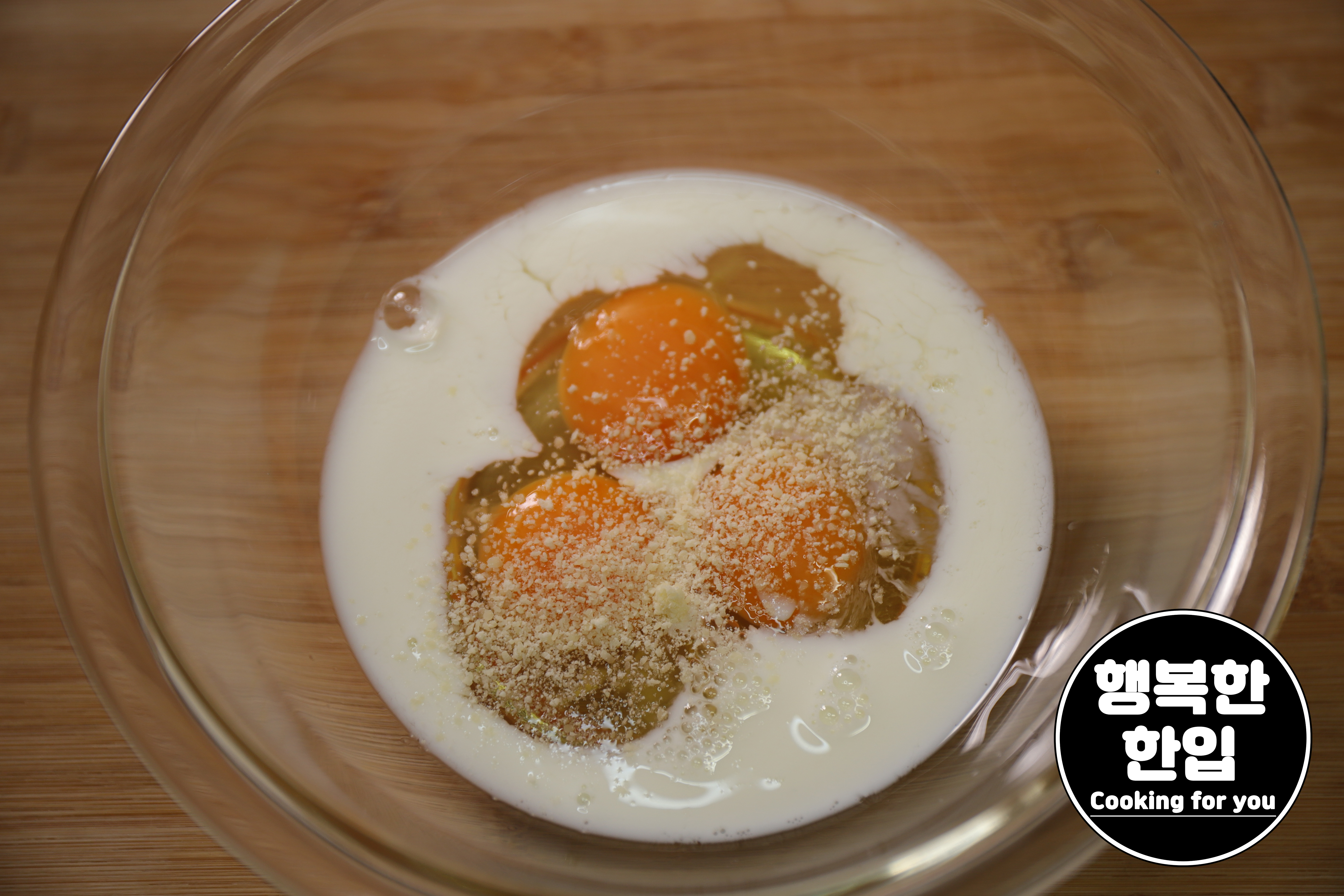 알맞은 용기나 그릇에 계란 3개, 우유 5스푼, 치즈가루 1스푼을 넣고 잘 섞어줍니다.