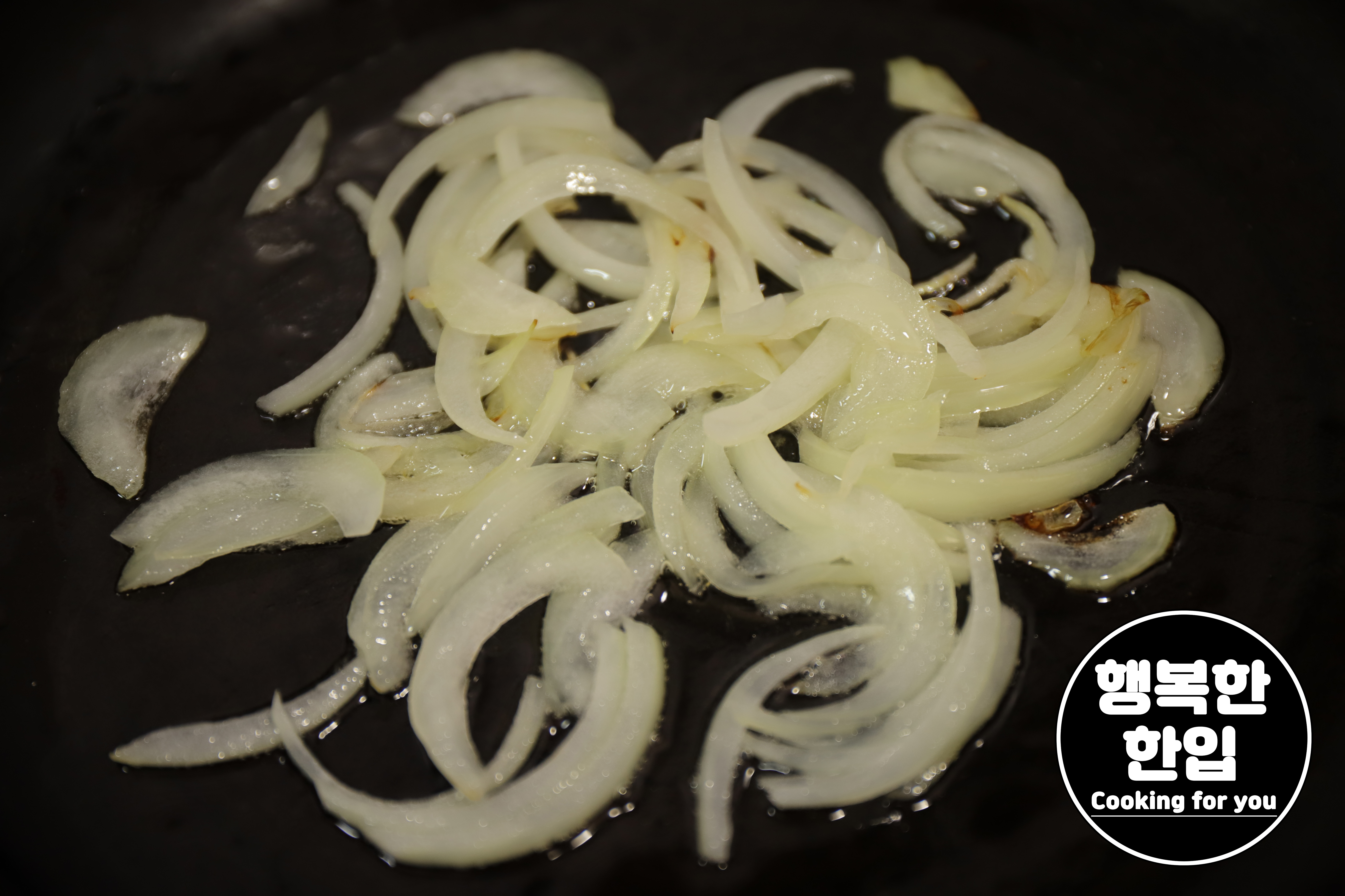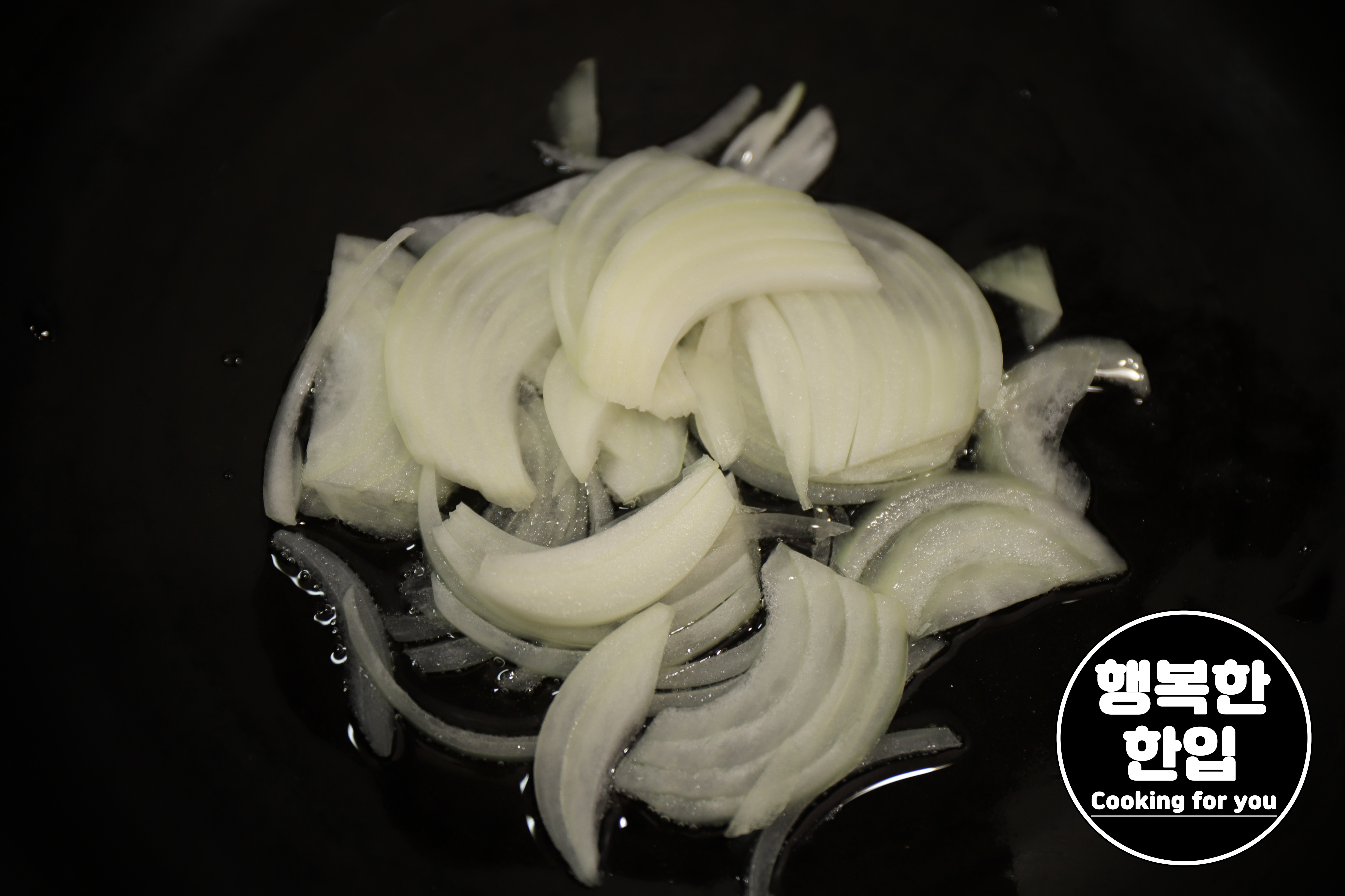 달구어진 프라이팬에 식용유를 적당히 두르고 썰어둔 양파를 볶아줍니다.