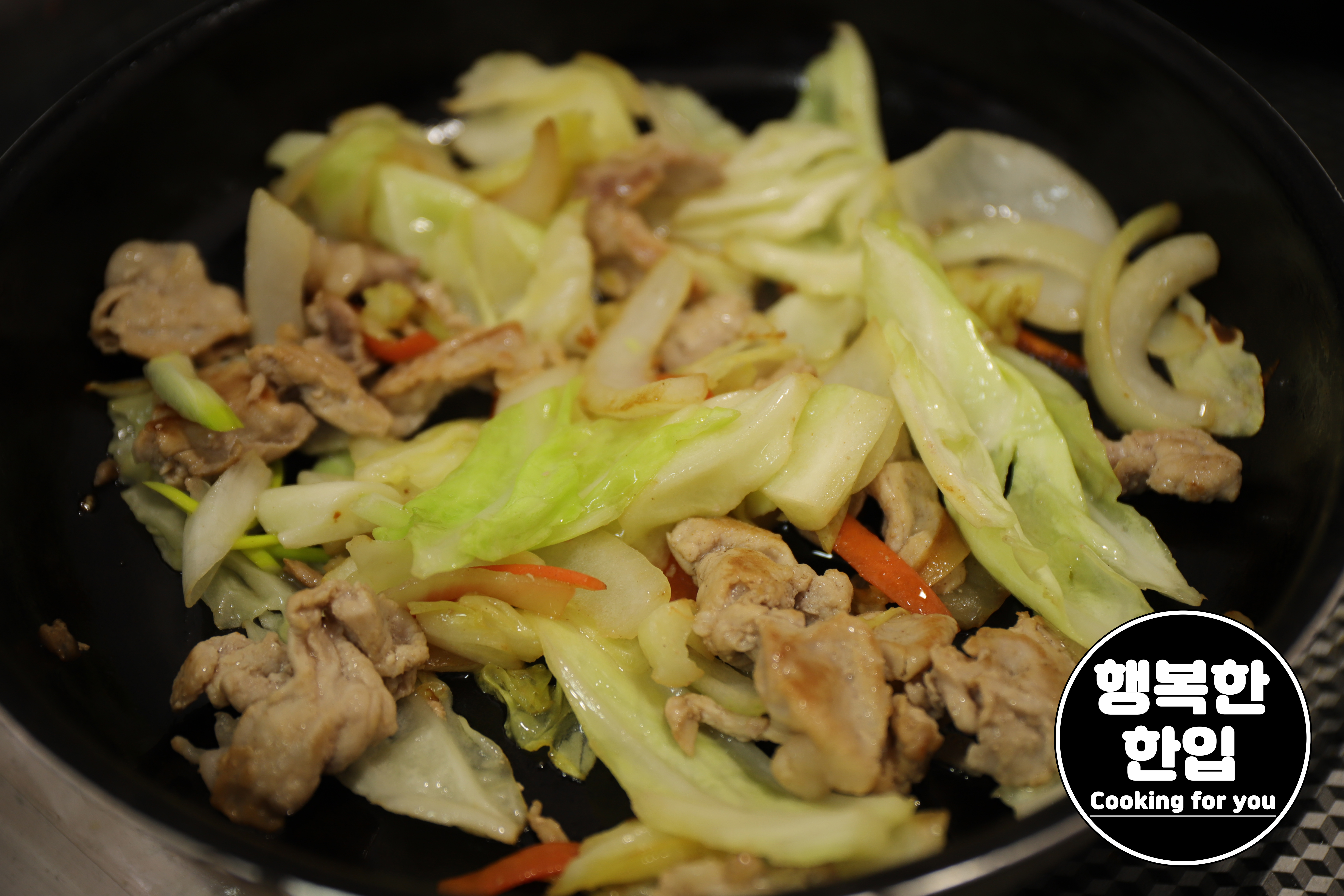 적당한 두께로 썰은 돼지고기와 양배추, 양파, 당근등 야채도 적당한 크기로 썰어서 준비해주세요.