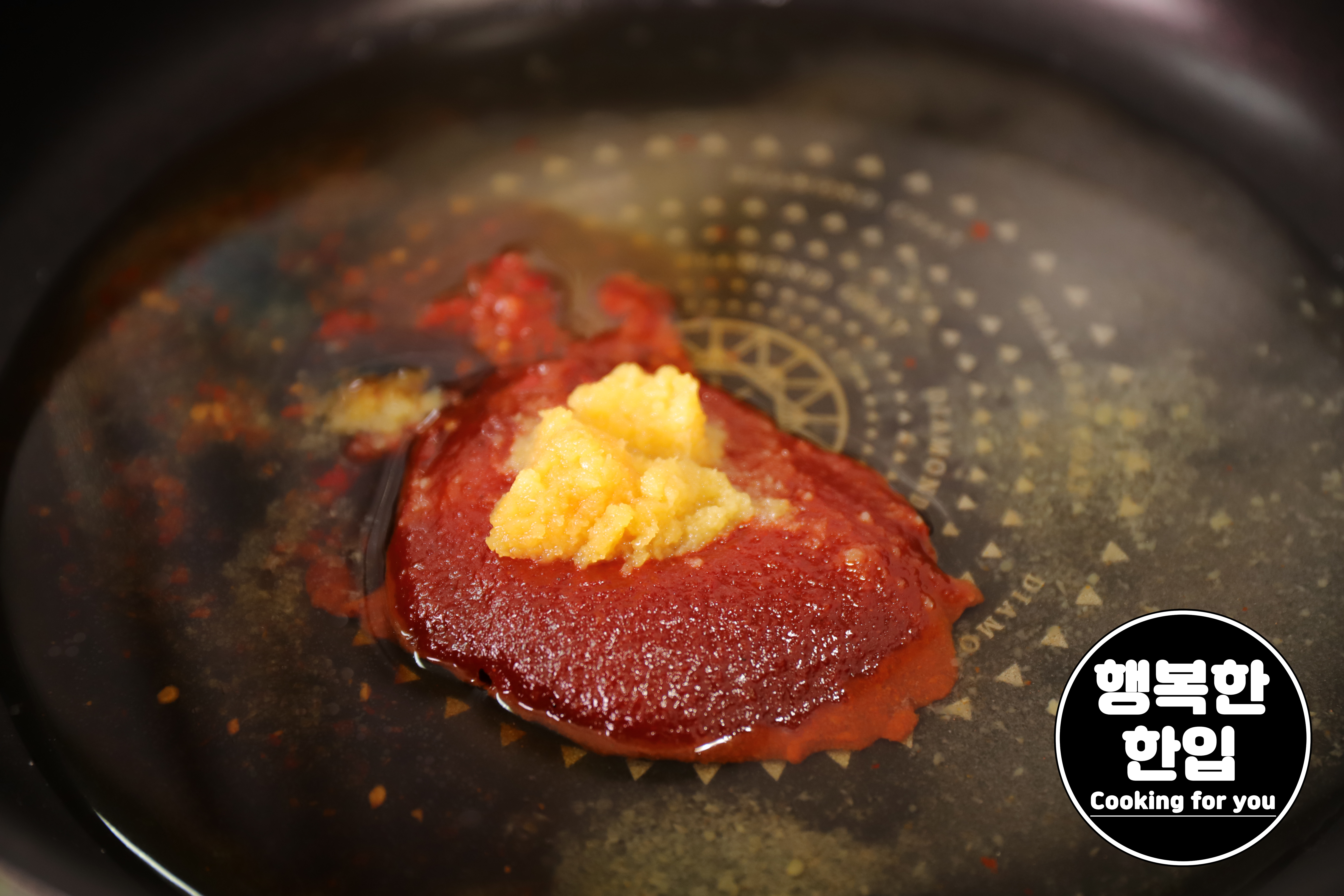 프라이팬에 설탕 3스푼, 고추장 1스푼, 두반장 1/3스푼, 간마늘 1/2스푼, 간장 1스푼, 굴소스 1스푼, 물 100ml를 넣고 잘 섞어가며 끓여줍니다.