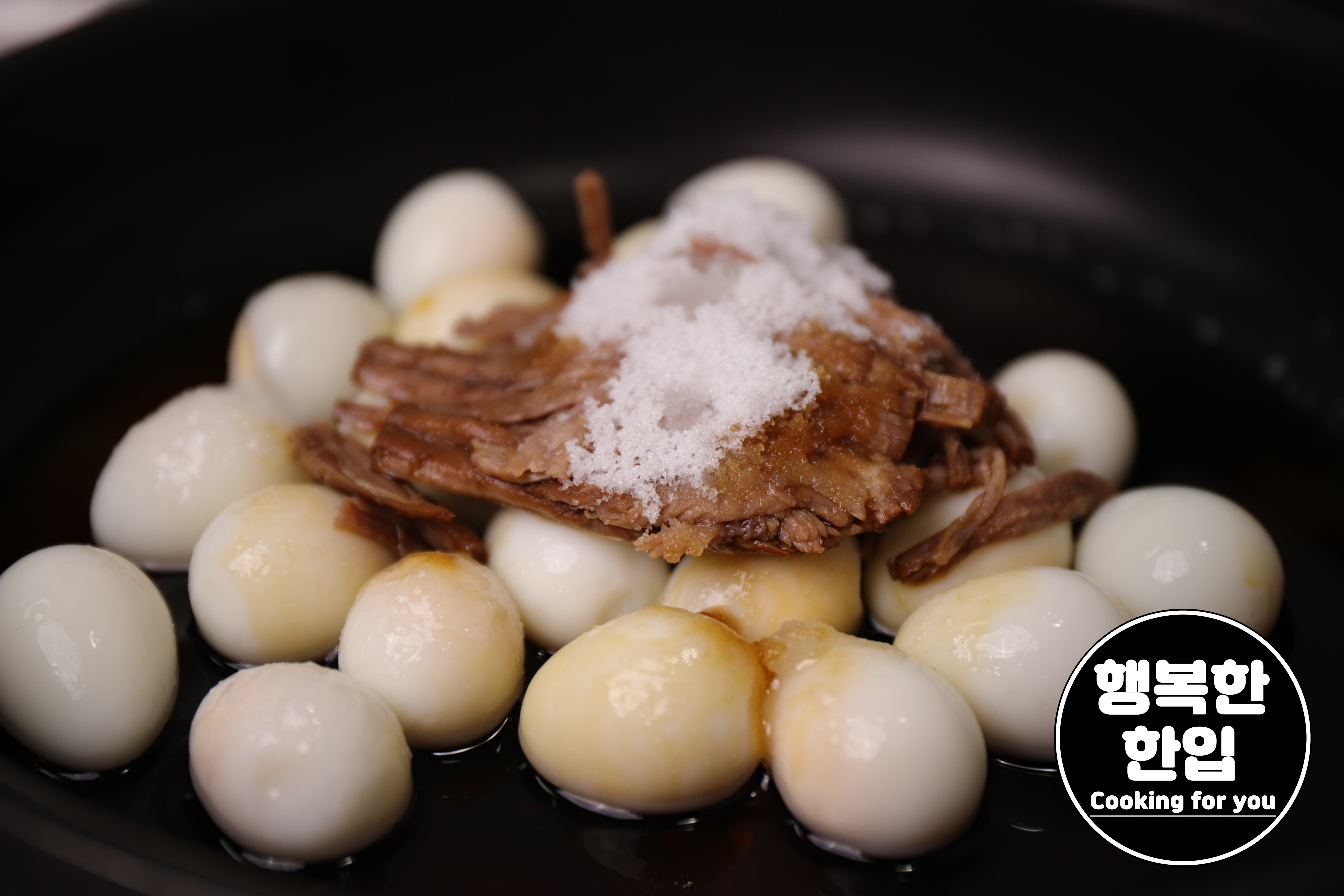 메추리알은 끓는물에 8분정도 삶아서 껍질을 제거 한 후 20개 ~ 25개정도를 준비해줍니다.