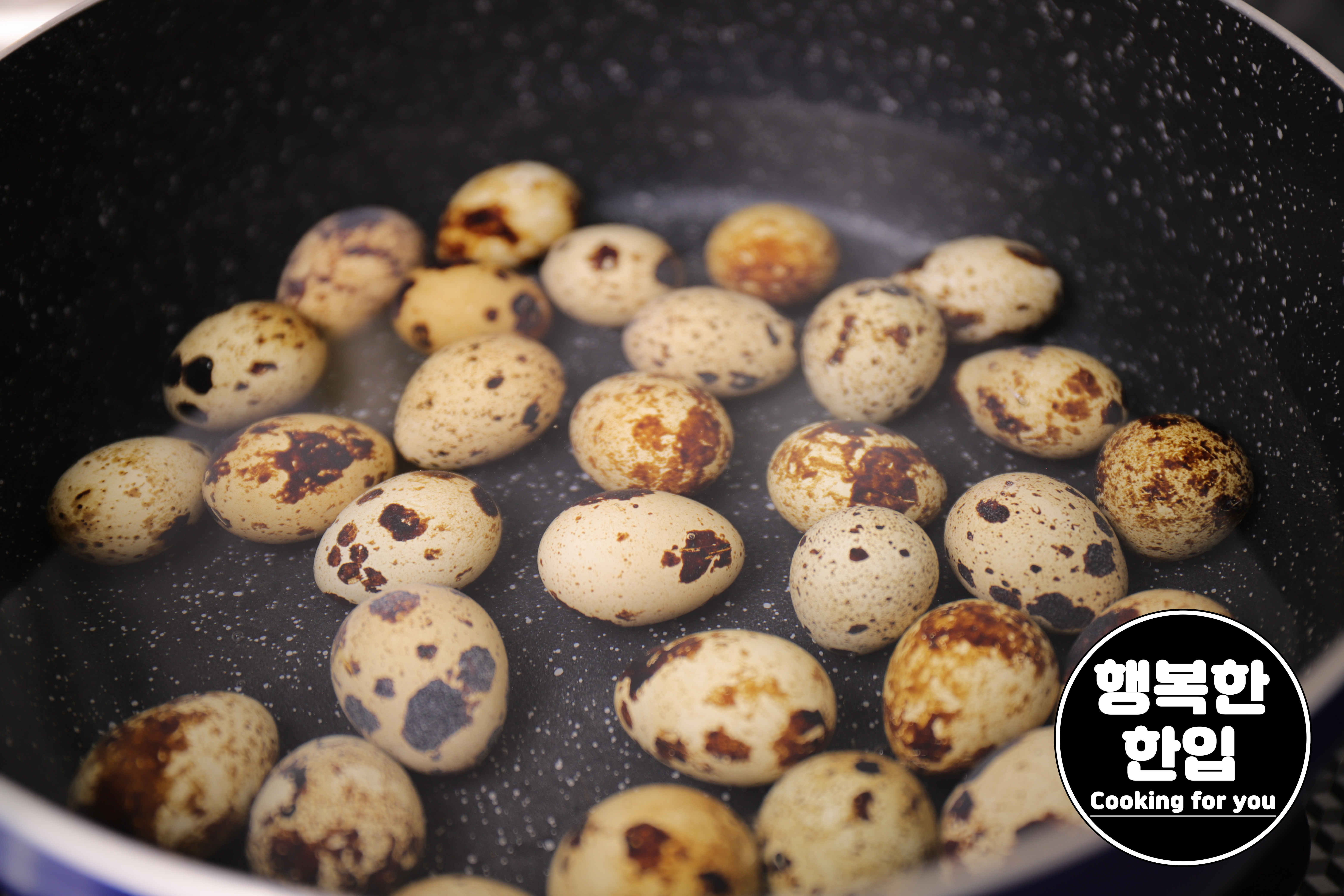 메추리알은 끓는물에 8분정도 삶아서 껍질을 제거 한 후 20개 ~ 25개정도를 준비해줍니다.