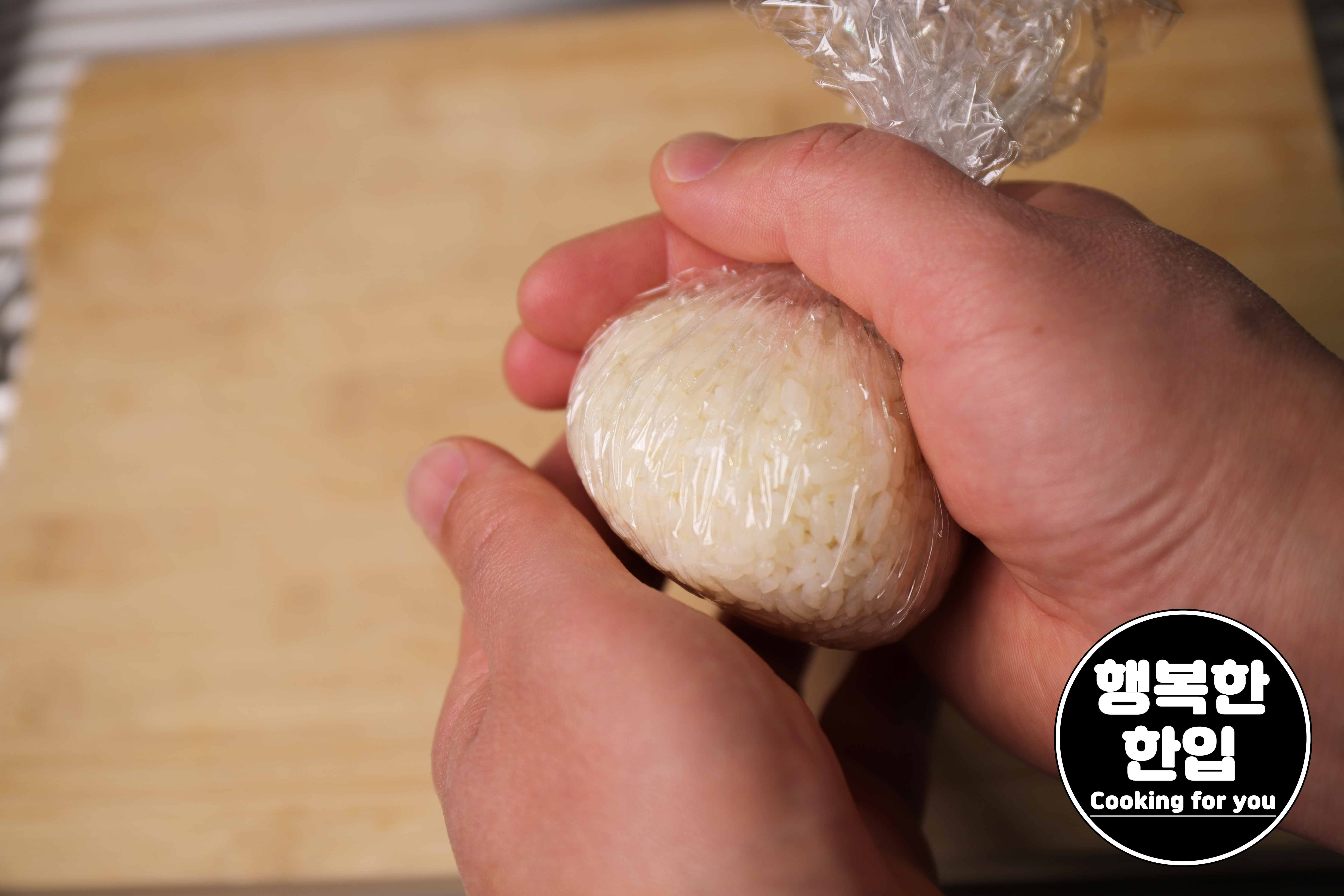 위생랩을 가볍게 말아 움켜쥐고 위 아래 밥이 잘 뭉쳐지도록 살살 모양을 잡아주세요.