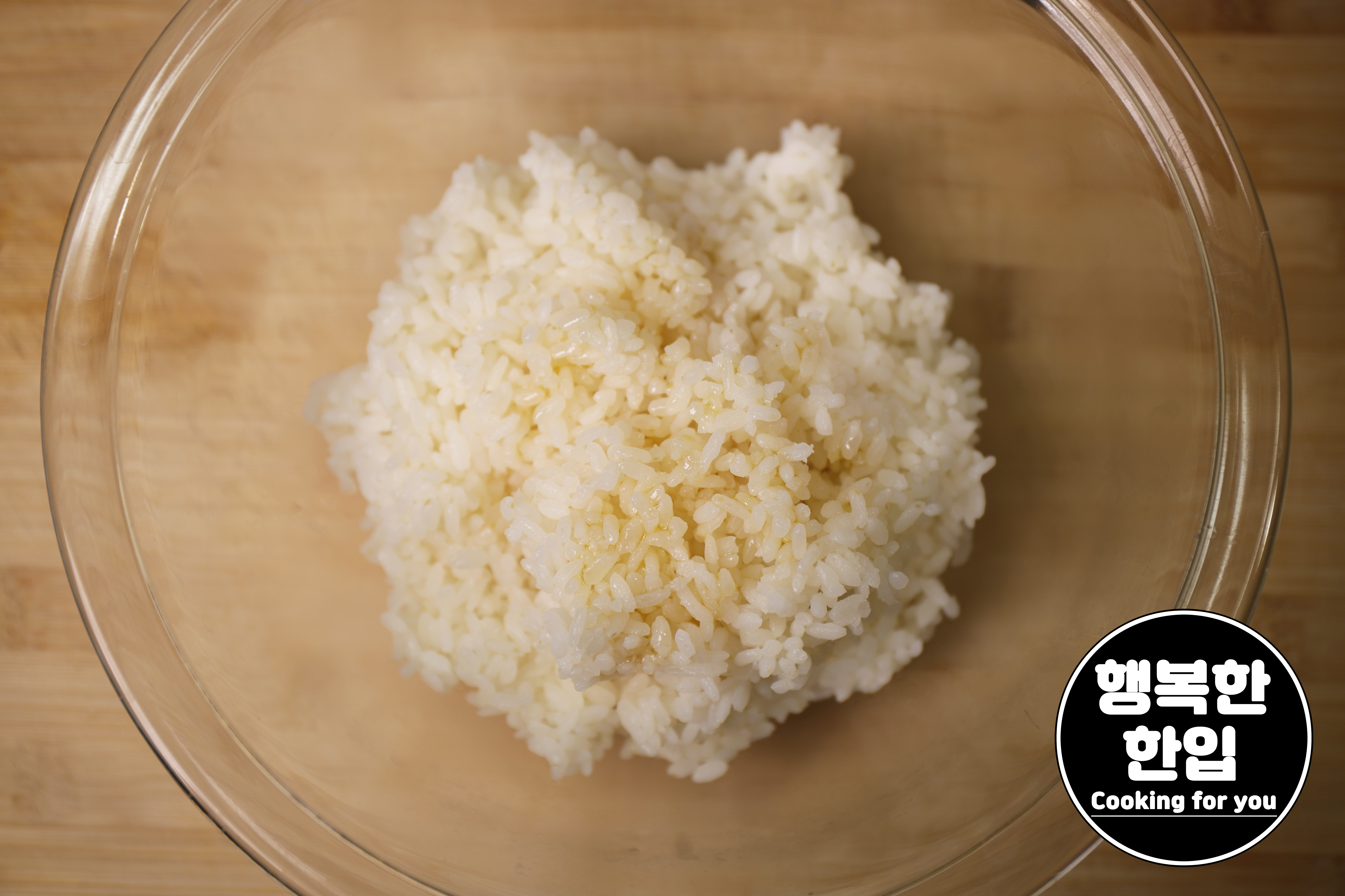 밥에 참기름을 가볍게 둘러주고 골고루 섞어주세요.