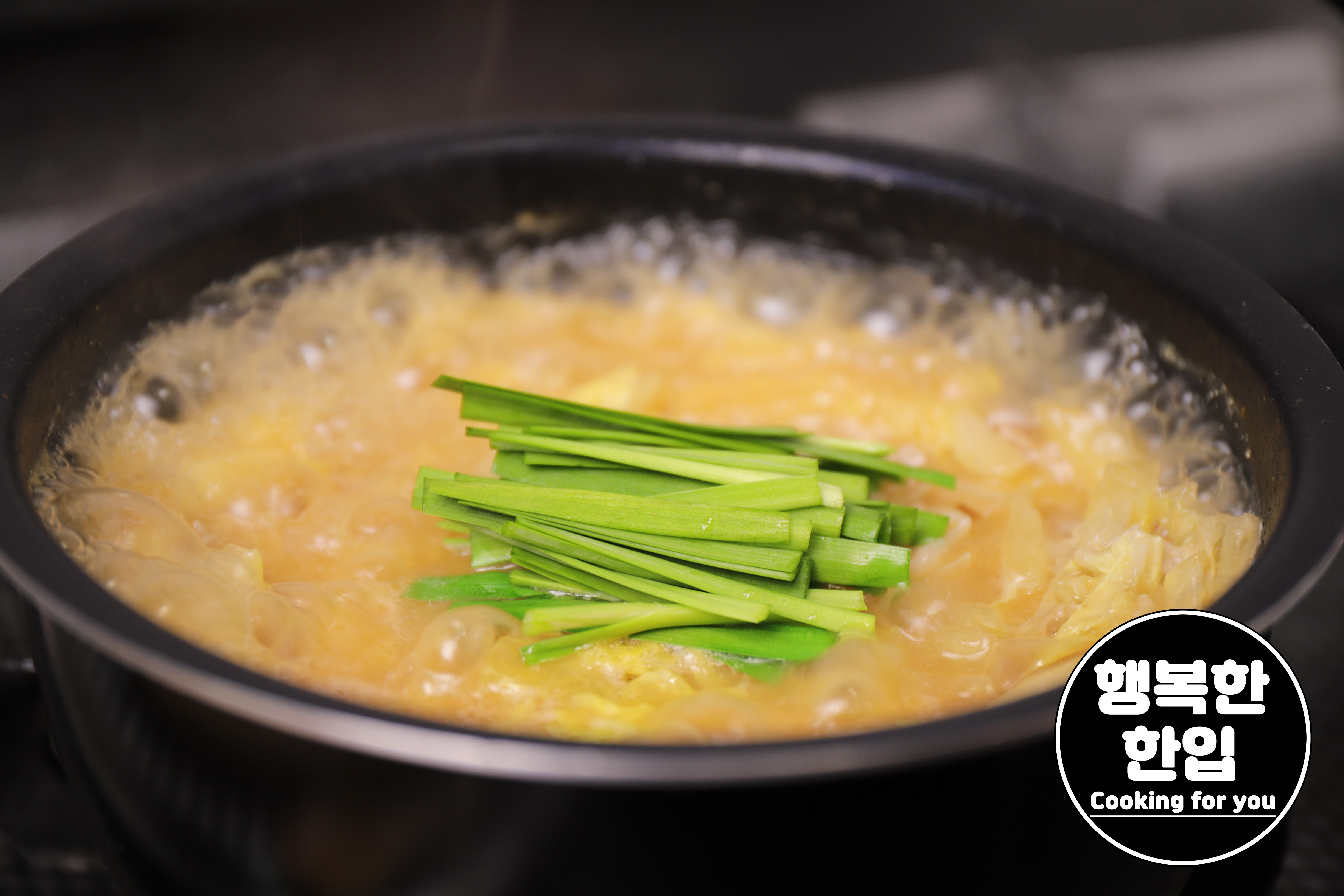 육수를 추가해서 부추를 넣고 한소끔 끓여주세요.