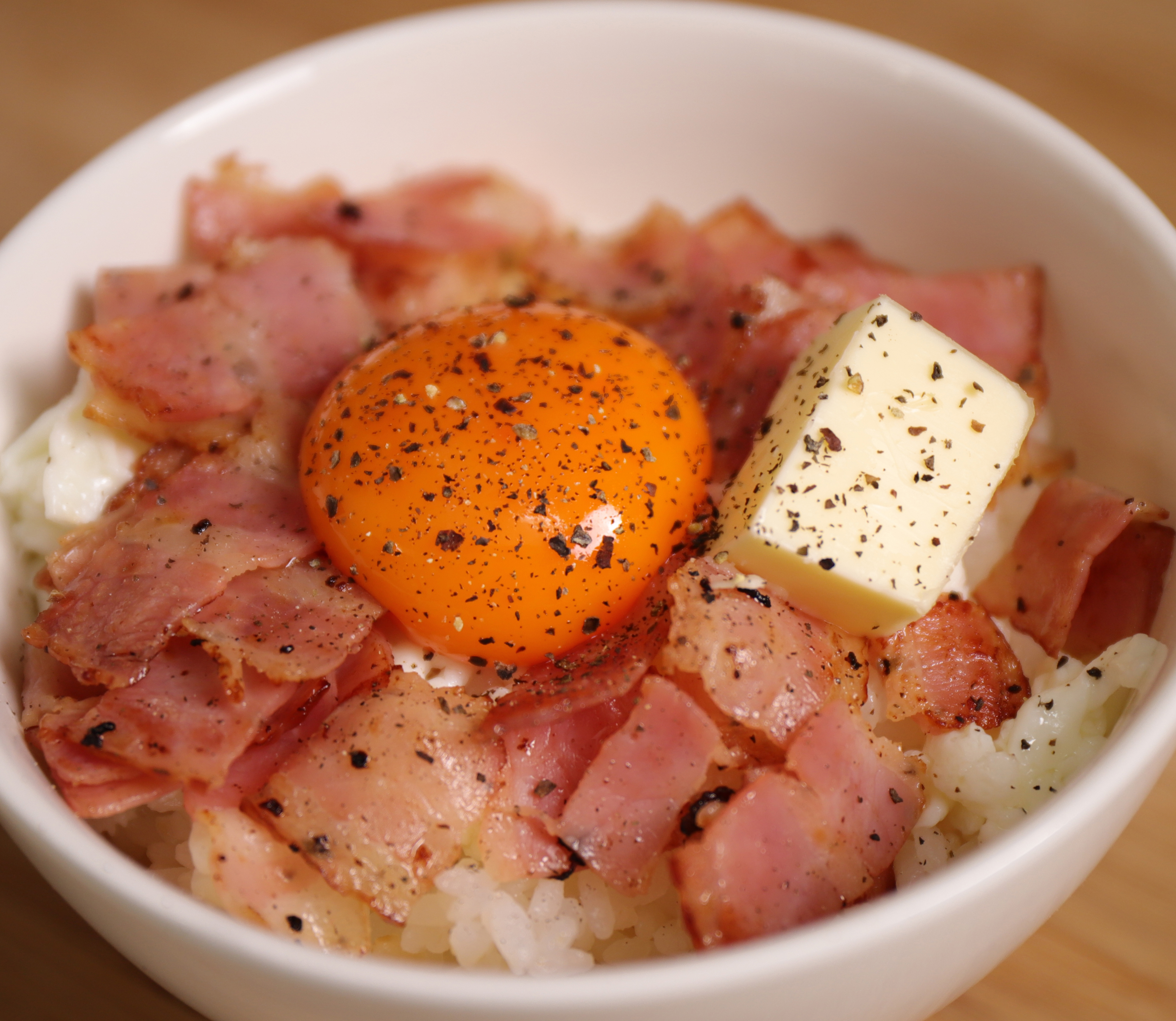 밥 150g (보통 한공기보다 적은양) 위에 계란 흰자와 베이컨을 올려주세요.