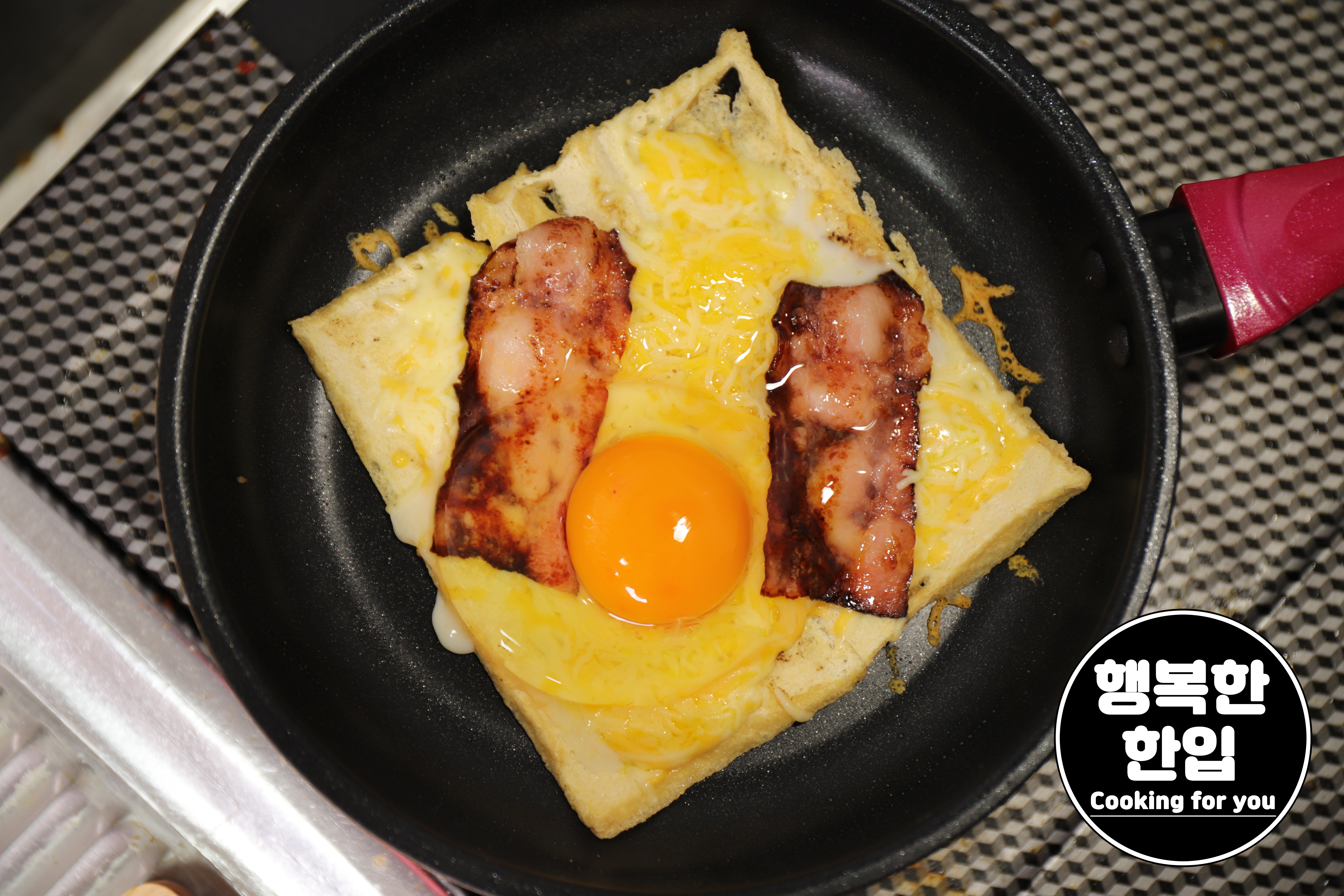 믹스치즈를 적당히 올리고 구운 베이컨과 계란을 하나 추가해주세요.