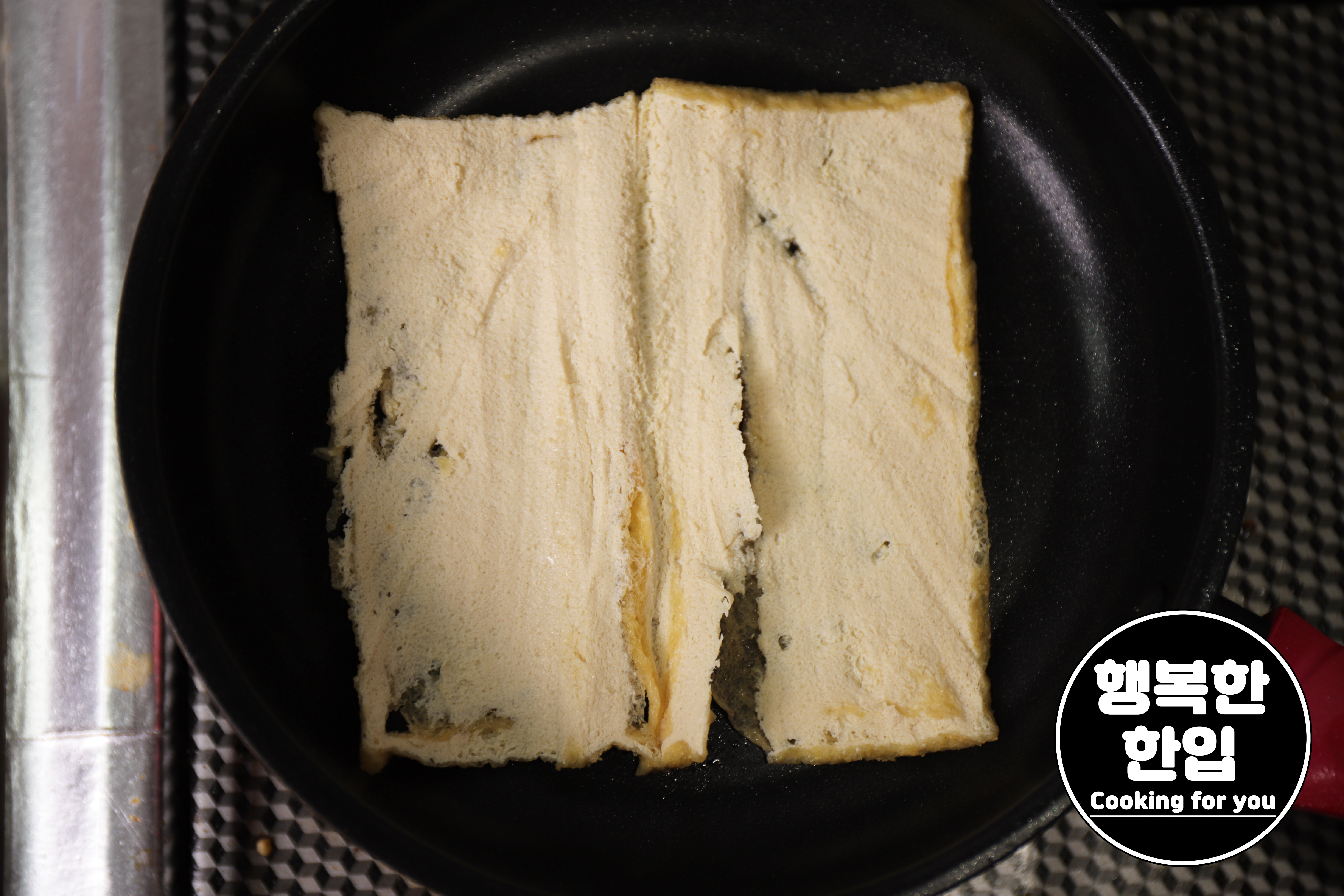 조미가 되어있지 않은 유부를 반으로 갈라서 안쪽을 먼저 약불로 가볍게 구워준 후 뒤집어주세요.