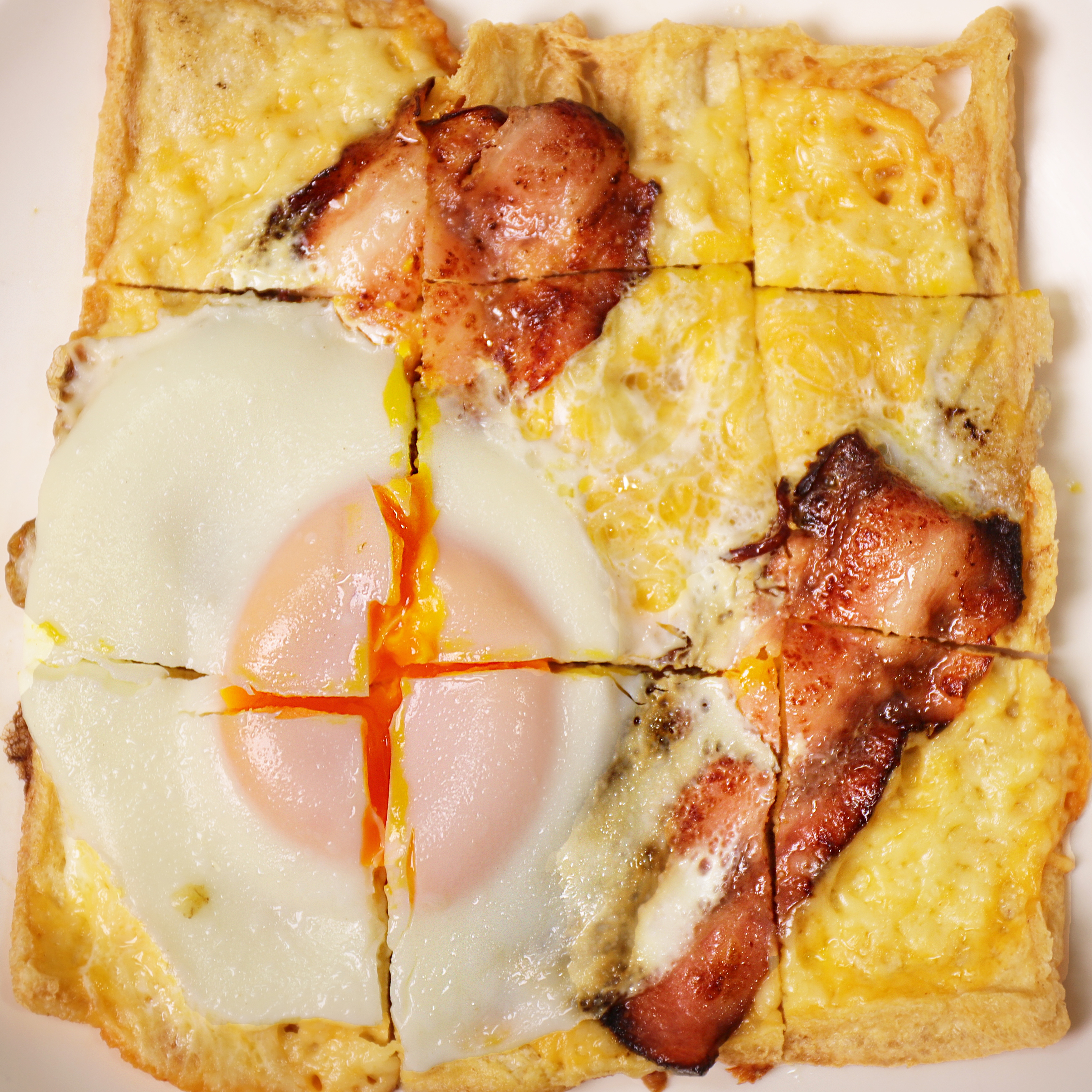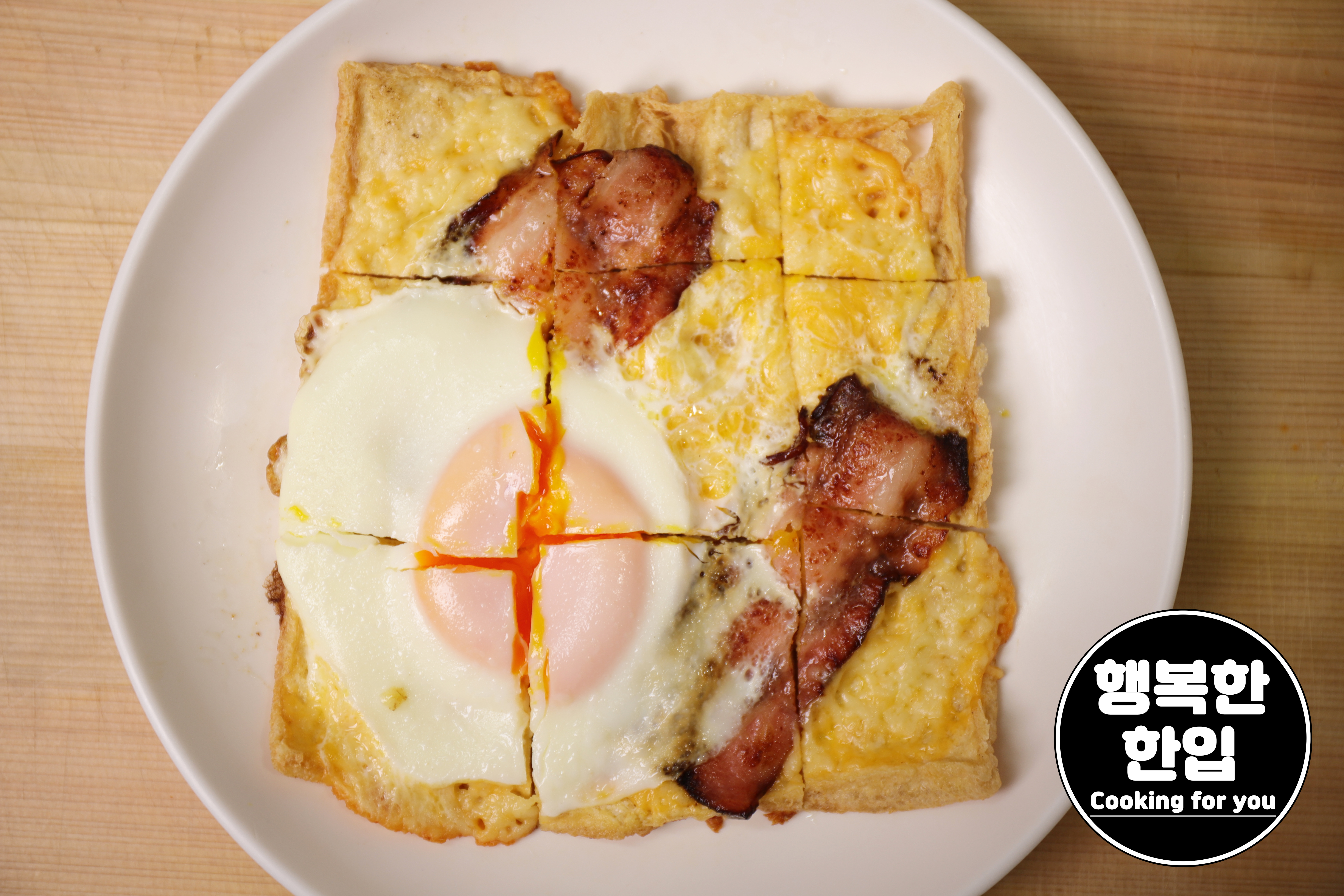 믹스치즈를 적당히 올리고 구운 베이컨과 계란을 하나 추가해주세요.