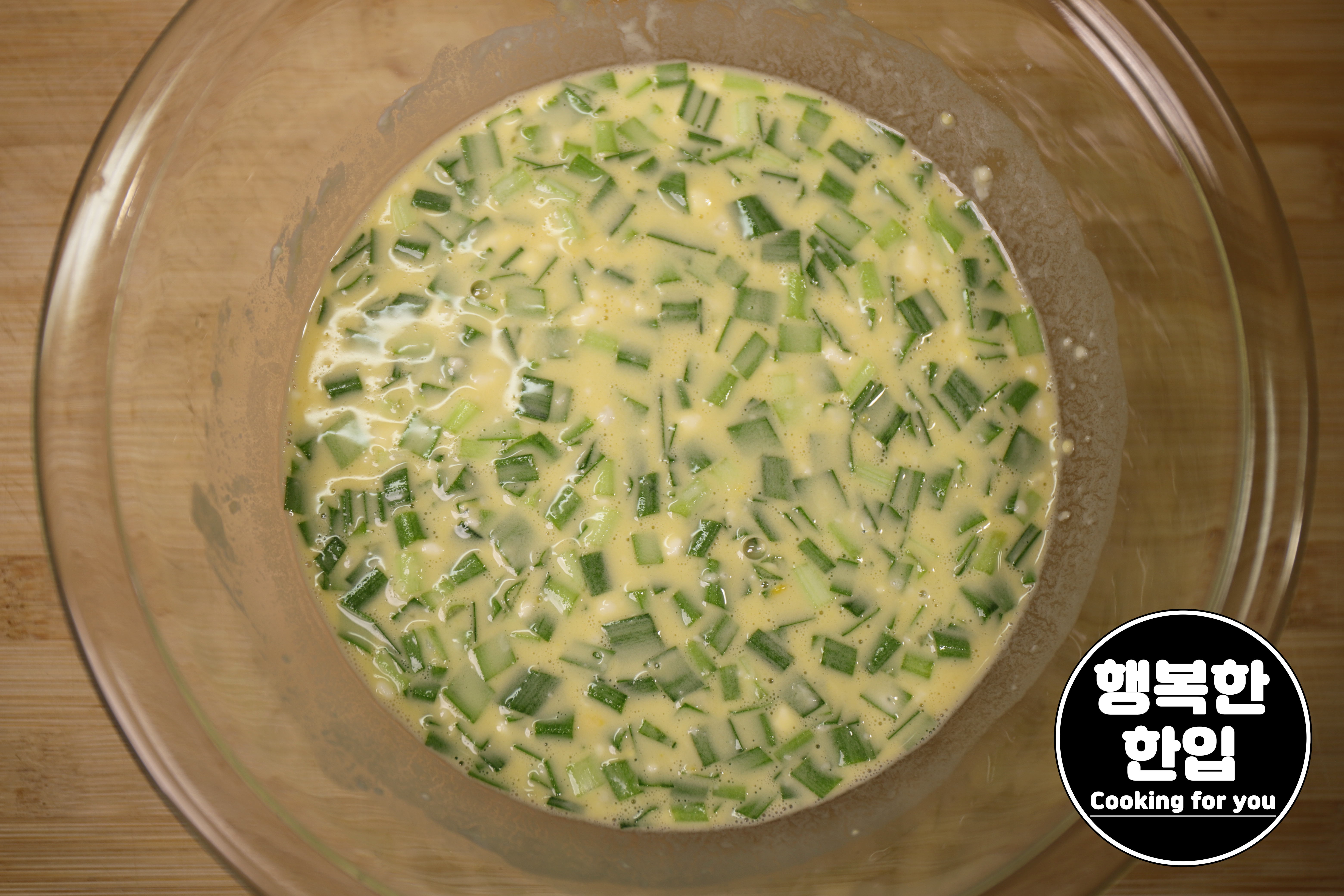 부추 40g, 밀가루 100g, 소금 3꼬집, 계란 1개에 물 200ml를 부어 잘 섞어주세요.