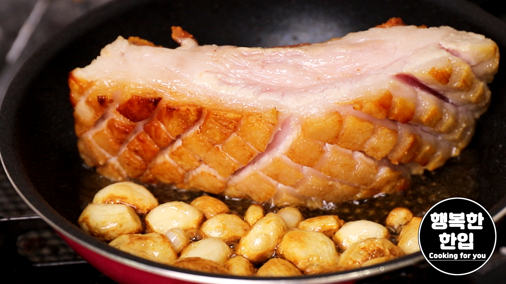 전체적으로 노릇노릇 구워지면 통삼겹살의 2/3정도만 칼집을 내어줍니다.