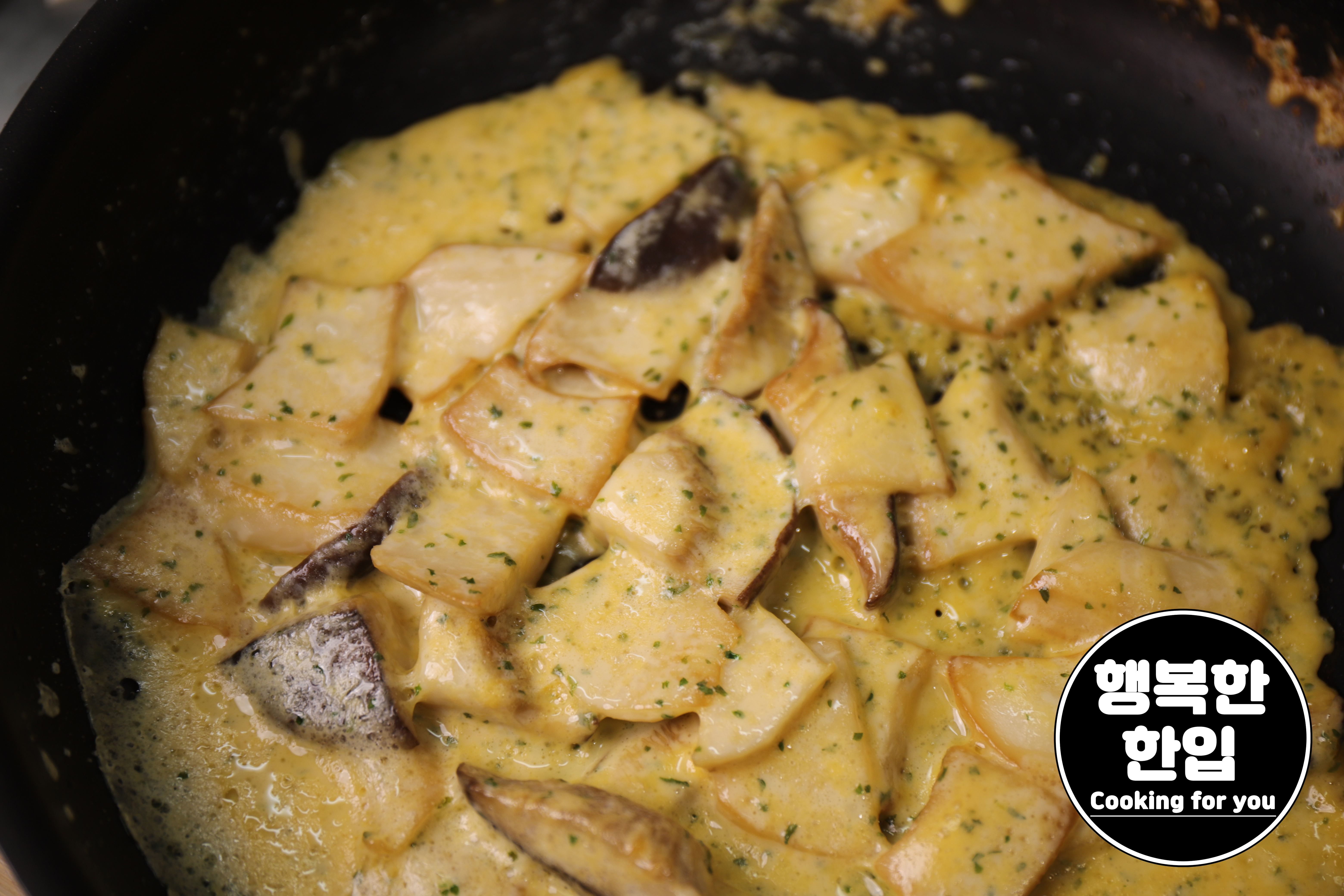 새송이버섯이 노르스름 잘 구워지면 우유를 100ml ~ 150ml정도 부어서 끓여주세요.