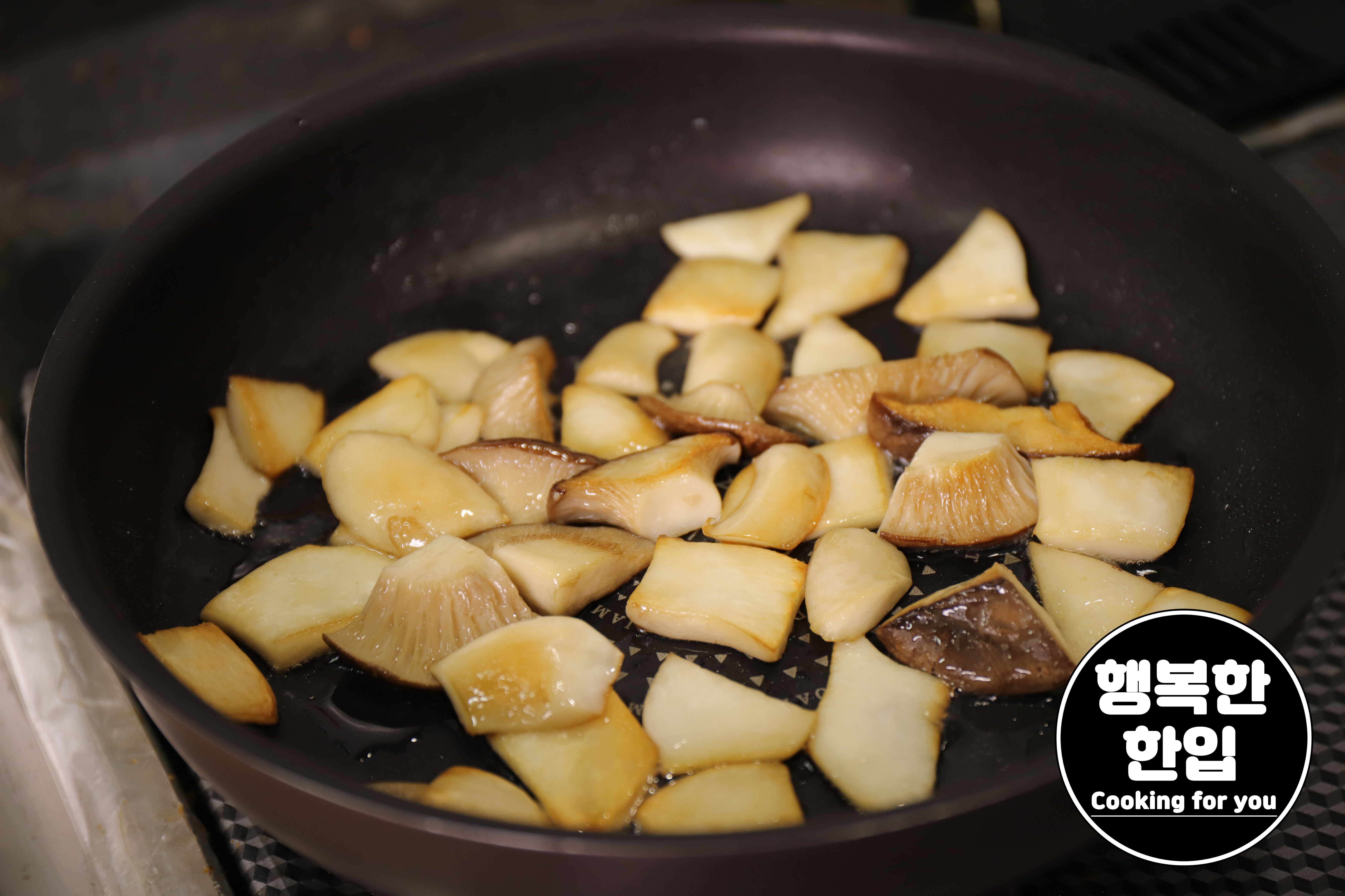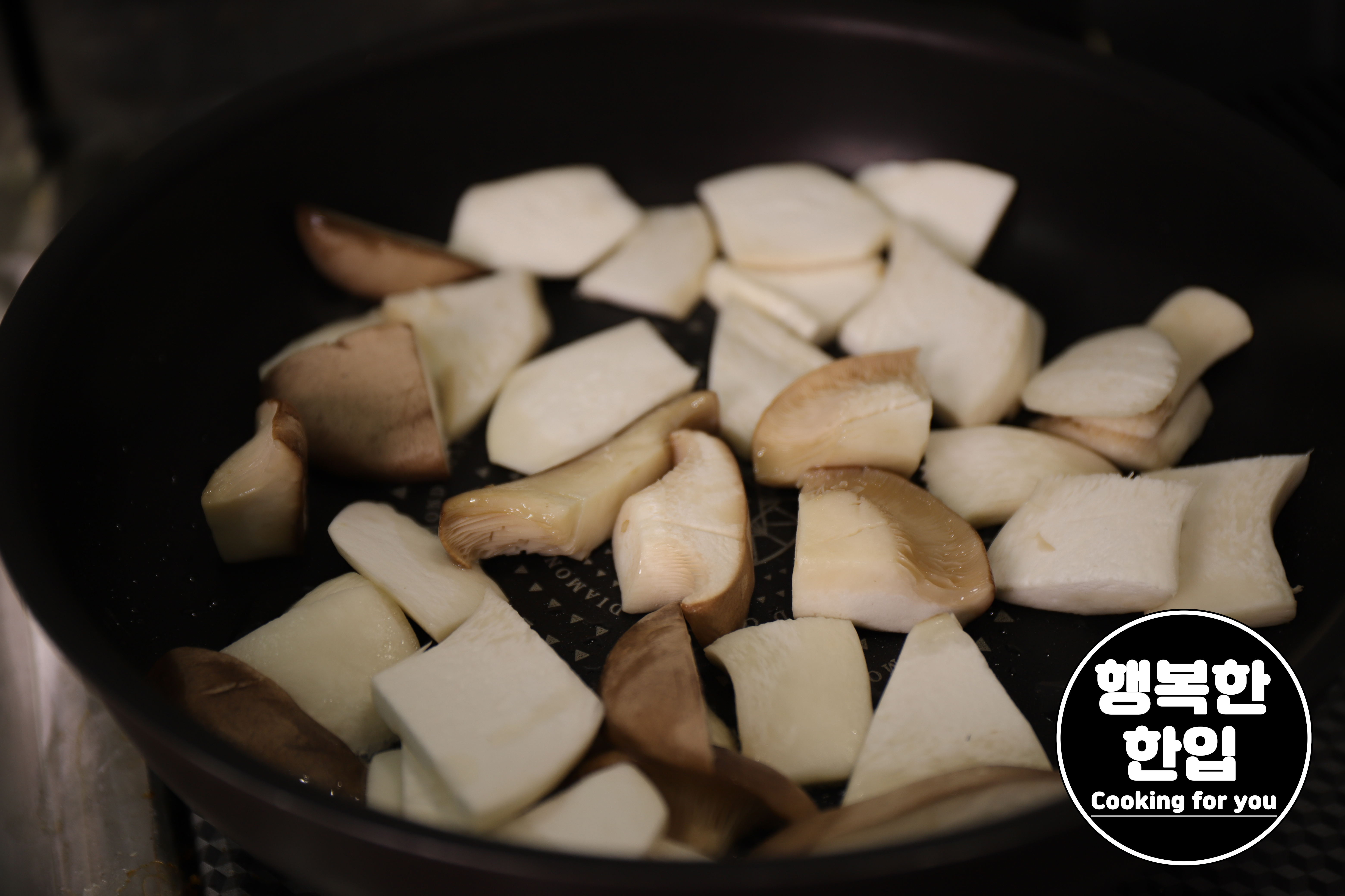 달구어진 프라이팬에 식용유를 적당히 두르고 준비한 새송이버섯을 볶아줍니다.