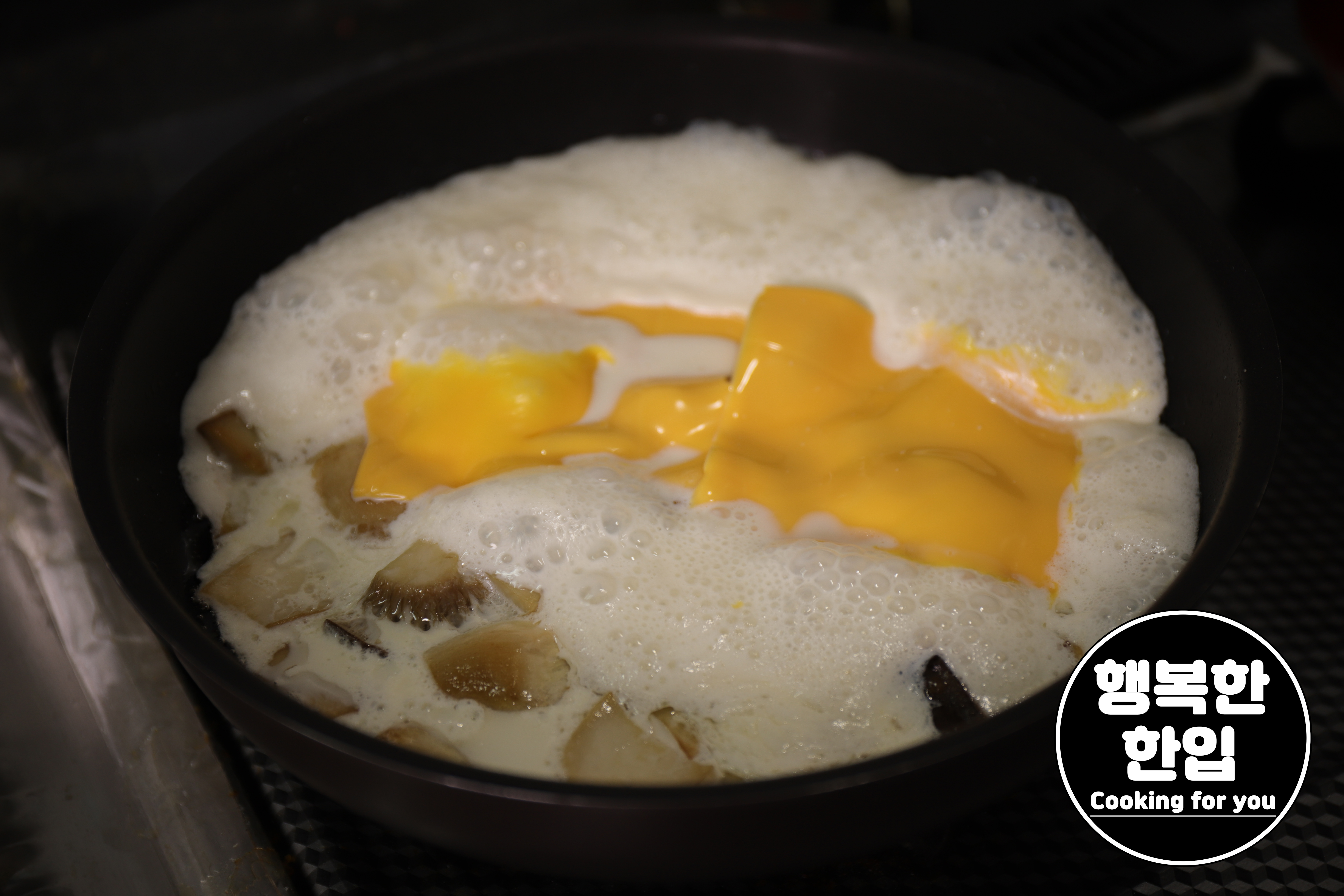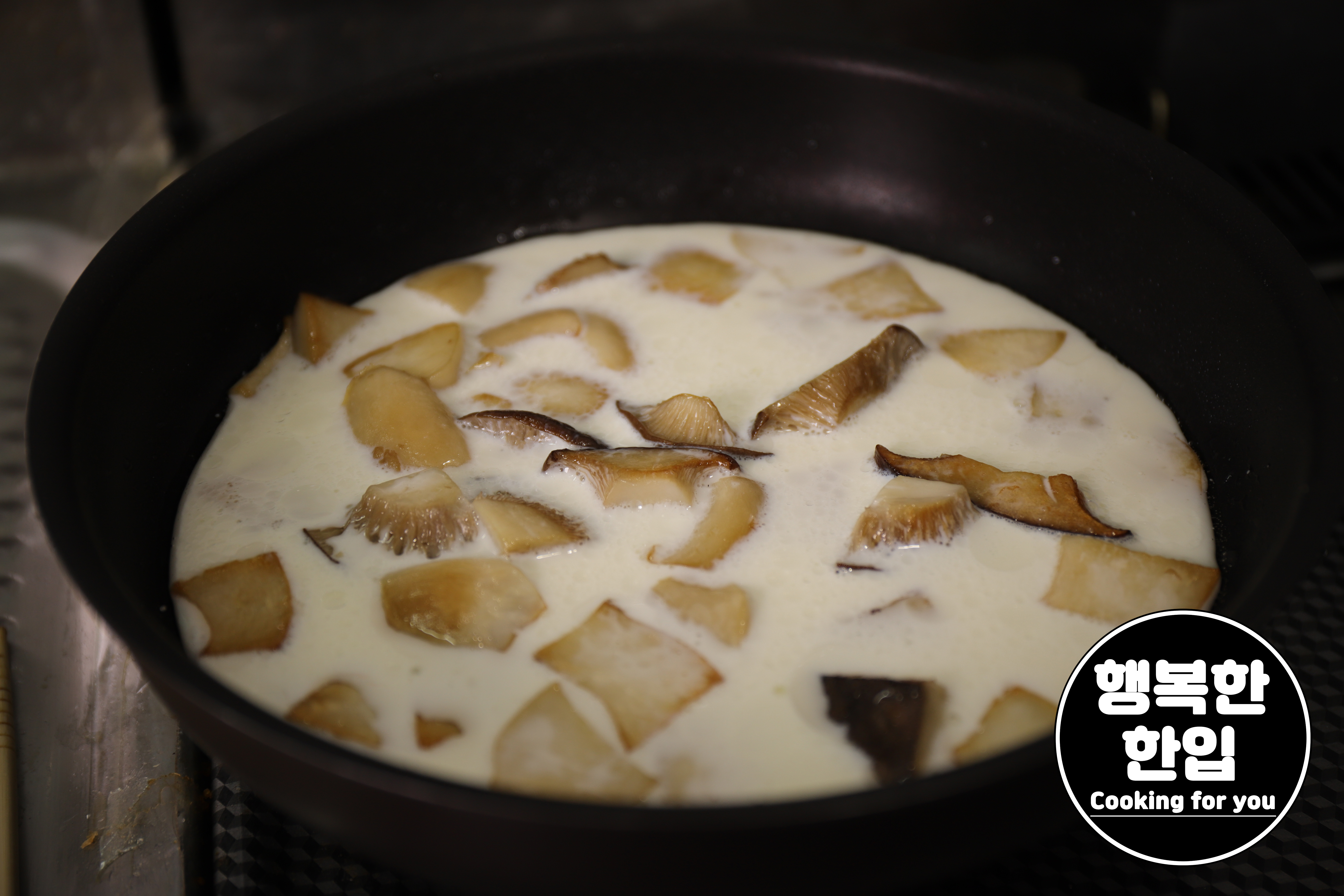 새송이버섯이 노르스름 잘 구워지면 우유를 100ml ~ 150ml정도 부어서 끓여주세요.