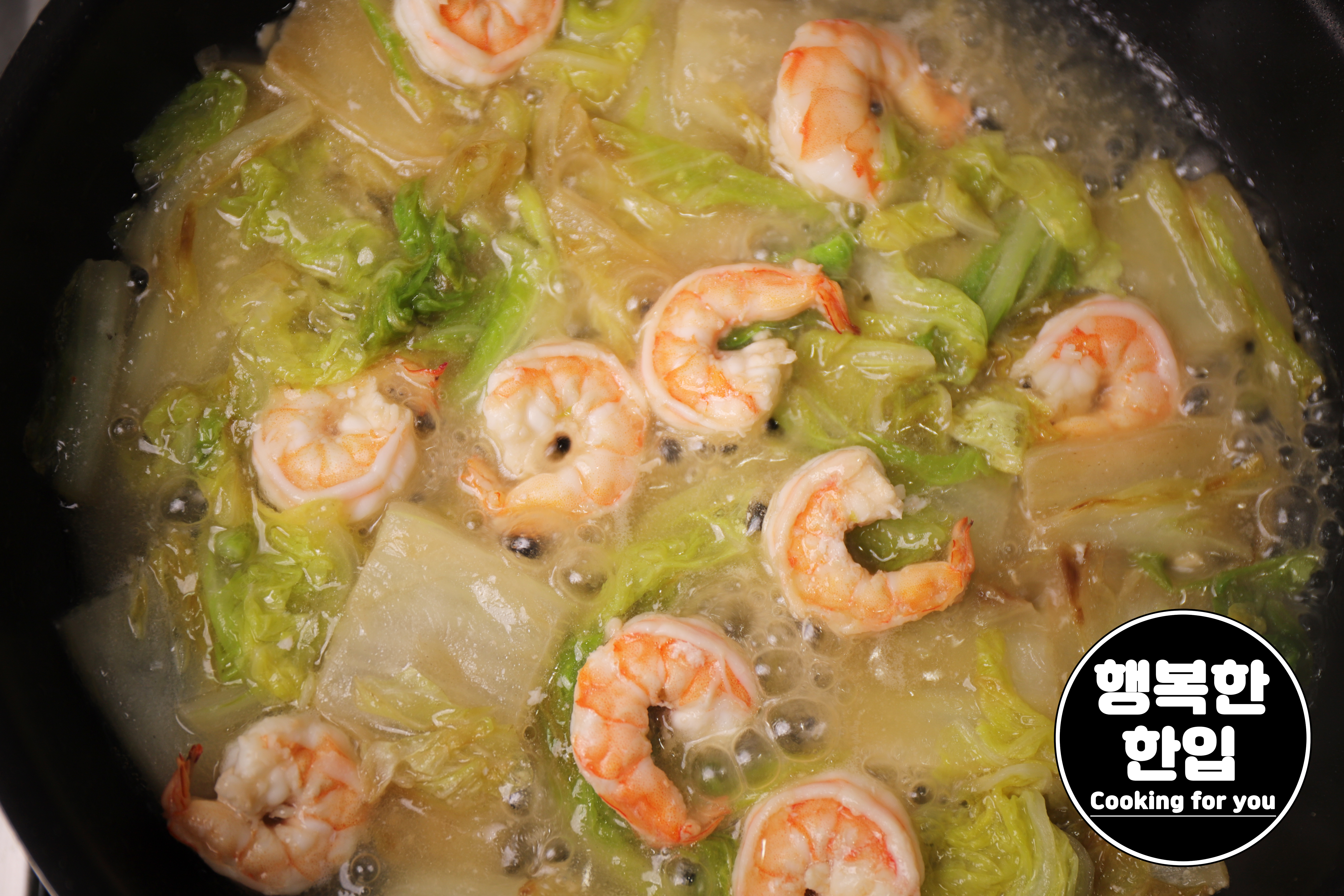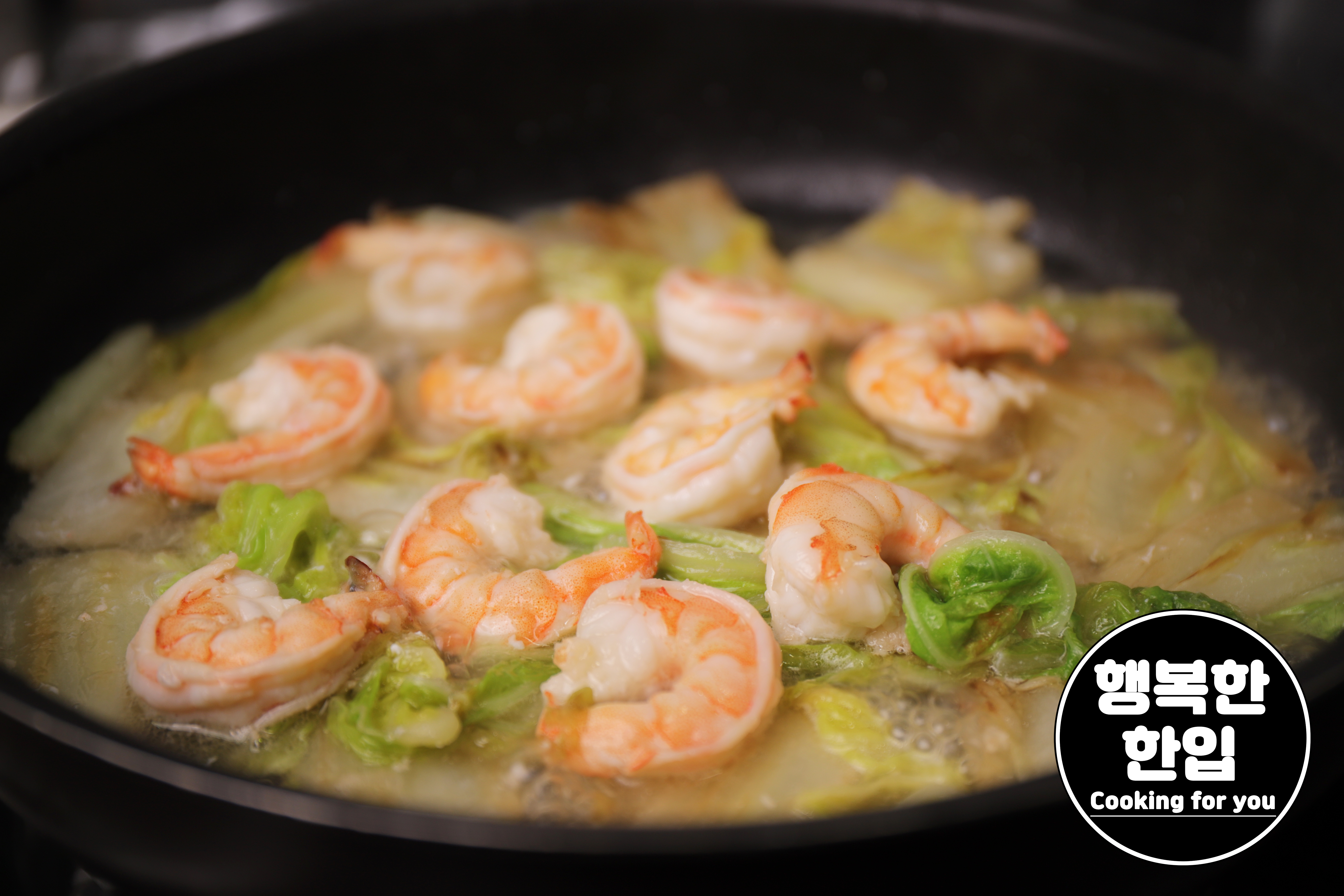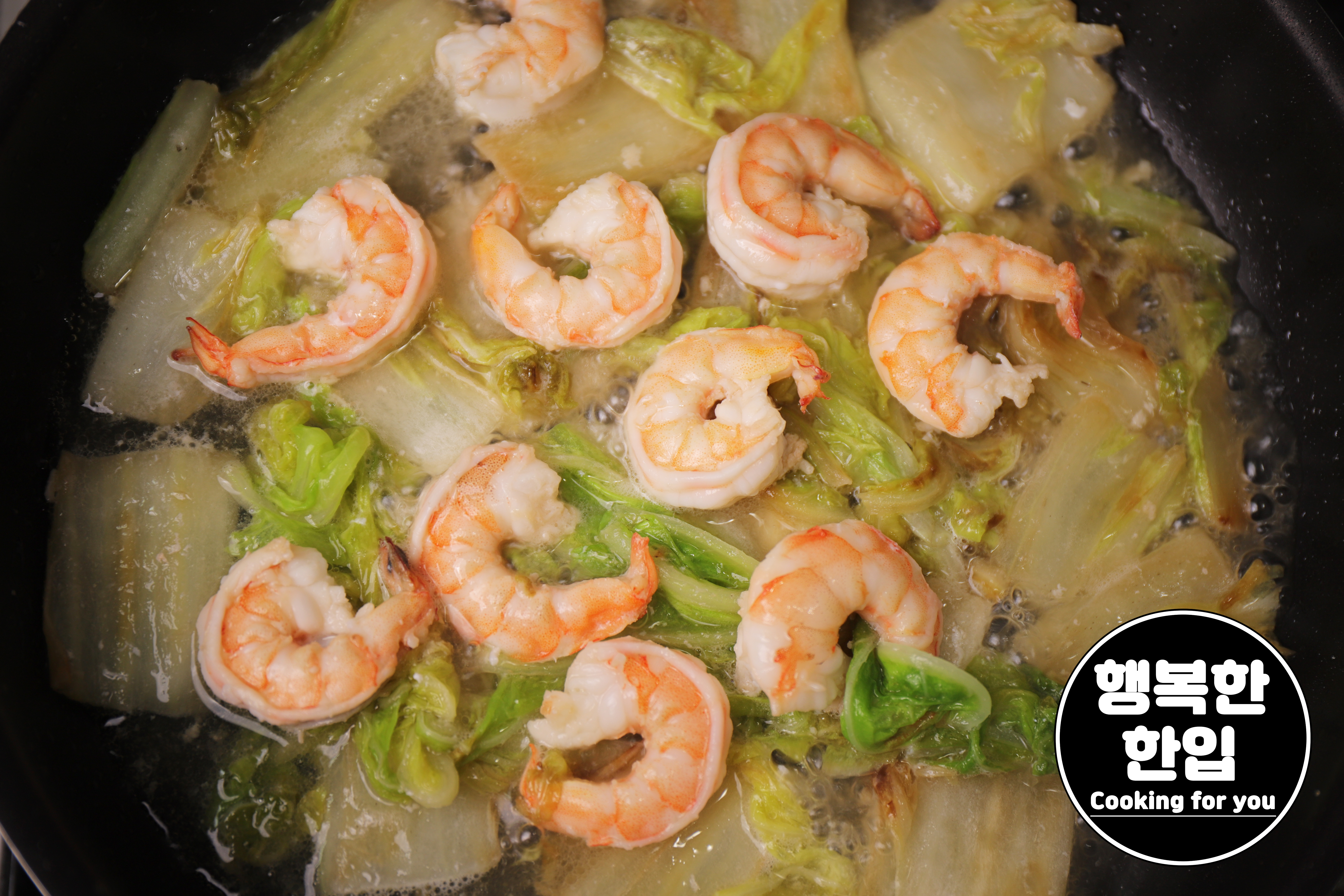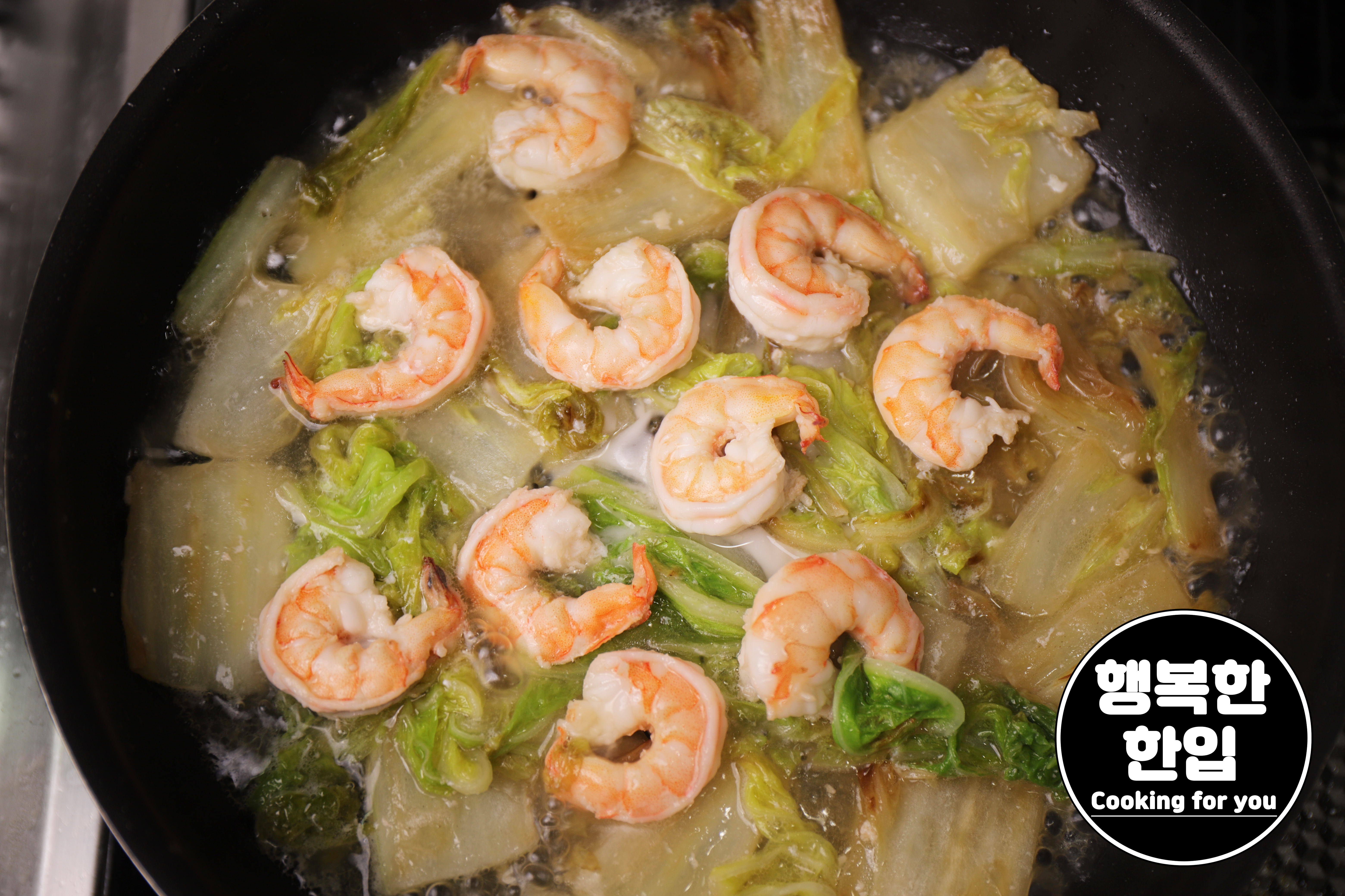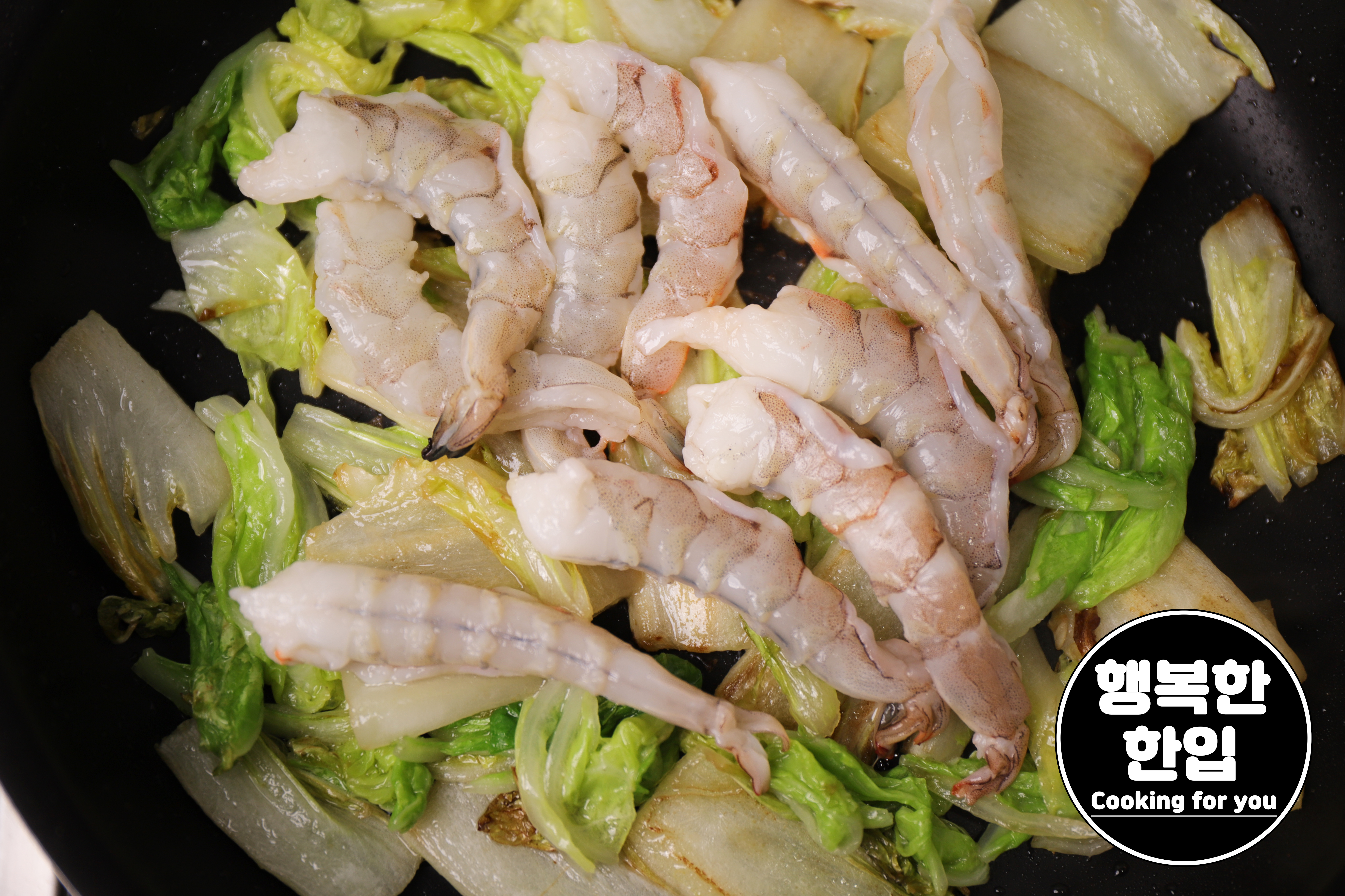배추가 노르스름 해지면 준비한 새우를 추가해서 함께 볶아주세요.