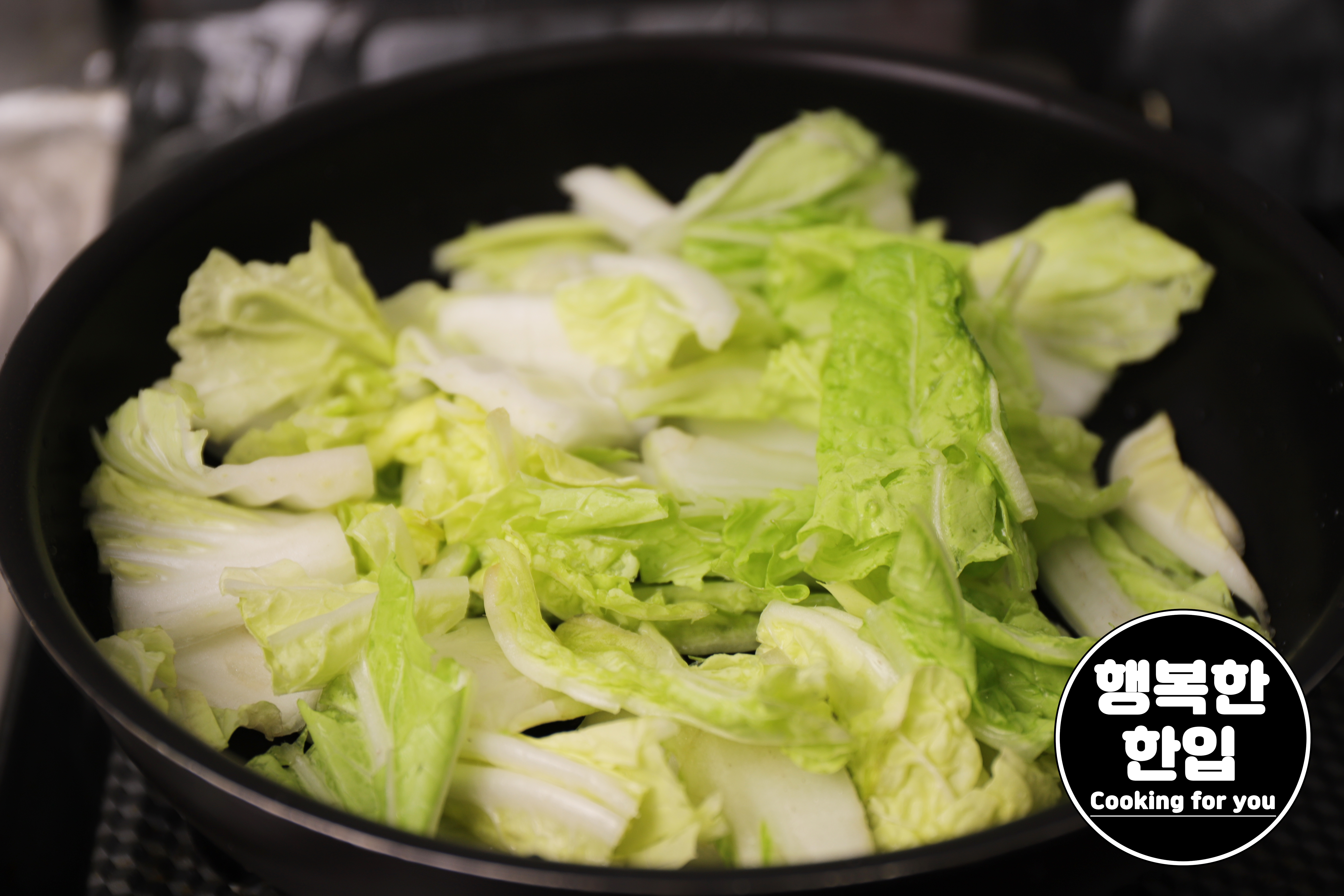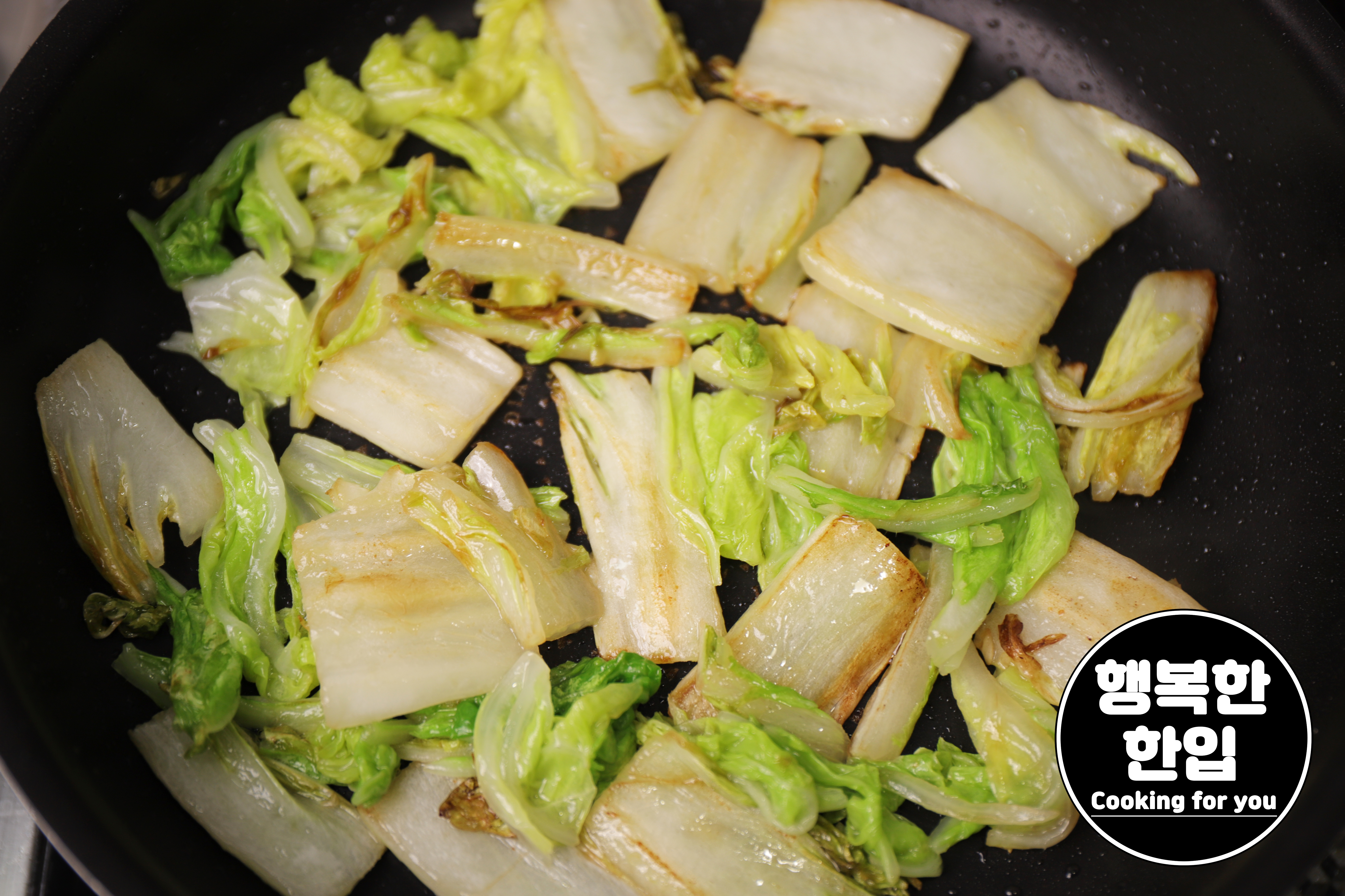 프라이팬에 식용유를 적당히 두르고 중간 보다 조금 약한불에서 배추를 볶아주세요.