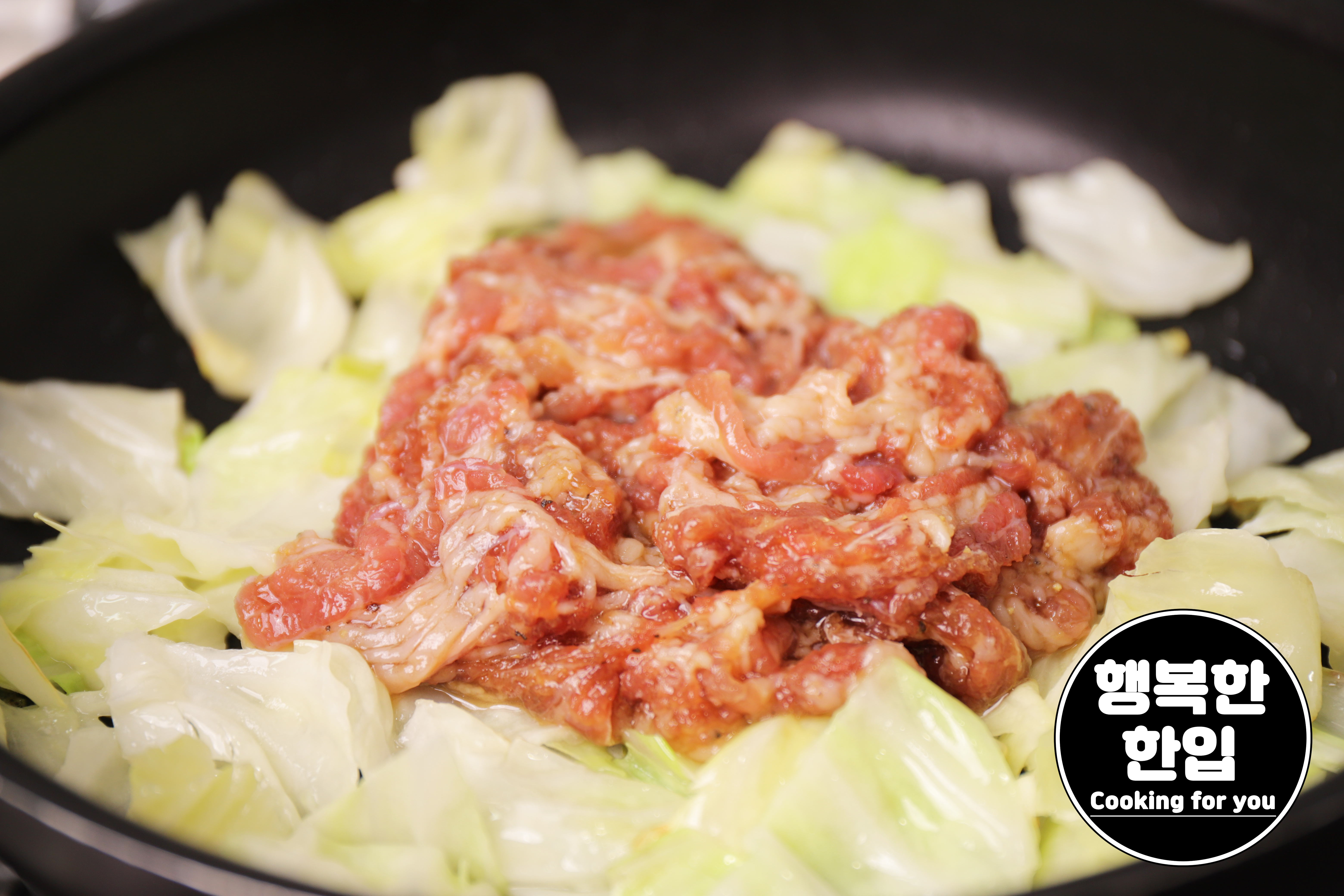 양배추에 윤기가 생기면 고기를 함께 볶아주세요.
