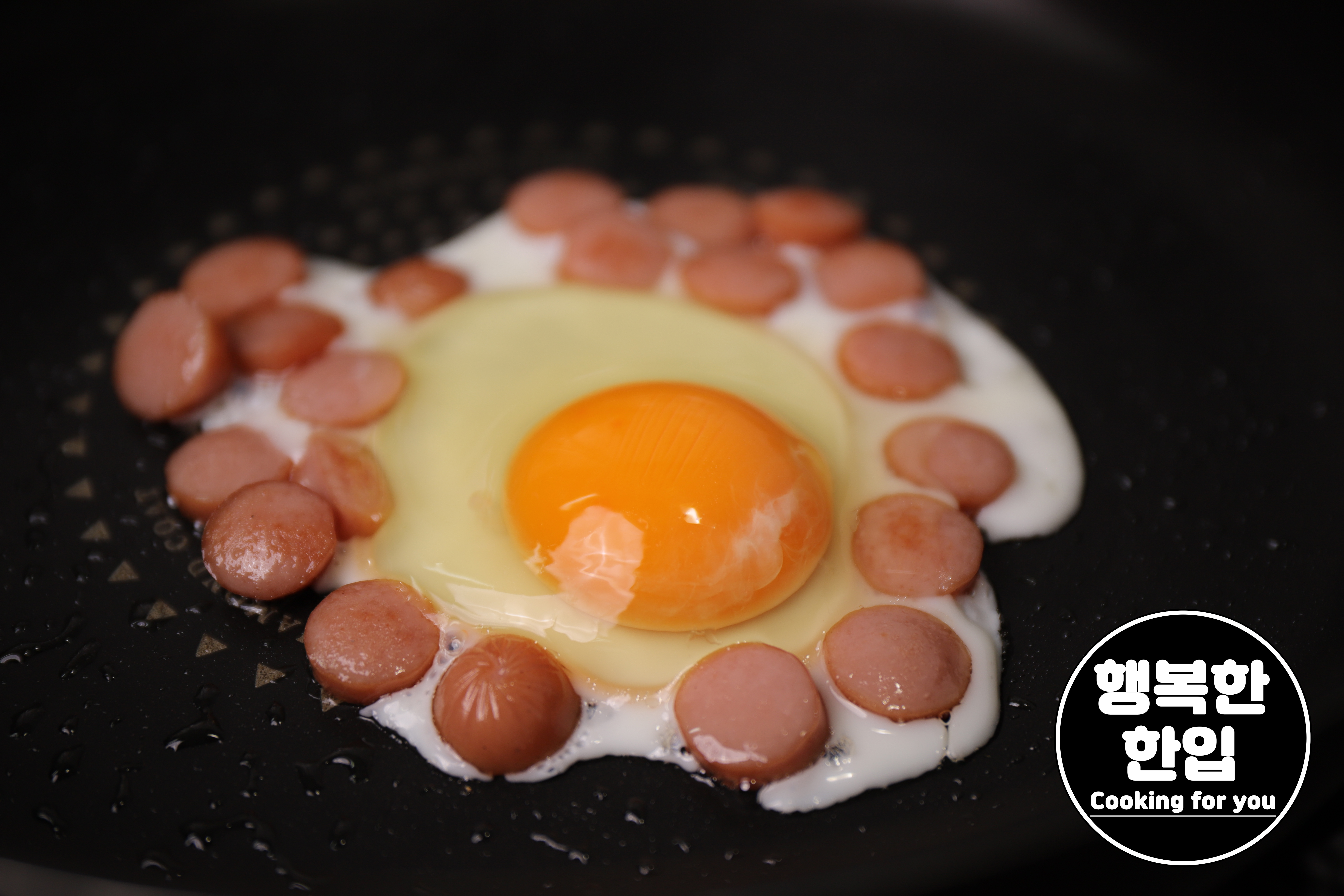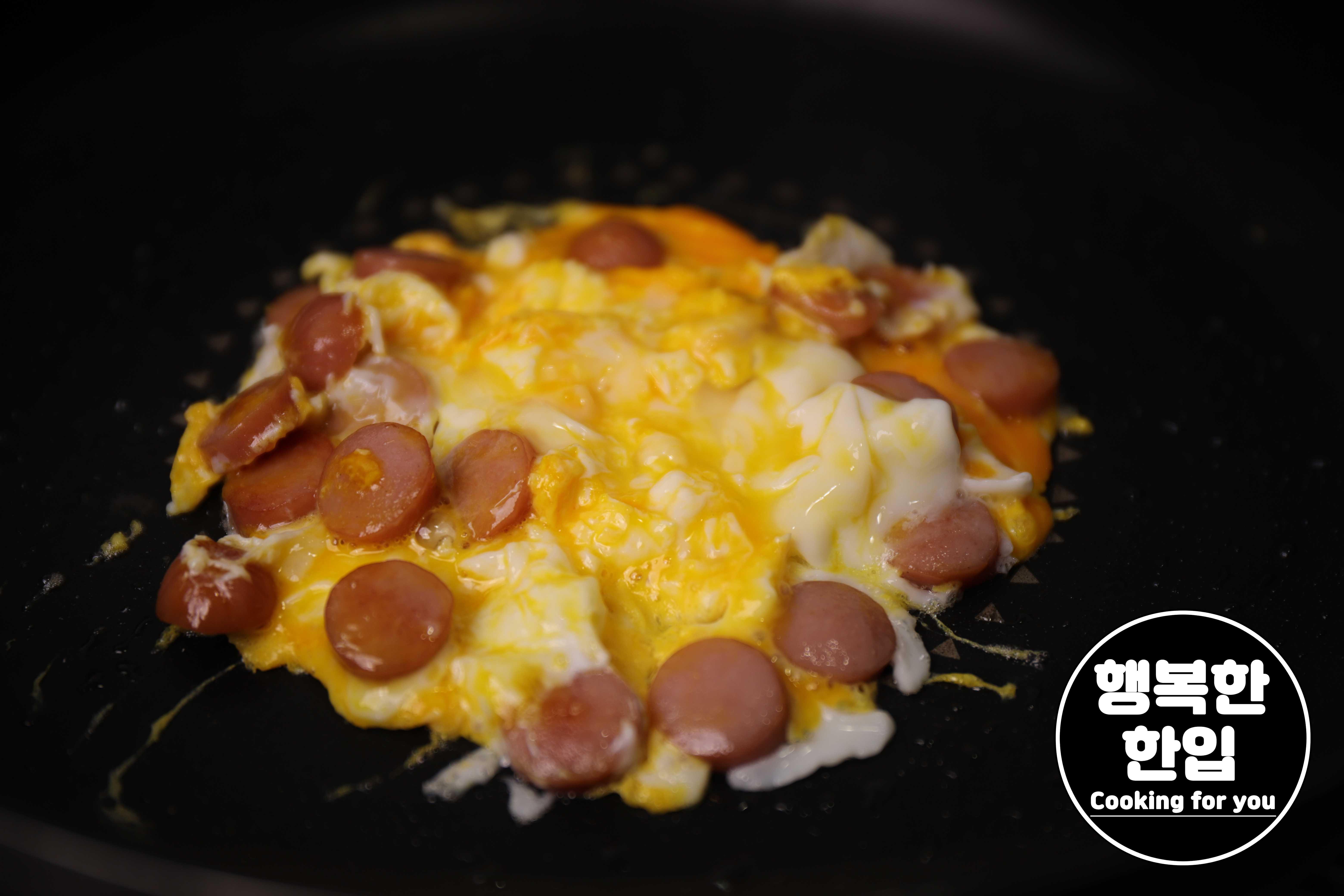 소시지가 적당히 구워지면 계란 하나 추가해서 약불로 함께 볶아줍니다.