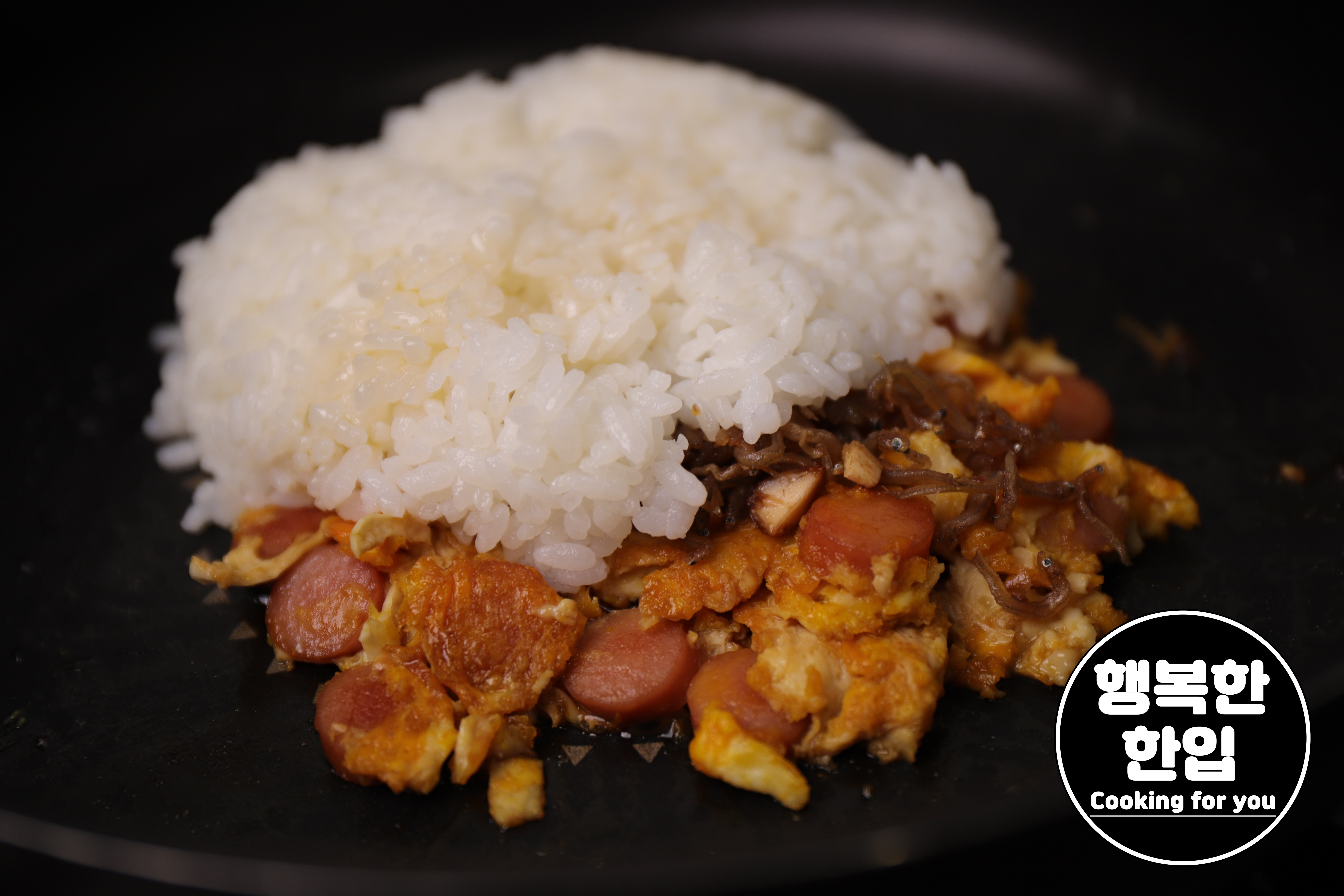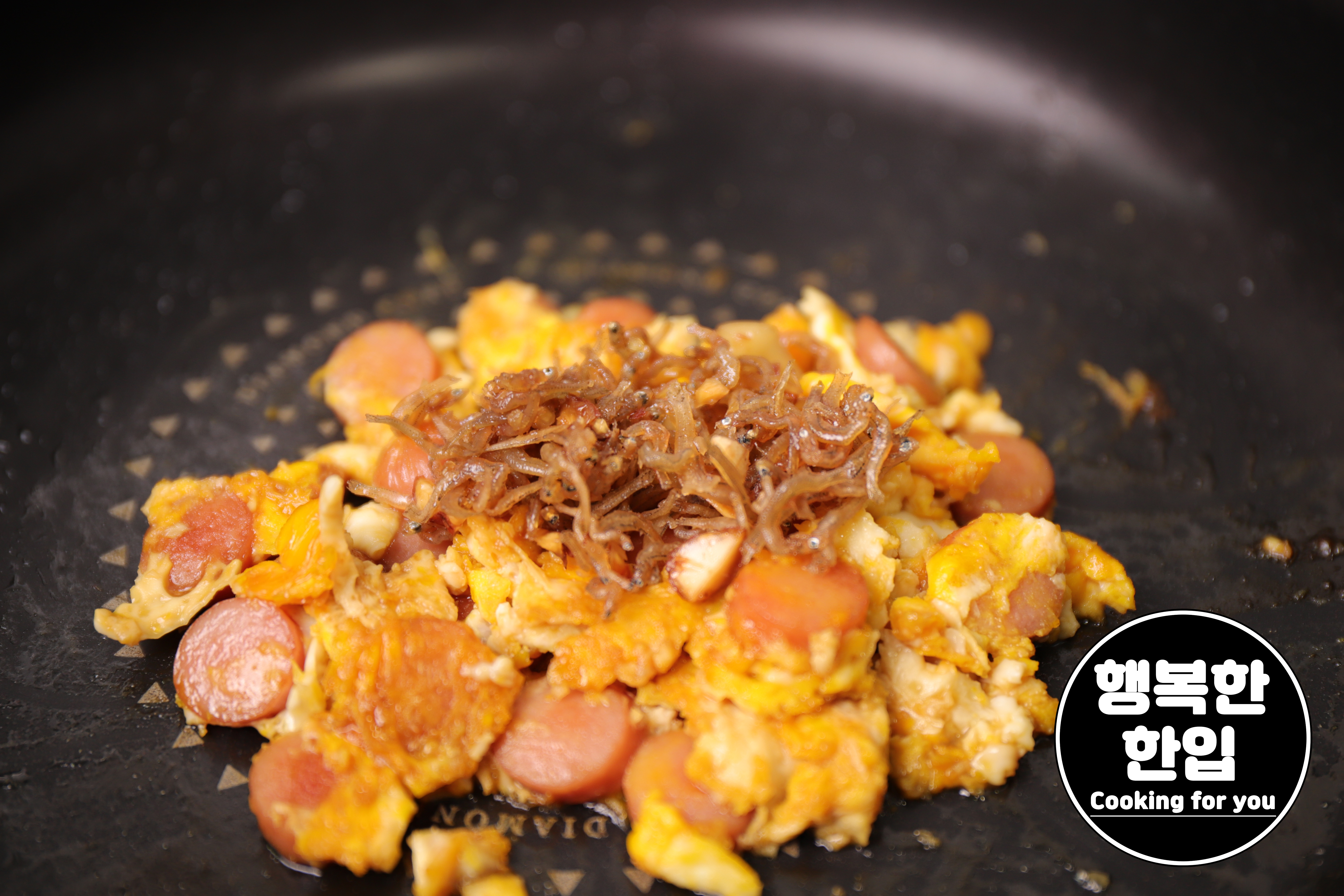 계란이 다 익으면 가스불을 끈 후 멸치볶음 1스푼과 밥을 추가해주세요.