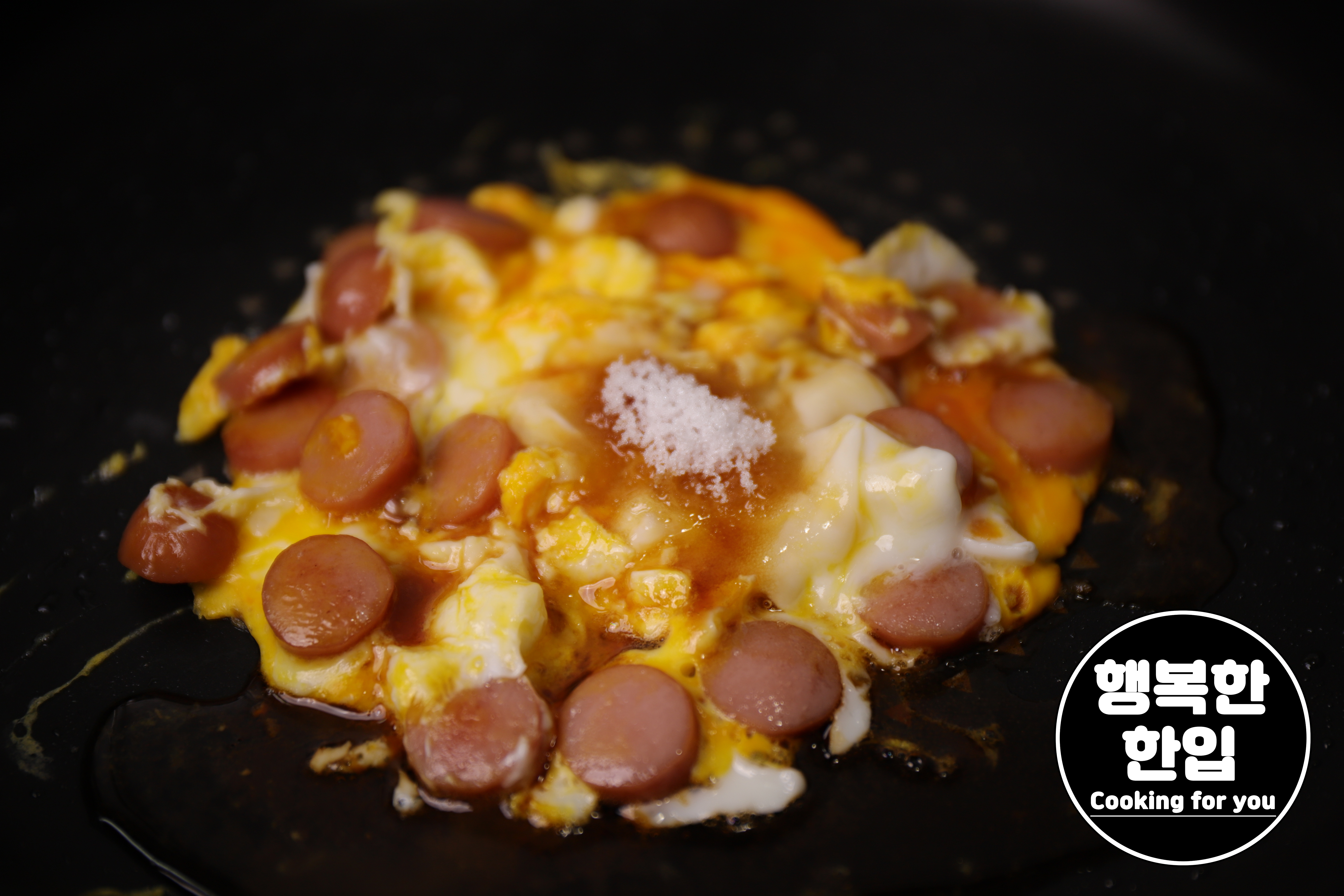 계란이 1/2정도 익으면 간장 1스푼과 설탕 1/2스푼을 넣고 다시 볶아주세요.
