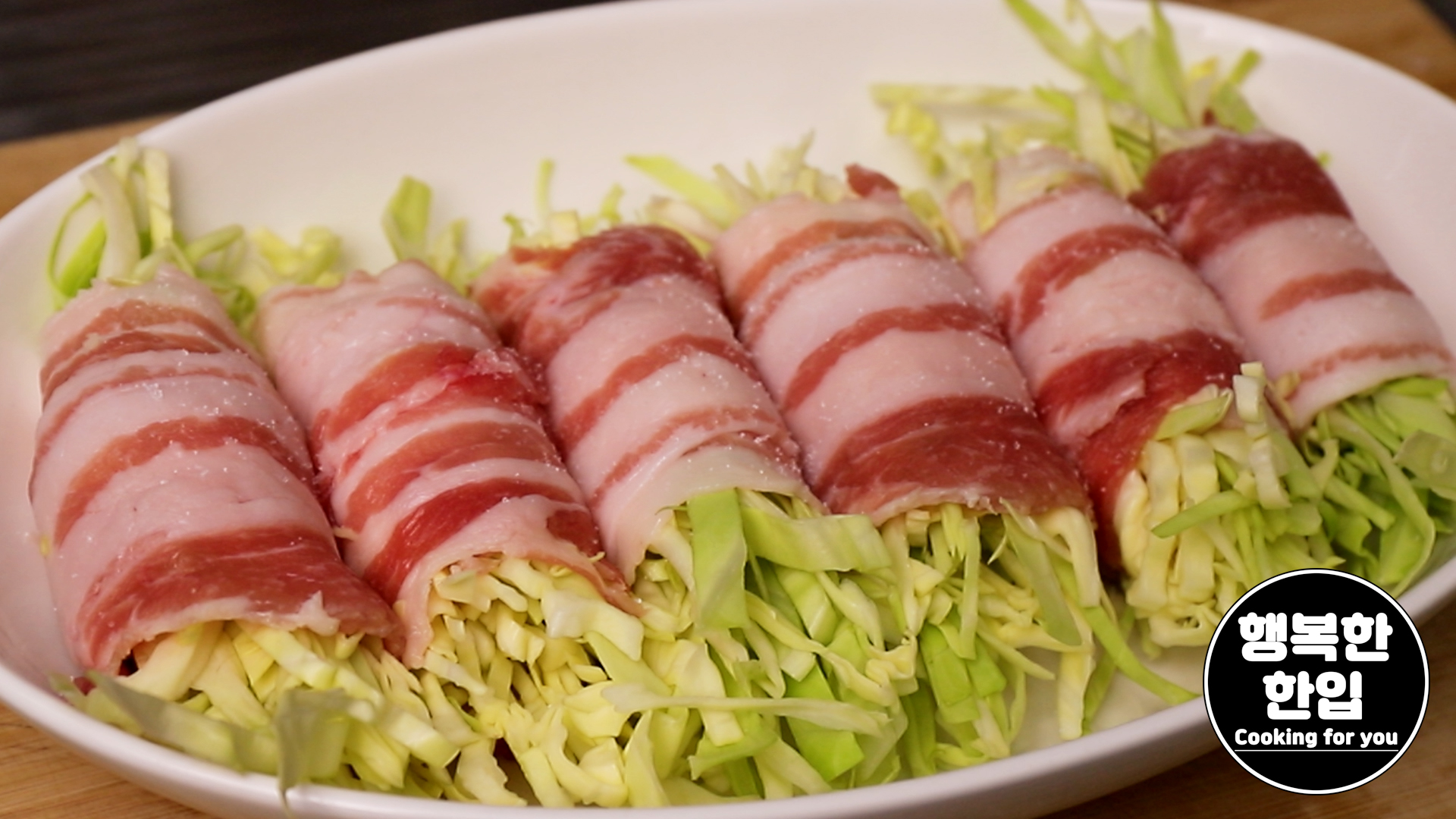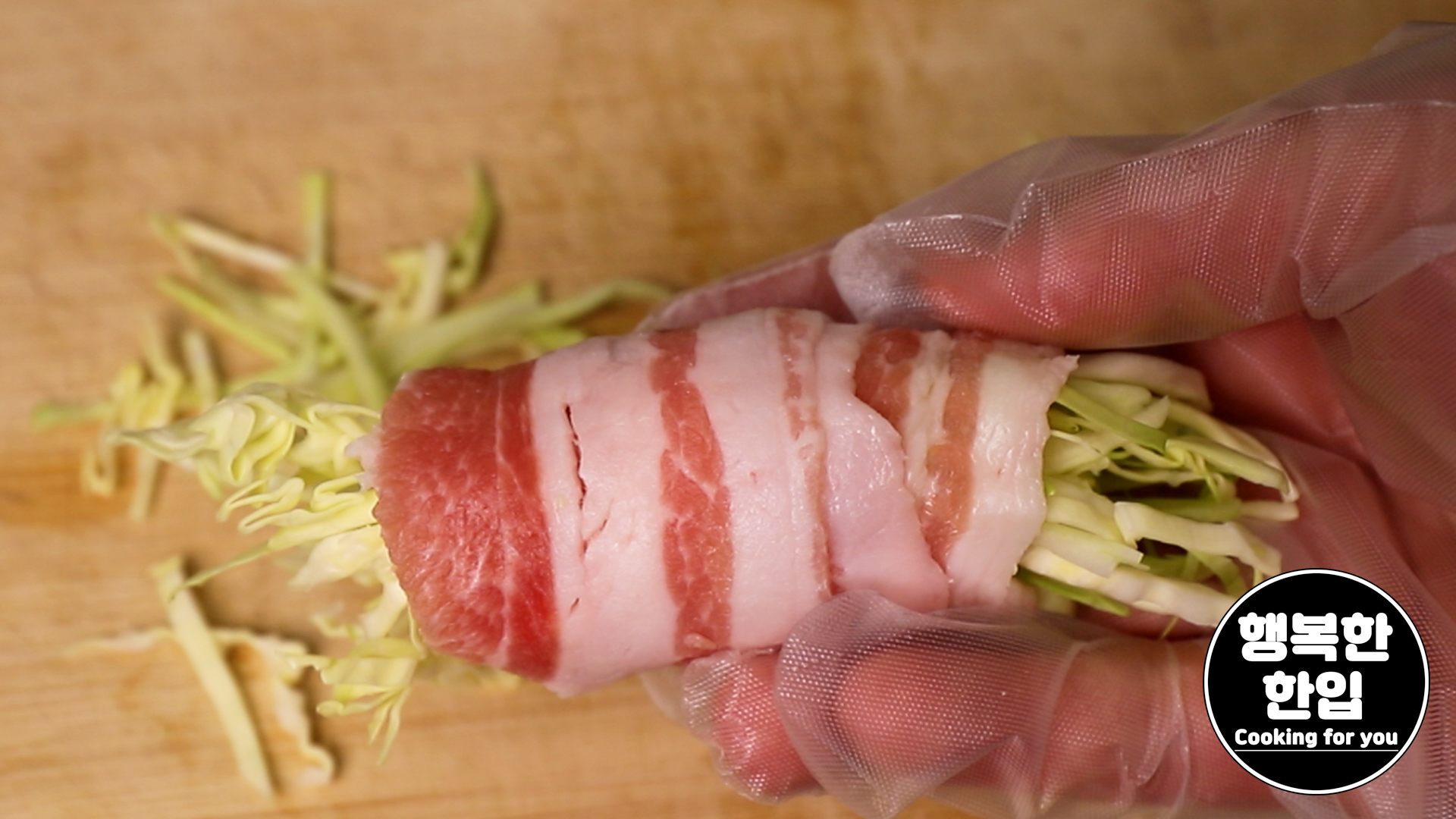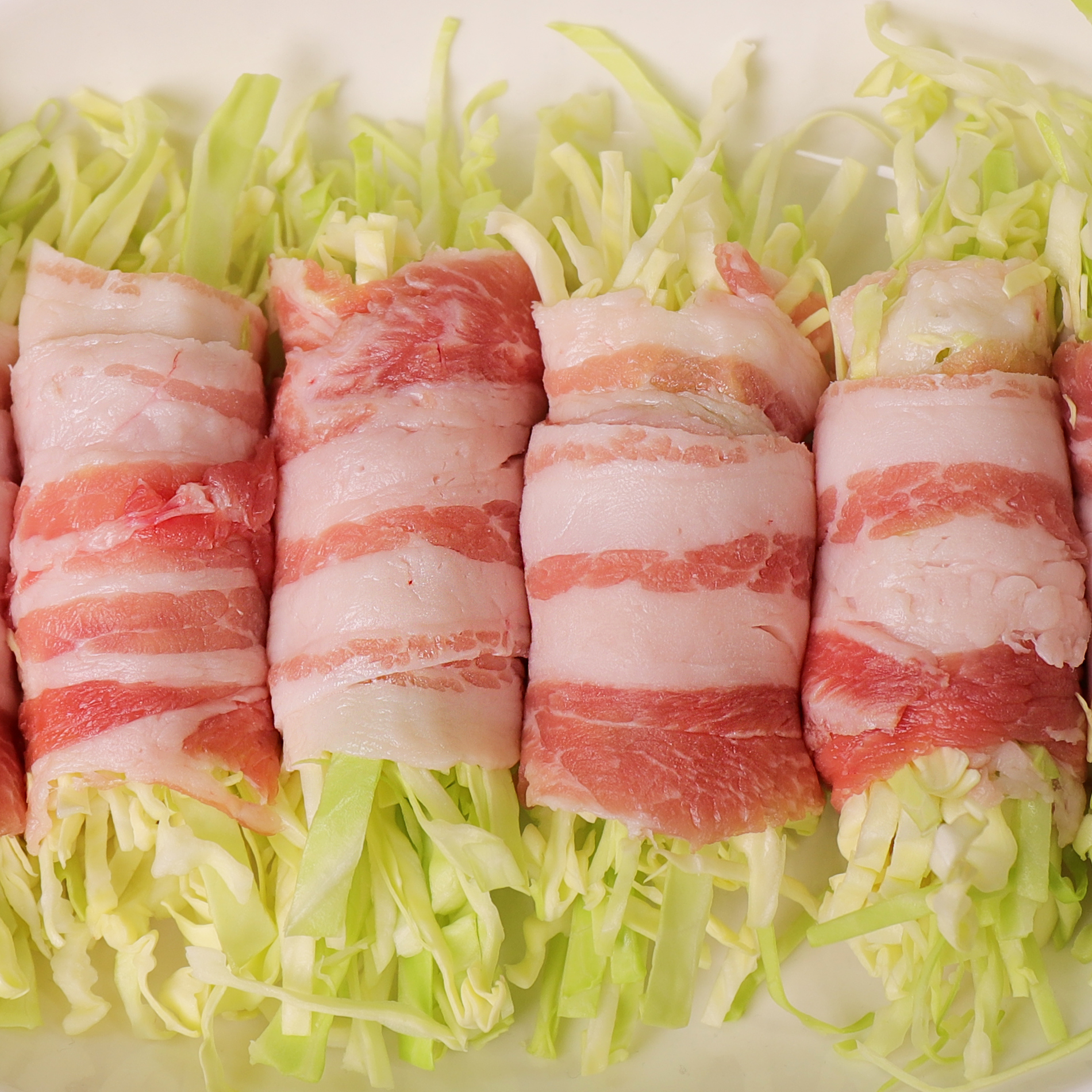 얇은 삼겹살을 깔고 그 위에 양배추를 적당히 올려서 말아주세요.
